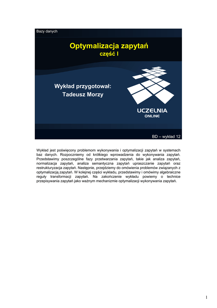 Bazy danych Optymalizacja zapytań część I Wykład przygotował: Tadeusz Morzy BD – wykład 12 Wykład jest poświęcony problemom wykonywania i optymalizacji zapytań w systemach baz danych. Rozpoczniemy od krótkiego wprowadzenia do wykonywania zapytań. Przedstawimy poszczególne fazy przetwarzania zapytań, takie jak analiza zapytań, normalizacja zapytań, analiza semantyczna zapytań upraszczanie zapytań oraz restrukturyzacja zapytań. Następnie, przejdziemy do omówienia problemów związanych z optymalizacją zapytań. W kolejnej części wykładu, przedstawimy i omówimy algebraiczne reguły transformacji zapytań. Na zakończenie wykładu powiemy o technice przepisywania zapytań jako ważnym mechanizmie optymalizacji wykonywania zapytań. 1 Bazy danych Fazy przetwarzania zapytania zapytanie SQL dekompozycja zapytania wyrażenie algebry relacji optymalizacja zapytania plan wykonania zapytania Katalog systemowy Statystyki bazy danych generacja kodu kod zapytania wykonanie zapytania Wynik zapytania Baza danych BD – wykład 12 (2) Proces wykonywania zapytania składa się, najogólniej mówiąc, z kilku faz: fazy dekompozycji, fazy optymalizacji zapytania, fazy generacji kodu, oraz fazy wykonania. Zapytanie wyrażone w języku SQL, w fazie dekompozycji, jest transformowane do postaci wyrażenia algebry relacji, umożliwiającej dalsze przetwarzania zapytania. Transformacja zapytania do postaci wyrażenia algebraicznego wymaga dostępu do katalogu bazy danych. W kolejnej fazie, wyrażenie reprezentujące zapytanie jest optymalizowane za pomocą dwóch mechanizmów. Pierwszym jest mechanizm reguł transformacji, który wykorzystując pewien zbiór reguł stara się uprościć zapytanie. Drugim, jest mechanizm optymalizacji kosztowej, który, dla danego wyrażenia, stara się określić optymalny plan wykonania zapytania (m.in. stara się określić optymalne drzewo połączeń). Moduł optymalizatora wykorzystuje w procesie optymalizacji zapytania statystyki, przechowywane w systemie bazy danych, dotyczące relacji, atrybutów i indeksów (rozmiary relacji, liczba stron relacji, liczba różnych wartości atrybutu, itp.). W kolejnym kroku, dla znalezionego planu wykonania zapytania, generowany jest kod zapytania, który jest, następnie, uruchamiany przez tak zwany silnik zapytań (ang. query engine). 2 Bazy danych Dynamiczna vs statyczna optymalizacja zapytań Dynamiczna optymalizacja zapytań zapytań Statyczna optymalizacja zapytań zapytań Optymalizacja pojedynczego zapytania Jednoczesna optymalizacja zbioru zapytań zapytań BD – wykład 12 (3) Zanim przejdziemy do przedstawienia i omówienia poszczególnych faz przetwarzania zapytania, wprowadzimy i omówimy krótko klasyfikację metod optymalizacji zapytań. Istnieje wiele klasyfikacji metod optymalizacji zapytań. Pierwsza z podanych klasyfikacji wyróżnia optymalizację statyczną i optymalizację dynamiczną. Optymalizacja statyczna polega na znalezieniu „najlepszego” planu wykonania zapytania, przed rozpoczęciem wykonywania zapytania. W trakcie realizacji zapytania plan wykonania zapytania nie ulega już zmianie – stąd nazwa optymalizacja statyczna. Optymalizacja dynamiczna polega na znalezieniu „najlepszego” planu wykonania zapytania, przed rozpoczęciem wykonywania zapytania, ale później, w trakcie wykonywania zapytania jego plan wykonania może ulęgać zmianie. Aktualnie, komercyjne systemy baz danych zapewniają jedynie optymalizację statyczna, choć efektywność takiej optymalizacji jest najczęściej niższa aniżeli efektywność optymalizacji dynamicznej. Optymalizacja dynamiczna jest jednak znacznie bardziej kosztowna. Druga z podanych klasyfikacji wyróżnia optymalizację pojedynczego zapytania oraz jednoczesną optymalizację wielu zapytań. W przypadku optymalizacji pojedynczego zapytania, optymalizacji podlega tylko jedno zapytanie. W przypadku jednoczesnej optymalizacji wielu zapytań, częściowe wyniki wykonania jednego zapytania mogą być wykorzystane przez wiele innych zapytań, co prowadzi do minimalizacji czasu wykonania zbioru zapytań. W chwili obecnej systemy komercyjnych baz danych zapewniają jedynie optymalizację pojedynczego zapytania. 3 Bazy danych Proces optymalizacji zapytań • Transformacja zapytania SQL do postaci drzewa wyrażenia logicznego: – Identyfikacja bloków zapytania (odpowiadających zagnieżdżonym zapytaniom lub perspektywom) • Faza przepisywania zapytania: – Zastosowania transformacji algebraicznych w celu uzyskania tańszego planu wykonania zapytania • Optymalizacja bloku: zdefiniowania porządku wykonywania operacji połączenia • Zakończenie optymalizacji: wybór uszeregowania BD – wykład 12 (4) Jak już wspomnieliśmy, pierwszą fazą przetwarzania zapytań jest faza transformacji zapytania SQL do postaci drzewa wyrażenia logicznego: Celem tej fazy jest również identyfikacja bloków zapytania (odpowiadających zagnieżdżonym zapytaniom lub perspektywom). W kolejnym kroku realizowana jest faza przepisywania zapytania za pomocą transformacji algebraicznych w celu uzyskania tańszego planu wykonania zapytania. W konsekwencji uzyskujemy zbiór najlepszych planów wykonania pojedynczych bloków zapytania. Pozostaje jeszcze problem połączenia bloków, w szczególności, problem zdefiniowania porządku wykonywania operacji połączenia. Wybór kolejności wykonywania operacji połączenia, tzn. wybór uszeregowania operacji połączenia, kończy proces optymalizacji zapytania. Obecnie, przejdziemy do przedstawienia poszczególnych faz przetwarzania zapytań. 4 Bazy danych Dekompozycja zapytania • Dekompozycja zapytania: celem procesu dekompozycji zapytania jest transformacja zapytania wyrażonego w języku wysokiego poziomu na wyrażenie algebry relacji i weryfikacja syntaktycznej i semantycznej poprawności zapytania • Etapy procesu dekompozycji zapytania: – Analiza zapytań – normalizacja zapytań – analiza seman