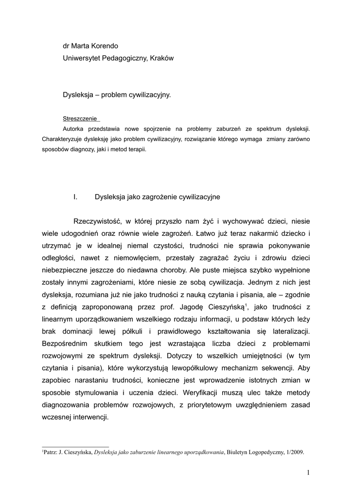 dr Marta Korendo Uniwersytet Pedagogiczny, Kraków Dysleksja – problem cywilizacyjny. Streszczenie Autorka przedstawia nowe spojrzenie na problemy zaburzeń ze spektrum dysleksji. Charakteryzuje dysleksję jako problem cywilizacyjny, rozwiązanie którego wymaga zmiany zarówno sposobów diagnozy, jaki i metod terapii. I. Dysleksja jako zagrożenie cywilizacyjne Rzeczywistość, w której przyszło nam żyć i wychowywać dzieci, niesie wiele udogodnień oraz równie wiele zagrożeń. Łatwo już teraz nakarmić dziecko i utrzymać je w idealnej niemal czystości, trudności nie sprawia pokonywanie odległości, nawet z niemowlęciem, przestały zagrażać życiu i zdrowiu dzieci niebezpieczne jeszcze do niedawna choroby. Ale puste miejsca szybko wypełnione zostały innymi zagrożeniami, które niesie ze sobą cywilizacja. Jednym z nich jest dysleksja, rozumiana już nie jako trudności z nauką czytania i pisania, ale – zgodnie z definicją zaproponowaną przez prof. Jagodę Cieszyńską1, jako trudności z linearnym uporządkowaniem wszelkiego rodzaju informacji, u podstaw których leży brak dominacji lewej półkuli i prawidłowego kształtowania się lateralizacji. Bezpośrednim skutkiem tego jest wzrastająca liczba dzieci z problemami rozwojowymi ze spektrum dysleksji. Dotyczy to wszelkich umiejętności (w tym czytania i pisania), które wykorzystują lewopółkulowy mechanizm sekwencji. Aby zapobiec narastaniu trudności, konieczne jest wprowadzenie istotnych zmian w sposobie stymulowania i uczenia dzieci. Weryfikacji muszą ulec także metody diagnozowania problemów rozwojowych, z priorytetowym uwzględnieniem zasad wczesnej interwencji. Patrz: J. Cieszyńska, Dysleksja jako zaburzenie linearnego uporządkowania, Biuletyn Logopedyczny, 1/2009. 1 1 II. Praktyka diagnostyczna Uwagę osób zajmujących się problemem dysleksji zwrócić musi także kwestia sposobu i czasu diagnozy. Niepokojącą normą jest nadal diagnozowanie dysleksji najwcześniej w czwartej klasie szkoły podstawowej. Pociąga to za sobą szereg negatywnych skutków. Do najważniejszych należy niebywale długi czas, jaki problemy rozwojowe zyskują na „inkubację” – mogą spokojnie i bez przeszkód dojrzeć i zaowocować. Owocem tego procesu staje się dysleksja patologicznych mechanizmów poznawczych oraz zachowań z szeregiem utrwalonych prawdopodobnie na zawsze. Trzeba otwarcie powiedzieć, że skuteczna terapia rozpoczynana w piątej klasie właściwie nie jest możliwa. I nie chodzi jedynie o problemy z czytaniem i pisaniem (ocenianym najczęściej przez pryzmat ortografii i czytelności zapisu), ale o szereg głęboko zakorzenionych mechanizmów obronnych stosowanych w codziennych sytuacjach życiowych oraz wtórne oddziaływanie problemów dyslektycznych na osobowość w postaci negatywnych cech nazywanych lenistwem (będącym często unikaniem robienia tego, czego „nie umiem i nie lubię”), biernością, brakiem inicjatywy, przebojowości, ambicji. Skuteczną diagnozę dysleksji postawić można w pierwszym roku zinstytucjonalizowanej nauki szkolnej, dużo wcześniej (od 3. roku życia) możemy mówić o zagrożeniu dysleksją. Przekraczanie bezpiecznych dla terapii granic czasowych obniża skuteczność proponowanych oddziaływań. Podobny problem dotyczy metod diagnostycznych, które zbyt często jeszcze opierają się na analizowaniu skutków, a nie szukaniu przyczyn. Zakładają tym samym czekanie na pojawienie się owych skutków oraz konieczność długotrwałej obserwacji. Tymczasem wiedza o mózgowych mechanizmach rozwoju języka oraz patogenezie dysleksji pozwala czas diagnozy skrócić do jednego spotkania bez konieczności wielomiesięcznych obserwacji. III. Zeszyty ćwiczeń w poradniach Z praktyką wielomiesięcznych obserwacji diagnostycznych wiąże się, obowiązujący ciągle jeszcze w wielu miejscach, zwyczaj prowadzenia przez dzieci zeszytów umożliwiających sprawdzanie systematyczności pracy w domu. Niektóre 2 poradnie wymagają tej formy pracy jako podstawy do wydania orzeczenia o dysleksji, mającej jakoby wykluczyć przypadki stwierdzania dysleksji u dzieci leniwych. Tymczasem taka forma pracy nie tylko w żaden sposób nie pomaga w procesie diagnozy, ale dodatkowo zniechęca dziecko do proponowanych form ćwiczeń, powodując wzrost frustracji, niechęci, spadek motywacji do działania, co skutkuje najczęściej wycofaniem się z działania i zachowaniami, które interpretować można właśnie jako „lenistwo”. W ten sposób podejrzewana przyczyna staje się osiągniętym skutkiem. IV. Nauka ortografii przez reguły Wycofanie zeszytów pracy jest konieczne z jeszcze jednego ważnego powodu, a mianowicie – wiedzy o możliwościach przyswajania reguł przez osoby dyslektyczne. Otóż informacje o sposobach pracy lewej i prawej półkuli mózgu pozwalają zrozumieć, dlaczego osoby prawopółkulowe nie mogą nauczyć się ortografii poprzez przyswajanie zasad. Możliwość taką (o ile w ogóle jest skuteczna) dawałaby jedynie przewaga lewej półkuli w funkcjach mowy. To ona bowiem warunkuje rozumienie reguł językowych. Osoby prawopółkulowe nie są w stanie przyswoić definicji i zasad oraz wykorzystać tę wiedzę podczas budowania wypowiedzi. Stąd wysoce nieskuteczne (nawet po utrwaleniu umiejętności szybko zanikają w sytuacjach braku systematycznych powtórzeń) okazują się metody nauki ortografii poprzez pamięciowe opanowanie regułek. Wiedza ta wymaga więc zmiany podejścia do sposobów diagnozy dzieci oraz zapamiętywania poprawności zapisu ortograficznego. Aby ułatwić uczniom to zadanie, należy wykorzystać mechanizmy globalnego, prawopółkulowego zapamiętywania, przypominającego „fotografowanie” słowa. Ta technika (często nieświadomie wykorzystywana również u osób bez dysleksji, które patrząc na dwie formy zapisu, wybierają tę, która lepiej wygląda, czyli została utrwalona jako obraz) pozwala dzieciom zniwelow