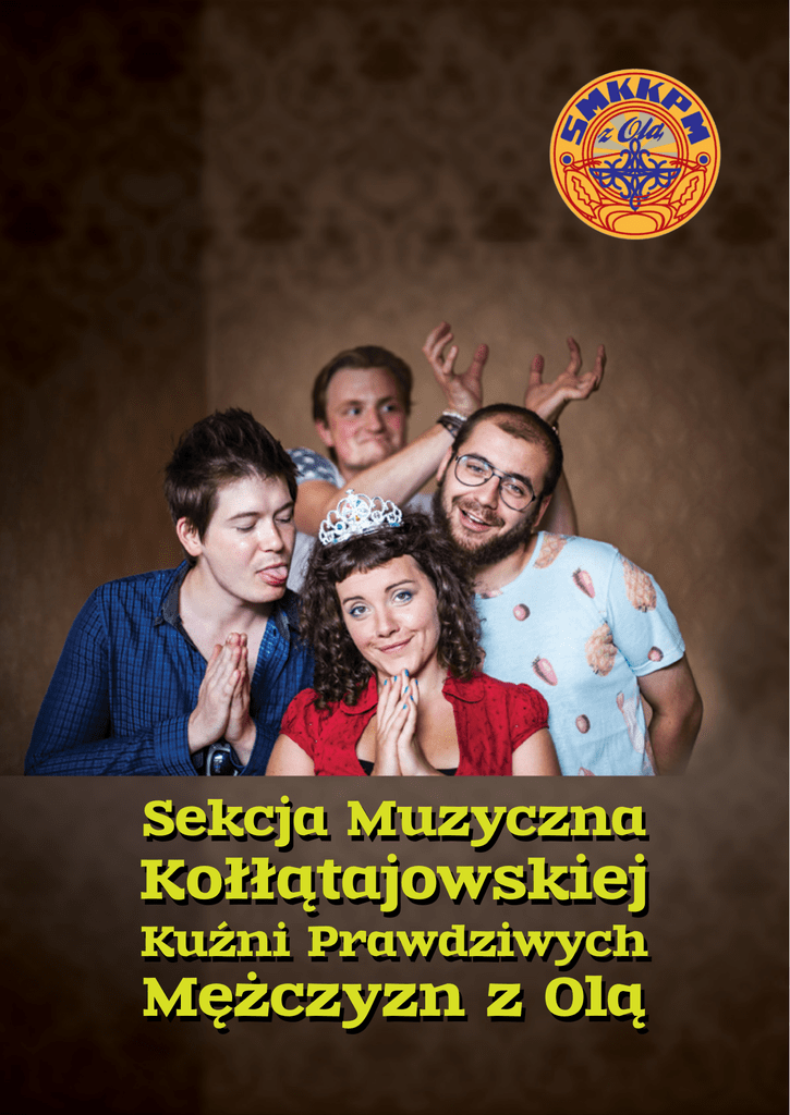 Sekcja Muzyczna Kołłątajowskiej Kuźni Prawdziwych Mężczyzn z Olą SMKKPMzO to... Połączenie muzyki i żartu czyli wyjątkowy kolektyw muzyczno-kabaretowy. Łącząc bezpretensjonalny dowcip z naturalną fantazją, śpiewem, a nawet absurdalną poezją czy czarnym humorem wytworzył już swój własny, rozpoznawalny styl. Kuźnia słynie z dobrych tekstów i wyjątkowej atmosfery na swoich koncertach. W repertuarze: piosenki o zwierzętach i miłości przetykane opowieściami o trudach życia, biedzie, rozczarowaniach i o nich samych - prostych ludziach, którym w zasadzie nic nie wyszło. Spotkanie z Kuźnią to śmiech z naszych codziennych dylematów i problemów, śmiech z naszych wad i trudności, które napotykamy. Nagrody i osiągnięcia: XXX PAKA - Uwaga Śpiewamy! (konkurs piosenki) - I miejsce XXX PAKA (Przegląd kabaretów) - III miejsce i nagroda specjalna. XIX MULATKA (Mazurskie Lato Kabaretowe w Ełku) - I miejsce. YAPA 2014 (Przegląd piosenki poetyckiej i studenckiej w Łodzi) - I miejsce, nagroda publiczności, nagroda studenckiego radia Żak). FAMA - dwukrotni (2012/2013) laureaci nagrody imienia Maxa Szoca, (za nieszablonową i kreatywna postawę artystyczną). Wyróżnienia na: XXXV Lidzbarskie Wieczory Humoru i Satyry; Festiwal WROCEK 2013. Od października 2014 na stałe współpracujemy z Akademią Rozrywki - audycją Programu Trzeciego Polskiego Radia. Mieliśmy też przyjemność gościć w programie Dzięki Bogu Już Weekend oraz podczas wakacji z Kabaretem w Szczecinie (realizacja TVP2). Mamy za sobą dziesiątki koncertów w całej Polsce, również na wielu przeglądach i festiwalach (m.in: Art Boom Festiwal, Festiwal kabaretowy SZPAK, festiwal piosenki kabaretowej OSPA, Zacieralia). Występowaliśmy w towarzystwie takich gwiazd jak np. Kabaret Hrabi, Artur Andrus, Leszcze czy Grupa MoCarta. Stale gościmy na Wrocławskim Poligonie Kabaretowym oraz podczasz Szopki czyli spotkaniach Krakowskiego Frontu Kabaretowego. Co oferujemy? Spotkanie z nami to nie tylko spotkanie z piosenką. Oprócz gotowych programów możemy też skonstruować odpowiedni repertuar i scenariusz, przygotowany stosownie do publiczności i zagrać bardziej lirycznie, kabaretowo czy folkowo. Przestrzeń między piosenkami możemy wypełnić słowem tak, aby spotkanie z nami było poważne lub na pojechanym luzie. Dziesiątki koncertów udowodniły, że potrafimy bawić publiczność w każdym wieku. Dlatego zagramy wszędzie, rozkręcając wszystkich bez wyjątku. Może to być impreza plenerowa lub w dowolnym lokalu, a nawet kameralne spotkanie w niekonwencjonalnych warunkach. Możemy dodatkowo: Poprowadzić imprezę. Wymyślić scenariusz spotkania. Napisać specjalny utwór. Zobacz nas: Sprawdź ilu mamy fanów! “Na ułańskie stepy” Dzięki Bogu juz Weekend “Będę gruba” - Lidzbarskie Wieczory Humoru i Satyry “Ciastko” “Świat jest niesprawiedliwy” Poczytaj wywiady z nami: “A potem pojawiła się po prostu Ola...” “Wkładamy kombinezon dystansu i prujemy przez świat..” Powiedzieli o nas: Zdobyli dwukrotnie i dwa razy z rzędu (!) Nagrodę im. Maksa Szoca. Zasłużyli tym samym na miano największych wariatów Festiwalu. Nie wiem, co by było, gdyby ich nie było. Pewnie trzeba by ich wtedy wymyślić. Alicja Sawicka - Dyrektor Programowa Festiwalu FAMA, Świnoujście „Nie wiem skąd się wzięliście, z jakiej jesteście uczelni i jak was wychowano ale czegoś takiego nie widziałem od ponad dwudziestu lat. Proszę was o jedno – żebyście się nigdy nie nauczyli grać i śpiewać, bo wtedy stracicie cały urok”. Andrzej Talkowski – Kabaret Kuzyni, Piwnica Pod Baranami „To co zrobili było zaskakujące właściwie dla wszystkich. To był taki ciekawy, świeży powiew. Zazdroszczę im tego szaleństwa, tego wariactwa, tego że: „no i co z tego, że jutro jest kolejny dzień ale dzisiaj jeszcze jest wieczór”. Są zarąbiści.” Przemysław ‘Sasza’ Żejmo – Kabaret Jurki „Tytuły i teksty ich piosenek mówią same za siebie. Jestem małym gołąbkiem i Nie kocham cię wcale. Spytaj kraba – Najwidoczniej świat jest niesprawiedliwy i już najwyższa pora iść Na ułańskie stepy… Radzę na Kuźnię uważać. Są ujmująco dziwni.” Natalia Grzeszczyk, Trójka - Program Trzeci Polskiego Radia Kontakt Mateusz Marek [email protected] tel: 792 914 782