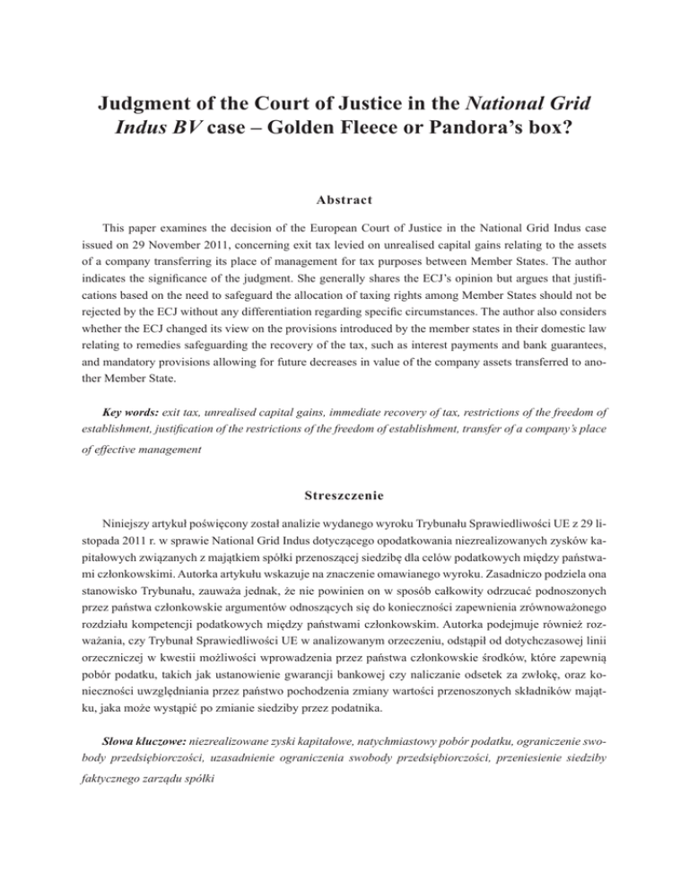 Judgment of the Court of Justice in the National Grid Indus BV case – Golden Fleece or Pandora’s box? Abstract This paper examines the decision of the European Court of Justice in the National Grid Indus case issued on 29 November 2011, concerning exit tax levied on unrealised capital gains relating to the assets of a company transferring its place of management for tax purposes between Member States. The author indicates the significance of the judgment. She generally shares the ECJ’s opinion but argues that justifications based on the need to safeguard the allocation of taxing rights among Member States should not be rejected by the ECJ without any differentiation regarding specific circumstances. The author also considers whether the ECJ changed its view on the provisions introduced by the member states in their domestic law relating to remedies safeguarding the recovery of the tax, such as interest payments and bank guarantees, and mandatory provisions allowing for future decreases in value of the company assets transferred to another Member State. Key words: exit tax, unrealised capital gains, immediate recovery of tax, restrictions of the freedom of establishment, justification of the restrictions of the freedom of establishment, transfer of a company’s place of effective management Streszczenie Niniejszy artykuł poświęcony został analizie wydanego wyroku Trybunału Sprawiedliwości UE z 29 listopada 2011 r. w sprawie National Grid Indus dotyczącego opodatkowania niezrealizowanych zysków kapitałowych związanych z majątkiem spółki przenoszącej siedzibę dla celów podatkowych między państwami członkowskimi. Autorka artykułu wskazuje na znaczenie omawianego wyroku. Zasadniczo podziela ona stanowisko Trybunału, zauważa jednak, że nie powinien on w sposób całkowity odrzucać podnoszonych przez państwa członkowskie argumentów odnoszących się do konieczności zapewnienia zrównoważonego rozdziału kompetencji podatkowych między państwami członkowskim. Autorka podejmuje również rozważania, czy Trybunał Sprawiedliwości UE w analizowanym orzeczeniu, odstąpił od dotychczasowej linii orzeczniczej w kwestii możliwości wprowadzenia przez państwa członkowskie środków, które zapewnią pobór podatku, takich jak ustanowienie gwarancji bankowej czy naliczanie odsetek za zwłokę, oraz konieczności uwzględniania przez państwo pochodzenia zmiany wartości przenoszonych składników majątku, jaka może wystąpić po zmianie siedziby przez podatnika. Słowa kluczowe: niezrealizowane zyski kapitałowe, natychmiastowy pobór podatku, ograniczenie swobody przedsiębiorczości, uzasadnienie ograniczenia swobody przedsiębiorczości, przeniesienie siedziby faktycznego zarządu spółki Przegląd Europejski Nr 1 (31), 2014 Ewa Prejs Katedra Prawa Finansów Publicznych Uniwersytetu Mikołaja Kopernika w Toruniu Wyrok Trybunału Sprawiedliwości w sprawie National Grid Indus BV – złote runo czy puszka Pandory? Komentarz do wyroku z dnia 29 listopada 2011 r. w sprawie National Grid Indus BV v. Inspecteur van de Belastingdienst Rijnmond/kantoor Rotterdam (C-371/10) TEZA: 1) Spółka utworzona zgodnie z prawem jednego państwa członkowskiego, która przenosi siedzibę faktycznego zarządu do innego państwa członkowskiego, przy czym to przeniesienie siedziby nie narusza jej statusu spółki pierwszego państwa członkowskiego, może powołać się na art. 49 Traktatu o funkcjonowaniu Unii Europejskiej (TFUE) w celu zakwestionowania zgodności z prawem opodatkowania nałożonego na nią przez pierwsze państwo członkowskie z tytułu tego przeniesienia siedziby. 2) Artykuł 49 TFUE należy interpretować w ten sposób, że: – nie sprzeciwia się on uregulowaniu państwa członkowskiego, na którego mocy kwota podatku od niezrealizowanych zysków związanych ze składnikami majątkowymi spółki jest ustalana ostatecznie – bez uwzględnienia strat ani też zysków, które mogą być zrealizowane później – w chwili, gdy spółka z uwagi na przeniesienie siedziby jej faktycznego zarządu do innego państwa członkowskiego przestaje osiągać zyski podlegające opodatkowaniu w pierwszym państwie członkowskim; w tym względzie nie ma znaczenia, że opodatkowane niezrealizowane zyski odnoszą się do zysku kursowego, który nie może być wyrażony w przyjmującym państwie członkowskim z uwagi na obowiązujący tam system podatkowy; 26 Ewa Prejs – sprzeciwia się on uregulowaniu państwa członkowskiego, które nakłada natychmiastowy pobór podatku od niezrealizowanych zysków związanych ze składnikami majątkowymi spółki przenoszącej siedzibę faktycznego zarządu do innego państwa członkowskiego już w chwili rzeczonego przeniesienia. KOMENTARZ Komentowane orzeczenie dotyczy problematyki dopuszczalności opodatkowania niezrealizowanych zysków kapitałowych przedsiębiorstw w przypadku zmiany ich siedziby dla celów podatkowych. Zyski takie występują w przypadku wzrostu wartości składników majątku przedsiębiorstwa. Orzeczenie w sprawie National Grid Indus BV ma istotne znaczenie z punktu widzenia analizowanego w nim zagadnienia, z uwagi na to, że jego tezy odnieść można również do przepisów krajowych wprowadzonych przez inne państwa członkowskie1. Problematyka opodatkowania niezrealizowanych zysków kapitałowych w związku ze zmianą rezydencji dla celów podatkowych była już przedmiotem rozważań Trybunał Sprawiedliwości Unii Europejskiej (TSUE) w najnowszym orzecznictwie oraz Komisji Europejskiej, jednakże głównie w odniesieniu do osób fizycznych. Z treści tych orzeczeń niewątpliwie wynika, że TSUE co do zasady nie kwestionuje prawa państw członkowskich UE do opodatkowania zysków kapitałowych powstałych na ich terytorium przed przeniesieniem miejsca zamieszkania przez podatnika do innego państwa członkowskiego UE. Prawo do opodatkowania wzrostu wartości majątku, który nastąpił w okresie, kiedy