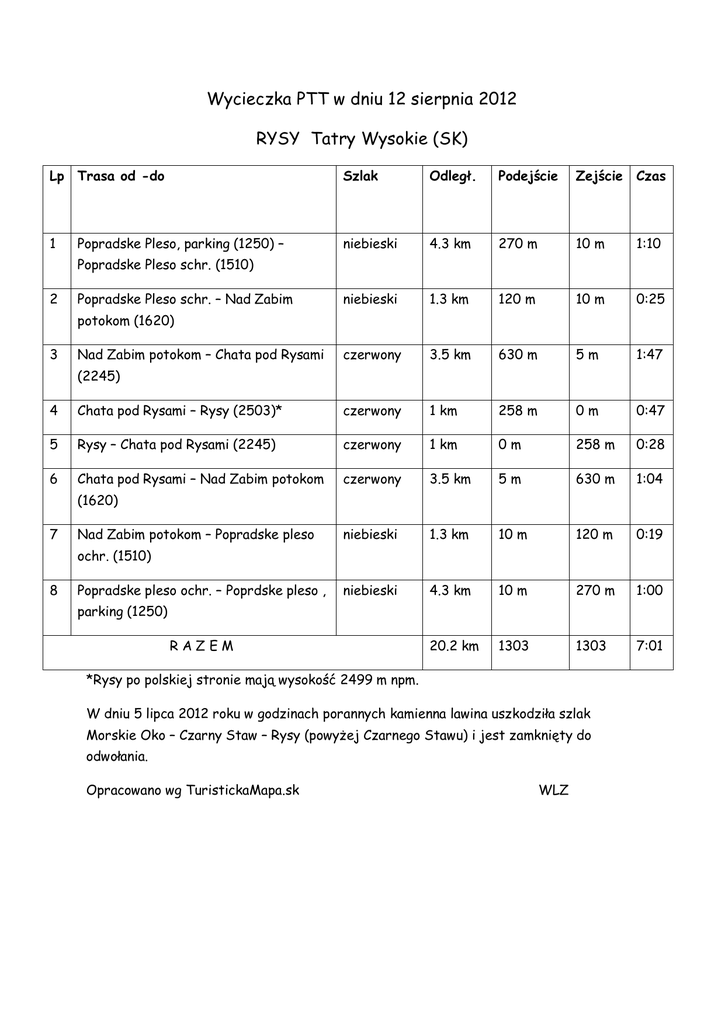Wycieczka PTT w dniu 12 sierpnia 2012 RYSY Tatry Wysokie (SK) Lp Trasa od -do Szlak Odległ. Podejście Zejście Czas 1 niebieski 4.3 km 270 m 10 m 1:10 niebieski 1.3 km 120 m 10 m 0:25 czerwony 3.5 km 630 m 5m 1:47 Popradske Pleso, parking (1250) – Popradske Pleso schr. (1510) 2 Popradske Pleso schr. – Nad Zabim potokom (1620) 3 Nad Zabim potokom – Chata pod Rysami (2245) 4 Chata pod Rysami – Rysy (2503)* czerwony 1 km 258 m 0m 0:47 5 Rysy – Chata pod Rysami (2245) czerwony 1 km 0m 258 m 0:28 6 Chata pod Rysami – Nad Zabim potokom czerwony 3.5 km 5m 630 m 1:04 niebieski 1.3 km 10 m 120 m 0:19 niebieski 4.3 km 10 m 270 m 1:00 20.2 km 1303 1303 7:01 (1620) 7 Nad Zabim potokom – Popradske pleso ochr. (1510) 8 Popradske pleso ochr. – Poprdske pleso , parking (1250) RAZEM *Rysy po polskiej stronie mają wysokość 2499 m npm. W dniu 5 lipca 2012 roku w godzinach porannych kamienna lawina uszkodziła szlak Morskie Oko – Czarny Staw – Rysy (powyżej Czarnego Stawu) i jest zamknięty do odwołania. Opracowano wg TuristickaMapa.sk WLZ Rysy 2499/2503 m npm Piękny, malowniczy szlak, umożliwiający w dużo bezpieczniejszy i łatwiejszy sposób, w stosunku do polskiego szlaku z Morskiego Oka (ten szlak jest zamknięty od 5 lipca 2012 do odwołania), zdobycie najwyższego szczytu naszego kraju - Rysów Z parkingu w Popradzkim Stawie (1250 m) idziemy asfaltową, szeroka i równą drogą pod górę ( w kilku miejscach jedynie robi się stromiej). Najpierw mijamy tory, potem szlaban i budynek ujęcia wody, oraz mostek na stosunkowo niewielkim tutaj Popradzie, który zaczyna się kilkaset metrów dalej, w miejscu gdzie na wysokości 1302 m łączą się potok Krupa wypływający z Popradzkiego Stawu, i Potok Mięguszowiecki (Hincov Potok), biorący początek w Hińczowym Stawie. Ponad kilometr od mostka, na wysokości ok. 1400 m przechodzimy przez drugi, na potoku Krupa, po czym szosa zwija się serpentyną w dwa głębokie zakręty. (Nie ścinamy ich, idziemy za znakowanym szlakiem!!!). Stąd ponad drzewami otwiera się widok na Dolinę Mięguszowiecką, ograniczającą ja Grań Baszt i wspaniałe skały, na które pną się odważnie drzewa. Można tu odpocząć, przysiadając na ławeczkach. Za nami już połowa drogi: wkrótce szosa stanie się całkiem płaska, wychodzimy na bardziej odsłoniętą przestrzeń, więc nie zasłaniane przez drzewa oczom naszym ukazują się góry: po prawej wspaniała, pionowa ściana Osterwy (Ostrva) – na której można wypatrzeć taterników, szczyty wokół Doliny Mięguszowieckiej, koronkową grań podwieszoną bajecznie nad Doliny Złomisk. Stąd do Stawu i schroniska już tylko kilkaset metrów. Wariant: Na 10 minut przed PopradzkimStawem od nasze asfaltów ki odchodzi w prawo żółty szlak na Symboliczny Cmentarz Ofiar Tatr, niesamowicie piękne i dające do myślenia miejsce. Popradzki Staw (Popradské pleso), otoczony limbami i świerkami, leży na wysokości 1494 m. W jego zielonych wodach odbijają się ściany Osterwy. Hotel górski zwany Chata Popradské Pleso albo Chata kapitana Morávku został nazwany tak na cześć partyzanta w słowackich Tatrach. Polityka turystyczna wewnątrz jest zmienna i różna każdego sezonu: w roku 1999 udostępniano tu podłogę na poddaszu za 170 koron, co było najniższą ceną w Tatrach Wysokich; w następnym roku zrezygnowano z tego w ogóle. Dla majętnych jest tu restauracja, bar, przed budynkiem zaś stoły, ławki i budki handlujące wszelkim dobrem. Początek szlaku znajduje się u końca asfaltów ki, dochodzącej tu od przystanku kolejki. W rejonie węzła szlaków w pobliżu schroniska nad Popradzkim Stawem natrafimy na niewielkie drewniane zadaszenie pod którym prawie zawsze można znaleźć materiał do wyniesienia do Chaty pod Rysami. Jeśli chcesz się poczuć szerpą – po słowacku: nosičem – to możesz załadować do swego plecaka ważący około 10 kg pakunek, a za jego przyniesienie do Chaty otrzymasz herbatę z sokiem malinowym i certyfikat nosiča. Zapłata jest symboliczna, gdyż szerpowanie jest rodzajem uprawianego tu sportu. Czasami dla wyjątkowo ambitnych przygotowany jest ładunek trzydziestokilogramowy, za którego wniesienie otrzymuje się herbatę z rumem. Do ciekawostek należy też fakt, że każdego roku, organizowane są tutaj zawody nosiczy, noszące nazwę – Ńerpa Rallye. Rekordowy ładunek wyniesiony do Tatrzańskiego schroniska wynosił 270 kg, wynik ten należy do nosicza Laco Kulanga, który był równocześnie hatarem schroniska pod Łomnicą. Natomiast rekordowy wynik ładunku wyniesionego do Chaty pod Rysami, wynosi 116 kg, a rekordowy czas podejścia z ładunkiem 60 kg do Chaty pod Rysami ze schroniska nad Popradzkim Stawem wyniósł nieco ponad godzinę. Z ustawionej na początku szlaku tabliczki dowiadujemy się o zakazie wprowadzania psów; złamawszy ów zakaz raz lub dwa, zostajemy ukarani grzywną, a za trzecim razem śmiercią przez powieszenie. Ścieżka wiedzie płaskim dnem doliny, pośród imponujących limb i wielkich kosodrzewin; możemy oglądać wspaniałe korzenie tych roślin oplatające wielkie kamienie. Po lewej stronie doliny podziwiamy majestatyczne skalne ściany, pożłobione ogromnymi żlebami, u podnóży których leżą imponujące piarżyska z usypanych głazów. To Grań Baszt (Báńty) z najwyższym Szatanem. Po około 35 minutach od opuszczenia stawu docieramy do drewnianego mostka nad Żabim Potokiem (Razcestie nad Ņabim Potokom 1620 m npm) . Tuż za nim natrafimy na czerwony skręcający w prawo szlak, za którym podążając dotrzemy aż na Rysy, a w lewo na Hińczowe Stawy i Koprowy. Ścieżka staje się stromsza. Po około 40 minutach wyprowadzi ona nas na próg Żabiej Doliny Mięguszowieckiej. Po około 15/20 minutach dotrzemy do wąskiego wcięcia w skalnym bloku, zza którego można wyjść na krawędź Wielkiego Mięguszowieckiego Żabiego Stawu (1919 m npm). Kontynuując podejście za czerwonymi znakami,