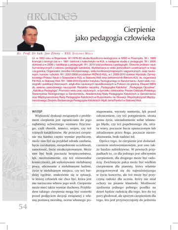 ARTICLES Cierpienie jako pedagogia człowieka K s . P rof. Dr hab. Jan Zimny – K UL S t a l o wa W o l a Ur. w 1952 roku w Bojanowie. W l.1976-82 studia filozoficzno-teologiczne w WSD w Przemyślu. W r. 1990 licencjat z teologii zaś w r. 1991 doktorat z katechetyki na KUL a następnie studia z pedagogiki. W r. 2005 doktorat a w 2006 r. habilitacja z pedagogiki. W r. 2010 tytuł profesora z pedagogiki. Obecnie profesor nauk humanistycznych z zakresu pedagogiki katolickiej. Wykładowca w wielu jednostkach uczelnianych w kraju i za granicą. Organizator ośrodka młodzieżowego, wielu konferencji krajowych i zagranicznych, sesji naukowych, kursów i szkoleń. W l. 2007-2008 prodziekan WZNoS KUL, w l. 2009-2010 dziekan Wydziału Zamiejscowego Prawa i Nauk o Gospodarce KUL w Stalowej Woli oraz pełnomocnik Rektora KUL ds. organizacji Filii KUL w Stalowej Woli. W l. 1999-2010 Dyrektor Instytutu Teologicznego w Sandomierzu. Autor wielu monografii i publikacji zbiorowych, artykułów naukowych opublikowanych w Polsce i za granicą. Ekspert MEN ds. awansu zawodowego nauczycieli. Redaktor naczelny „Pedagogika Katolicka”, „Pedagogia Ojcostwa”, „Katolikus Pedagógia”. Promotor wielu prac naukowych, w tym kilku doktoratów. Prezes Oddziału Polskiego Towarzystwa Teologicznego w Sandomierzu, Akademickiej Rady Pedagogów Katolickich w Sandomierzu oraz Międzynarodowej Rady Pedagogów Katolickich w Rużomberku na Słowacji. Współzałożyciel Międzynarodowego Zespołu Badawczego Pedagogów Katolickich Myśli Jana Pawła II w Stalowej Woli. Wstęp Większość dyskusji związanych z problemem cierpienia jest ograniczana do jego najłatwiej uchwytnego wymiaru fizycznego, czyli chorób, śmierci, wojen, czy też różnych kataklizmów. Ale przecież cierpienie ma bardzo często wymiar psychiczny, może nim być na przykład zdrada zaufania, bycie oszukanym, niespełnienie oczekiwań, samotność, bycie nieakceptowanym. Może nim być brak poczucia bezpieczeństwa, lęk, niezrozumienie, czy też różnorodne konieczności, jak wykonywanie nielubianej pracy, obcowanie z nielubianymi ludźmi, życie w nielubianym miejscu, czy też bardziej ogólnie, znalezienie się w sytuacji, w której człowiek nie chce być, która jest mu narzucona wbrew jego woli. Cierpienie może mieć także wymiar duchowy. Przykładem takiego cierpienia mogą być rozterki przed podjęciem decyzji związanej z własną postawą moralną, ocena własnego po- 54 stępowania, wyrzuty sumienia, lęk przed odrzuceniem, czy też potępieniem, utrata sensu życia, uświadomienie sobie własnego błędu, czy też popełnionego zła, utrata wiary, poczucie bycia opuszczonym lub zdradzonym przez Boga, poczucie niezrealizowania, brak nadziei itd. Oprócz tego, że cierpienie jest doświadczeniem wielowymiarowym, jest ono także bardzo subiektywne. W pewnych przypadkach to, co dla jednego jest olbrzymim cierpieniem, dla drugiego może być radością. Zwichnięcie palca może być wielkim cierpieniem dla pianisty, który właśnie przygotowywał się do najważniejszego w życiu koncertu, ale też może być przyczyną radości dla ucznia, który nie miał ochoty na pisanie klasówki. Możliwość zjedzenia jednego pełnego posiłku na dzień będzie radością dla tego, kto do tej pory głodował, ale sporym cierpieniem dla tego, kto jest przyzwyczajony do jedzenia ARTYKUŁY bez żadnych ograniczeń. Ktoś może cierpieć bardziej z powodu śmierci psa, niż ktoś inny z powodu śmierci człowieka. Utrata pracy przez ojca licznej rodziny może być dla niego większym cierpieniem niż głodowa śmierć dla ojca Kolbego. Człowiek cierpiący, często staje się odrzuconym przez zdrowych. Co prawda nie ma on bezpośredniego wpływu na losy świata w wymiarze zewnętrznym, to jednak dzięki zbliżeniu do tronu łaski poprzez cierpienie staje się fundamentem, oparciem, opoką także w realizacji rozwoju całego świata. To bycie opoką dokonuje się przez składne ofiary z siebie w cierpieniu. Święty Paweł przypomina nam: „Chrystus przecież cierpiał za was i zostawił wam wzór, abyście szli za Nim Jego śladami” (1P 2,21). „Cieszcie się, im bardziej jesteście uczestnikami cierpień Chrystusowych, abyście się cieszyli i radowali przy objawieniu się Jego chwały” (1P 4,13). Nie dziwi nas fakt, wielkiego zawierzenia losów Kościoła i świata przez Jana Pawła II poprzez posługę ludzi cierpienia. Podejmując się przedstawienia zagadnienia wychowania przez cierpienie, nie sposób przypomnieć dwóch zasadniczych kwestii. Pierwsza kwestia to, uświadomienie sobie, czym jest wychowanie? Druga z kolei dotyczy odpowiedzi na pytanie: czym jest cierpienie? Świadomość znaczenia tych dwóch pojęć pomoże nam w dalszych rozważaniach. Jeśli chodzi o definicję na temat wychowania, to spotykamy bardzo wiele ujęć i określeń dotyczących tego pojęcia. Jednak jak do tej pory, żadna nie została przyjęta jako ostateczna. Wciąż pojawiają się nowe ujęcia. I w zależności, na co postawimy główny akcent wówczas kształt definicji będzie nieco odmienny. W ujęciu personalistycznym można powiedzieć, że wychowanie to doskonalenie osobowości człowieka. Doskonalenie to prowadzi do określonych zmian nie tylko w wymiarze osobowym, lecz także w wymiarze duchowym, czyli następuje wzrost wartości duchowych. Wychowanie zwykle dokonuje się poprzez: • wiedzę, która jest owocem poznawania i uczenia się, • etykę czyli postawę (wychowawcy) wyznaczoną przez wartości moralne, • kulturę, która łączy etykę i wiedzę, a więc to wszystko co ubogaca naturę człowieka (religia, sztuka, nauka, moralność). Odpowiadając z kolei na pytanie: czym jest cierpienie, spotkamy również wiele definicji na ten temat. Najczęściej spotykamy określenie, że cierpienie to negatywny stan psychiczny, bądź fizyczny i emocjonalny doświadczany często jako ból. Cierpienie może mieć postać zarówno pewnego r