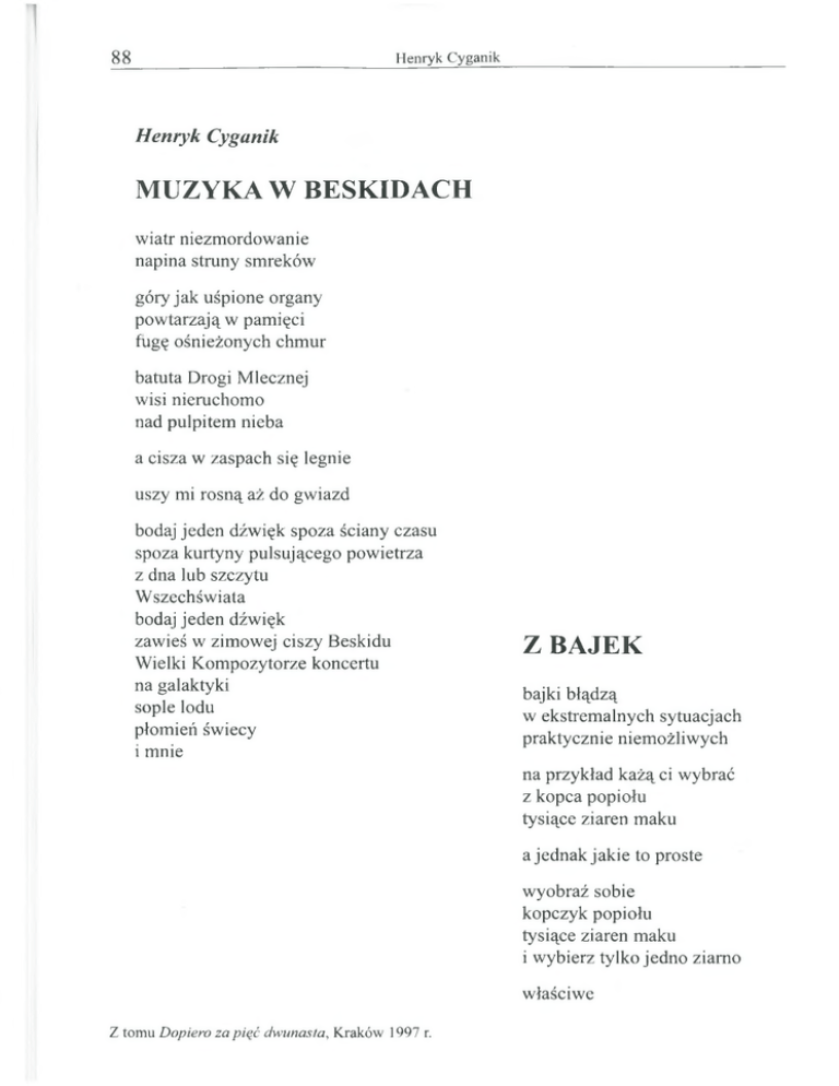 88 Henryk Cyganik H en ryk C yganik MUZYKA W BESKIDACH wiatr niezmordowanie napina struny smreków góry jak uśpione organy powtarzają w pamięci fugę ośnieżonych chmur batuta Drogi Mlecznej wisi nieruchomo nad pulpitem nieba a cisza w zaspach się legnie uszy mi rosną aż do gwiazd bodaj jeden dźwięk spoza ściany czasu spoza kurtyny pulsującego powietrza z dna lub szczytu Wszechświata bodaj jeden dźwięk zawieś w zimowej ciszy Beskidu Wielki Kompozytorze koncertu na galaktyki sople lodu płomień świecy i mnie Z BAJEK bajki błądzą w ekstremalnych sytuacjach praktycznie niemożliwych na przykład każą ci wybrać z kopca popiołu tysiące ziaren maku a jednak jakie to proste wyobraź sobie kopczyk popiołu tysiące ziaren maku i wybierz tylko jedno ziarno właściwe Z tom u Dopiero za piąć dw unasta, Kraków 1997 r.