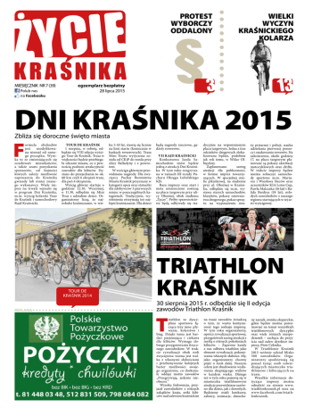 PROTEST WYBORCZY ODDALONY MIESIĘCZNIK NR 7 (39) Polub nas na Facebooku WIELKI WYCZYN KRAŚNICKIEGO KOLARZA egzemplarz bezpłatny 28 lipca 2015 DNI KRAŚNIKA 2015 Zbliża się doroczne święto miasta F ormuła obchodów jest modyfikowana niemal od samego początku. Wynika to ze zmieniających się oczekiwań mieszkańców, a także szans pozyskania sponsorów, od hojności których zależy możliwość zaproszenia do Kraśnika gwiazdy lub mniej znanego wykonawcy. Wiele imprez na trwałe wpisało się w program Dni Kraśnika, m.in. wyścig kolarski Tour de Kraśnik i samochodowy Rajd Kraśnicki. Tour de Kraśnik 1 sierpnia, w sobotę, odbędzie się VIII edycja wyścigu Tour de Kraśnik. Trasa w większości będzie przebiegała ulicami miasta, co z pewnością podnosi atrakcyjność zawodów dla kibiców. Dystans do przejechania to ok. 60 km czyli 6 okrążeń trasy, dla pań 4 okrążenia. Wyścig główny startuje o godzinie 12.30. Wcześniej, o 11.30, odbędzie się Mini Tour z udziałem dzieci. Organizatorzy liczą, że najmłodsi kraśniczanie, w wie- Tour de Kraśnik 2014 REKLAMA ku 5-10 lat, stawią się licznie na linii startu (koniecznie w kaskach rowerowych). Trasa Mini Touru wytyczona została od CKiP do ronda przy ulicy Balladyny i z powrotem. W wyścigu głównym przewidziano nagrody. Dla zwycięzcy Puchar Burmistrza Miasta Kraśnik przyznany w kategorii open oraz statuetki dla zdobywców 3 pierwszych miejsc w poszczególnych kategoriach. Tradycyjnie, wyróżnienia otrzymają też najlepsi kraśniczanie. Dla dzieci będą nagrody rzeczowe, gadżety rowerowe. VII Rajd Kraśnicki Konkursowa Jazda Samochodem znów będzie jedną z atrakcji Dni Kraśnika. W tym roku rozgrywana w ramach III rundy Pucharu Okręgu Lubelskiego KJS. Baza imprezy oraz start i meta umieszczone zostaną na placu targowym przy ulicy Oboźnej, obok stadionu „Tęczy”. Próby sprawnościowe będą odbywały się tra- dycyjnie na wspomnianym placu targowym. Jedna z tras odcinków drogowych zlokalizowana będzie, podobnie jak rok temu, w Wólce Olbięckiej. Zaplanowano szereg atrakcji dla publiczności, w formie imprez towarzyszących. W specjalnej strefie piknikowej, na stadionie przy ul. Oboźnej w Kraśniku, odbędzie się m.in. wystawa starych samochodów, klasyków, pokazy ratownictwa drogowego, pokaz sprzętu na wyposażeniu stra- ży pożarnej i policji, nauka udzielania pierwszej pomocy i znakowanie rowerów. Na zakończenie, około godziny 17, na placu targowym planowane są pokazy akrobacji motocyklowych oraz driftu. W trakcie imprezy będzie można zobaczyć samochody sportowe m.in. Mariusza i Wiesława Steców oraz uczestników KIA Lotos Cup, Pawła Malczaka (16 lat) i Rafała Berdysa (18 lat), młodych zawodników z naszego regionu startujących w tej serii wyścigowej. TRIATHLON KRAŚNIK 30 sierpnia 2015 r. odbędzie się II edycja zawodów Triathlon Kraśnik T riathlon to dyscyplina sportowa łącząca trzy inne: pływanie, kolarstwo i bieg. Dzięki temu jest bardzo pasjonująca i ciekawa dla kibiców. Wymaga dobrego przygotowania fizycznego zawodników. W trakcie rywalizacji obok woli zwycięstwa ważna jest walka z własnymi słabościami i przełamywanie kolejnych barier możliwości swojego organizmu, co doskonale oddaje motto zawodów „Przegrywają, jedynie nieobecni.” Wysoka frekwencja, przyjazd zawodników z różnych zakątków kraju, setki kibiców nad zalewem kraśnickim na trasie zawodów świadczą o tym, że warto kontynuować tego rodzaju imprezę. W tym roku organizatorzy, oprócz rywalizacji sportowej, przygotowali szereg atrakcji z myślą o różnych pokoleniach kibiców. – Zapewne każdy z nas odbiera triathlon jako element rywalizacji, pokonywania własnych słabości. My, jako organizatorzy chcemy pójść o krok dalej. Naszym celem jest zbudowanie wydarzenia skupiającego widzów w każdym wieku. Dlatego też w tym roku pojawią się w miasteczku triathlonowym atrakcje przewidziane zarówno dla dzieci, jak i dorosłych. Będziemy mieli konkursy, zabawy, animacje, dmucha- ny zamek, stoiska eksperckie, gdzie będzie można porozmawiać na temat wszystkich triathlonowych dyscyplin oraz wiele różnych niespodzianek – zachęca do przyjścia nad zalew dyrektor imprezy, Piotr Członka. W Triathlonie Kraśnik 2015 weźmie udział blisko 300 zawodników. Organizatorzy spodziewają się ponad tysiąc osób odwiedzających miasteczko triathlonowe i kibicujących na trasie. Wszelkie informacje dotyczące imprezy można odnaleźć na stronie www. triathlonkrasnik.pl oraz na www.facebook.com/triathlonkrasnik. NOWY SEKRETARZ MIASTA OKIEM NACZELNEGO Z achęcam, by czytanie kolejnego wydania gazety miejskiej rozpocząć od trzeciej strony czyli od relacji z dwóch ostatnich rozpraw, jakie odbyły się w Sądzie Okręgowym w Lublinie, gdzie rozpatrywano protest wyborczy złożony przez Urszulę Kozyrską, współpracownicę Piotra Janczarka, polityka PSL, kandydata na burmistrza Kraśnika. Na pierwszej z lipcowych rozpraw pełnomocnik wyborczy polityka PSL podjęła czynności, które ocenione zostały, także przez sąd, jako próba wprowadzenia przewlekłości procesu. Jaki miałoby to mieć cel? 14 lipca Sąd Okręgowy orzekł, iż w trakcie wyborów burmistrza miasta Kraśnik nie doszło do naruszenia prawa karnego i wyborczego. Wyrok nie jest jeszcze prawomocny. Czego dopatrzył się, a raczej nie dopatrzył, sąd w przebiegu wyborów można dowiedzieć się z omówienia uzasadnienia, zamieszczonego na stronie 3. Chcę zwrócić uwagę kraśniczan na wypowiedź U. Kozyrskiej, która powiedziała dziennikarzom mediów regionalnych m.in.: „Sprawy wygrywają prawnicy. Do przerwy mamy 0:1. Co będzie dalej? Zobaczymy.” Trochę niepokoi taki sposób myślenia. Poważnej sprawy publicznej raczej nie wypada traktować jak meczu piłkarskiego, w którym wygrywają trenerzy, przyjmując odpowiednią taktykę. A co z umiejętnościami piłkarzy? Porównanie wyborów burmistrza 