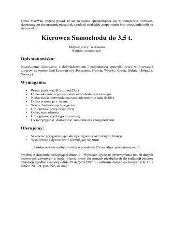 Firma MacWat, obecna ponad 12 lat na rynku, specjalizująca się w transporcie drobnym, ekspresowym dostarczaniu przesyłek, spedycji miejskiej, zaopatrzeniu biur, poszukuje osób na stanowisko: Kierowca Samochodu do 3,5 t. Miejsce pracy: Warszawa Region: mazowiecki Opis stanowiska: Poszukujemy kierowców z doświadczeniem i znajomością specyfiki pracy w przewozie towarów na terenie Unii Europejskiej (Hiszpania, Francja, Włochy, Grecja, Belgia, Holandia, Niemcy). Wymagania: • • • • • • • • • Prawo jazdy kat. B (min. od 2 lat) Doświadczenie w prowadzeniu samochodu dostawczego Niekaralność potwierdzona zaświadczeniem z sądu (KRK) Dobra orientacja w terenie Ważne badania psychologiczne Umiejętność pracy zespołowej Dobry stan zdrowia Umiejętność szybkiego uczenia się Dyspozycyjność, dokładność, sumienność i zaangażowanie Oferujemy: • • Szkolenie przygotowujące do wykonywania określonych funkcji Współpracę z dynamicznie rozwijającą się firmą Zainteresowane osoby prosimy o przesłanie CV na adres: [email protected] Prosimy o dopisanie następującej klauzuli: "Wyrażam zgodę na przetwarzanie moich danych osobowych zawartych w mojej ofercie pracy dla potrzeb niezbędnych do realizacji procesu rekrutacji zgodnie z ustawą z dnia 29 sierpnia 1997 r. o ochronie danych osobowych (Dz. U. z 2002 r. Nr 101, poz. 926, ze zm.)"