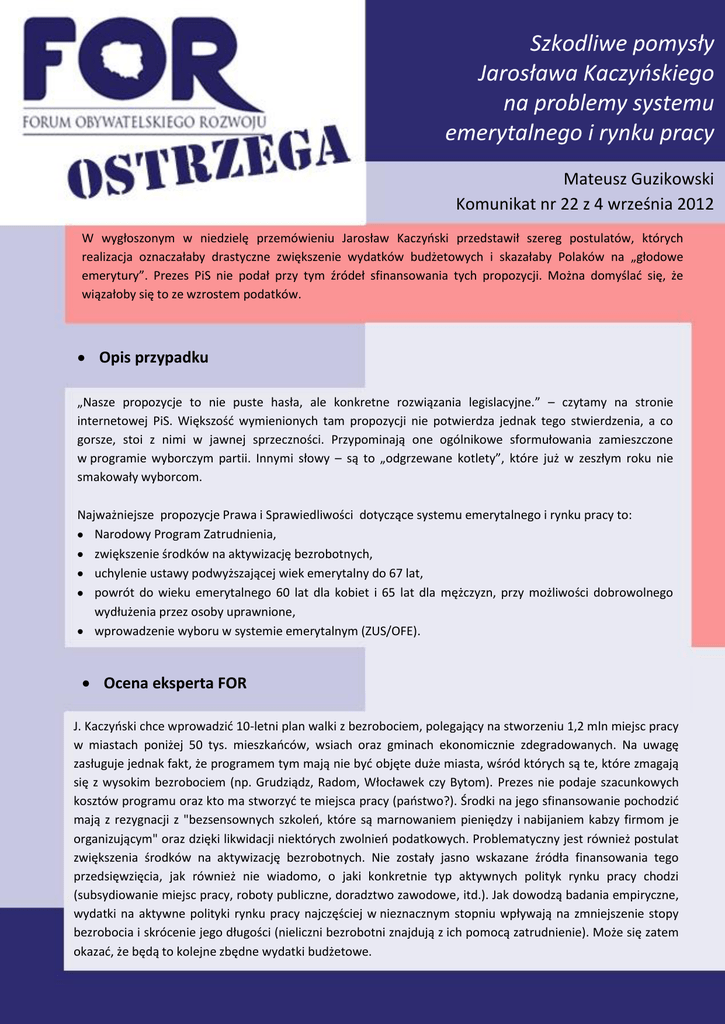 Szkodliwe pomysły Jarosława Kaczyńskiego na problemy systemu emerytalnego i rynku pracy Mateusz Guzikowski Komunikat nr 22 z 4 września 2012 W wygłoszonym w niedzielę przemówieniu Jarosław Kaczyński przedstawił szereg postulatów, których realizacja oznaczałaby drastyczne zwiększenie wydatków budżetowych i skazałaby Polaków na „głodowe emerytury”. Prezes PiS nie podał przy tym źródeł sfinansowania tych propozycji. Można domyślać się, że wiązałoby się to ze wzrostem podatków. Opis przypadku „Nasze propozycje to nie puste hasła, ale konkretne rozwiązania legislacyjne.” – czytamy na stronie internetowej PiS. Większość wymienionych tam propozycji nie potwierdza jednak tego stwierdzenia, a co gorsze, stoi z nimi w jawnej sprzeczności. Przypominają one ogólnikowe sformułowania zamieszczone w programie wyborczym partii. Innymi słowy – są to „odgrzewane kotlety”, które już w zeszłym roku nie smakowały wyborcom. Najważniejsze propozycje Prawa i Sprawiedliwości dotyczące systemu emerytalnego i rynku pracy to: Narodowy Program Zatrudnienia, zwiększenie środków na aktywizację bezrobotnych, uchylenie ustawy podwyższającej wiek emerytalny do 67 lat, powrót do wieku emerytalnego 60 lat dla kobiet i 65 lat dla mężczyzn, przy możliwości dobrowolnego wydłużenia przez osoby uprawnione, wprowadzenie wyboru w systemie emerytalnym (ZUS/OFE). Ocena eksperta FOR J. Kaczyński chce wprowadzić 10-letni plan walki z bezrobociem, polegający na stworzeniu 1,2 mln miejsc pracy w miastach poniżej 50 tys. mieszkańców, wsiach oraz gminach ekonomicznie zdegradowanych. Na uwagę zasługuje jednak fakt, że programem tym mają nie być objęte duże miasta, wśród których są te, które zmagają się z wysokim bezrobociem (np. Grudziądz, Radom, Włocławek czy Bytom). Prezes nie podaje szacunkowych kosztów programu oraz kto ma stworzyć te miejsca pracy (państwo?). Środki na jego sfinansowanie pochodzić mają z rezygnacji z "bezsensownych szkoleń, które są marnowaniem pieniędzy i nabijaniem kabzy firmom je organizującym" oraz dzięki likwidacji niektórych zwolnień podatkowych. Problematyczny jest również postulat zwiększenia środków na aktywizację bezrobotnych. Nie zostały jasno wskazane źródła finansowania tego przedsięwzięcia, jak również nie wiadomo, o jaki konkretnie typ aktywnych polityk rynku pracy chodzi (subsydiowanie miejsc pracy, roboty publiczne, doradztwo zawodowe, itd.). Jak dowodzą badania empiryczne, wydatki na aktywne polityki rynku pracy najczęściej w nieznacznym stopniu wpływają na zmniejszenie stopy bezrobocia i skrócenie jego długości (nieliczni bezrobotni znajdują z ich pomocą zatrudnienie). Może się zatem okazać, że będą to kolejne zbędne wydatki budżetowe. Prezes stwierdził, że nie może być przymusu pracy do 67 r. ż. oraz że jego rząd przywróci wiek emerytalny kobiet i mężczyzn do poziomu sprzed reformy (tj. 60 i 65 lat), przy czym Polakom pozostawi się możliwość dłuższej aktywności zawodowej (do 67 r. ż.). Dodał również, że zakłada przy tym, iż większość osób będzie chciała z tego prawa skorzystać. Niestety zdecydowana większość badań empirycznych pokazuje, że ludzie rzadko decydują się na dobrowolne wydłużenie aktywności zawodowej. Nabywając prawo do emerytury, po prostu z niej korzystają, ponieważ traktują ją jako okres zasłużonego wypoczynku po latach trudów pracy zawodowej. Inną kwestią jest wbudowanie do systemu emerytalnego narzędzi zachęcających do dłuższej aktywności, działających równocześnie jako hamulec prewencyjny przed zbyt wczesnym opuszczeniem rynku pracy. Jeśli dziś prezes mówi „nie podwyższajmy wieku emerytalnego”, to de facto skazuje Polaków na „głodowe emerytury”. Nikomu nie udało się oszukać praw demografii, z których jednoznacznie wynika, że jeśli dłużej żyjemy, to – by po przejściu na emeryturę nie odczuć drastycznego pogorszenia własnego dobrobytu – musimy dłużej pracować. Założenie prezesa o tym, że większość Polaków dobrowolnie zdecyduje się na dłuższą aktywność zawodową jest bezzasadne. W swoim wystąpieniu J. Kaczyński stwierdził także, iż należy pozostawić Polakom możliwość wyboru, czy chcą odprowadzać składki do ZUS czy do OFE. „Dzisiaj znaczna część społeczeństwa zorientowała się, że (…) OFE oznacza perspektywę emerytur nie niskich, tylko w gruncie rzeczy żadnych, czy prawie żadnych.” – dodał. Przesłanki wskazują na to, że prezes Kaczyński zmierza w kierunku rozwiązania węgierskiego, czyli całkowitej likwidacji kapitałowego filaru systemu emerytalnego. Konieczność przeprowadzenia proponowanej przez siebie antyreformy opiera przy tym na przedwczesnej ocenie funkcjonowania nowego systemu emerytalnego. System emerytalny jest narzędziem skonstruowanym na dekady. Filar kapitałowy (OFE) został wprowadzony w celu uniezależnienia emerytur od odprowadzanych do ZUS składek (które miały wątpliwy związek z wysokością wypłacanego świadczenia), których wysokość zależy od decyzji politycznych. W drugim filarze (OFE) odprowadzane składki w przejrzysty sposób generują wysokość świadczenia – każdy pracuje na swoją emeryturę. Dodatkowo zaś, im więcej oszczędzamy, tym gospodarka będzie się szybciej rozwijać, a przyszłe emerytury będą wyższe. Składka do OFE – zamiast zostać obcięta – powinna zatem wzrosnąć, ponieważ leży to w interesie odprowadzających składki, lecz nie w interesie rządzących. Likwidacja OFE to nie tylko uzależnienie emerytur od decyzji polityków, ale również spowolnienie rozwoju gospodarczego poprzez zmniejszenie skali inwestycji i rosnące koszty obsługi jawnego długu publicznego wynikające z rosnącego deficytu systemu emerytalnego. Filar kapitałowy jest swego rodzaju buforem chroniącym nas przed krótkowzrocznymi decyzjami polityków.