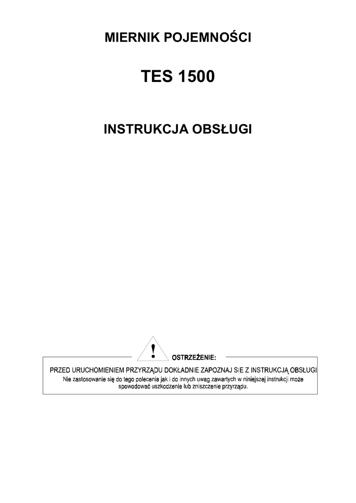 MIERNIK POJEMNOŚCI TES 1500 INSTRUKCJA OBSŁUGI ! Instrukcja obsługi - Miernik pojemności TES-1500 1. SPECYFIKACJE 1.1. SPECYFIKACJE OGÓLNE Zasada działania: przetwornik a/c z podwójnym całkowaniem; Wyświetlacz: LCD, 3 ½ cyfry, maksymalny odczyt 1999; Wskaźnik przekroczenia zakresu: wyświetlany znak „1”; Wskaźnik stanu baterii: wyświetlany symbol „BT”; Regulacja zera: ± 20 pF; Częstość pomiaru: 2 próbki/s; Zasilanie: bateria 9V, IEC 6F22 lub NEDA 1604; Czas życia baterii: alkaliczne: 200 h; węglowo-cynkowe: 100 h ÷ 150 h; Warunki eksploatacji: 0°C ÷ 40°C, <80% wilgotności względnej; Warunki przechowywania: -10°C ÷ 60°C, <70% wilgotności względnej; Wymiary: 135mm x 72mm x 33mm; Waga: 207 g z baterią; Wyposażenie: instrukcja obsługi, przewody pomiarowe, bateria, bezpiecznik (0,25A/250V); 1.2. SPECYFIKACJE ELEKTRYCZNE Format zapisu błędów pomiarowych: ±( % wartości wskazanej + ilość cyfr) w temp. 23°C, <80% wilgotności względnej; BŁĄD MAKSYMALNY ODCZYT 0,1 pF ±(0,5%+1+0,5pF) 199,9 pF 800 Hz 2 nF 1 pF ±(0,5%+1) 1,999 nF 800 Hz 20 nF 10 pF ±(0,5%+1) 19,99 nF 800 Hz 200 nF 100 pF ±(0,5%+1) 199,9 nF 800 Hz 2 µF 1 nF ±(0,5%+1) 1,999 µF 800 Hz 20 µF 10 nF ±(0,5%+1) 19,99 µF 80 Hz 200 µF 100 nF ±(0,5%+1) 199,9 µF 8 Hz 2000 µF 1 µF ±(1%+1) 1999 µF 8 Hz 20 mF 10 µF ±(2%+1) 19,99 mF 8 Hz ZAKRES ROZDZIELCZOŚĆ 200 pF Maksymalne napięcie pomiaru: 4,5 V; Zabezpieczenie wejścia: bezpiecznik 0,25A/250V; 2000/09 -2- CZĘSTOTLIWOŚĆ POMIARU Instrukcja obsługi - Miernik pojemności TES-1500 2. OPIS ! Wyświetlacz LCD, 3 ½ cyfry, maksymalny odczyt 1999; " Wyłącznik zasilania; # Przełącznik zakresów; $ Gałka zerowania; % Wejścia na przewody pomiarowe; & Wejścia pomiarowe bezpośrednie (umożliwia bezpośrednie podłączenie kondensatora); 3. POMIARY 3.1. Uwagi. 1) Przed rozpoczęciem pomiarów należy upewnić się, że bateria oraz bezpiecznik są prawidłowo zainstalowane. 2) Przed rozpoczęciem pomiarów należy upewnić się, że kondensatory są w pełni rozładowane. 3) Sprawdzić czy polaryzacja oznaczona na kondensatorach (dotyczy kondensatorów elektrolitycznych) odpowiada polaryzacji oznaczonej na wejściu miernika. 4) Podłączenie źródeł napięcia do multimetru może doprowadzić do zniszczenia miernika. 3.2. Wykonanie pomiarów. 1) Włączyć miernik; 2) Przełącznikiem # ustawić żądany zakres; 3) Przed rozpoczęciem pomiarów gałką $ wyzerować wskazanie wyświetlacza; 4) Włożyć kondensator do gniazda & lub podłączyć kondensator za pomocą przewodów pomiarowych; 5) Odczytać wartość z wyświetlacza. 3.3. Uwagi dotyczące warunków pomiaru. 1) Jeżeli testowany kondensator jest zwarty to wskazanie jest wyższe od właściwego lub zostanie wyświetlony wskaźnik przekroczenia zakresu; 2) Dla małych pojemności należy korzystać z wejścia bezpośredniego & aby wyeliminować pojemności przewodów oraz styków; 3) Jeżeli pojemność kondensatora jest mierzona za pomocą przewodów pomiarowych należy odjąć wartość pojemności przewodów od wartości wskazanej przez miernik. 2000/09 -3- Instrukcja obsługi - Miernik pojemności TES-1500 4. KONSERWACJA OSTRZEŻENIE! Aby uniknąć porażenia prądem przed zdjęciem tylnej pokrywy miernika należy wyłączyć miernik oraz odłączyć przewody pomiarowe. 4.1. Sprawdzanie stanu i wymiana baterii 1) Jeżeli moc baterii jest niewystarczająca na wyświetlaczu zostanie wyświetlony wskaźnik „BT”. Należy wówczas wymienić baterię 9V (IEC 6F22 ) na nową; 2) Po odłączeniu przewodów pomiarowych oraz wyłączeniu miernika należy lekko nacisnąć na tylną pokrywę i pociągnąć zgodnie ze wskazaniami strzałek. Wymienić baterię na nową. 4.2. Wymiana bezpiecznika 1) Po odłączeniu przewodów pomiarowych oraz wyłączeniu miernika należy lekko nacisnąć na tylną pokrywę i pociągnąć zgodnie ze wskazaniami strzałek. 2) Wyjąć baterię. Wymienić bezpiecznik na nowy. Włożyć baterię. OSTRZEŻENIE! Aby uniknąć zniszczenia miernika bezpiecznik należy użyć bezpiecznika bezzwłocznego 0,25A/250V o wymiarach φ5mm x 20mm. 4.3. Konserwacja. Urządzenie należy utrzymywać w czystości. Przystawkę można wycierać wilgotną ściereczką z detergentem. Nie używać środków ścierających oraz rozpuszczalników. Jakakolwiek naprawa, konserwacja lub kalibracja powinna być prowadzona przez serwis. BH Opole, 9 września 2000 2000/09 -4-