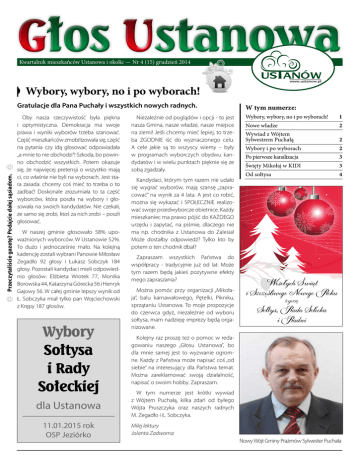 Głos Ustanowa Kwartalnik mieszkańców Ustanowa i okolic — Nr 4 (15) grudzień 2014 Przeczytaliście gazetę? Podajcie dalej sąsiadom. Wybory, wybory, no i po wyborach! Gratulacje dla Pana Puchały i wszystkich nowych radnych. W tym numerze: Oby nasza rzeczywistość była piękna i optymistyczna. Demokracja ma swoje prawa i wyniki wyborów trzeba szanować. Część mieszkańców zmobilizowała się, część na pytania czy idą głosować odpowiadała „a mnie to nie obchodzi”! Szkoda, bo powinno obchodzić wszystkich. Potem okazuje się, że najwięcej pretensji o wszystko mają ci, co właśnie nie byli na wyborach. Jest stara zasada: chcemy coś mieć to trzeba o to zadbać! Doskonale zrozumiała to ta część wyborców, która poszła na wybory i głosowała na swoich kandydatów. Nie czekali, że samo się zrobi, ktoś za nich zrobi – poszli głosować. Wybory, wybory, no i po wyborach! 1 Nowe władze 2 Wywiad z Wójtem Sylwestrem Puchałą 2 Wybory i po wyborach 2 Po pierwsze kanalizacja 3 Święty Mikołaj w KIDI 3 Od sołtysa 4 W naszej gminie głosowało 58% upoważnionych wyborców. W Ustanowie 52%. To dużo i jednocześnie mało. Na kolejną kadencję zostali wybrani Panowie Miłosław Zegadło 92 głosy i Łukasz Sobczyk 184 głosy. Pozostali kandydaci mieli odpowiednio głosów: Elżbieta Wrotek 77, Monika Borowska 44, Katarzyna Górecka 56 i Henryk Gajowy 56. W całej gminie lepszy wynik od Ł. Sobczyka miał tylko pan Wojciechowski z Krępy 187 głosów. Wybory Sołtysa i Rady Sołeckiej dla Ustanowa 11.01.2015 rok OSP Jeziórko Niezależnie od poglądów i opcji - to jest nasza Gmina, nasze władze, nasze miejsce na ziemi! Jeśli chcemy mieć lepiej, to trzeba ZGODNIE iść do wyznaczonego celu. A cele jakie są to wszyscy wiemy – były w programach wyborczych obydwu kandydatów i w wielu punktach pięknie się ze sobą zgadzały. Kandydaci, którym tym razem nie udało się wygrać wyborów, mają szansę „zapracować” na wynik za 4 lata. A jest co robić, można się wykazać i SPOŁECZNIE realizować swoje przedwyborcze obietnice. Każdy mieszkaniec ma prawo pójść do KAŻDEGO urzędu i zapytać, na piśmie, dlaczego nie ma np. chodnika z Ustanowa do Zalesia! Może dostałby odpowiedź? Tylko kto by potem o ten chodnik dbał? Zapraszam wszystkich Państwa do współpracy - tradycyjnie już od lat. Może tym razem będą jakieś pozytywne efekty mego zapraszania? Można pomóc przy organizacji „Mikołaja”, balu karnawałowego, Pętelki, Pikniku, sprzątaniu Ustanowa. To moje propozycje do czerwca gdyż, niezależnie od wyboru sołtysa, mam nadzieję imprezy będą organizowane. Wesołych Świąt i Szczęśliwego Nowego Roku życzą Sołtys, Rada Sołecka i Radni Kolejny raz proszę też o pomoc w redagowaniu naszego „Głosu Ustanowa”, bo dla mnie samej jest to wyzwanie ogromne. Każdy z Państwa może napisać coś „od siebie” na interesujący dla Państwa temat. Można zareklamować swoją działalność, napisać o swoim hobby. Zapraszam. W tym numerze jest krótki wywiad z Wójtem Puchałą, kilka zdań od byłego Wójta Pruszczyka oraz naszych radnych M. Zegadło i Ł. Sobczyka. Milej lektury Jolanta Zadworna Nowy Wójt Gminy Prażmów Sylwester Puchała Głos Ustanowa – Nr 4 (15) grudzień 2014 Różności Nowe władze Decyzją większości wyborców, nowym Wójtem Gminy Prażmów został Pan Sylwester Puchała, był wójtem w latach 20002010. Wybrano 15 radnych – 10 z koalicji wójta Puchały, trzech z innych komitetów i dwóch radnych z Ustanowa, tylko oni dwaj są „starymi” radnymi. Przewodniczącym Rady Gminy został Pan Robert Dulewski (radny przez 12 lat i były wójt naszej gminy w latach 1998-2000). Wybrano również pięć osób do Komisji Rewizyjnej – wszyscy z koalicji wójta. Szanowni Mieszkańcy Ustanowa! Bardzo Państwu dziękuję za udział w tegorocznych wyborach samorządowych, oraz za oddanie głosów na moją osobę. To dla mnie zaszczyt, że będę mógł reprezentować Państwa przez kolejne cztery lata. Postaram się nie zawieść Państwa zaufania i działać dla naszego wspólnego dobra. Jednocześnie pragnę złożyć wszystkim Państwu najserdeczniejsze życzenia Wesołych Świąt i szczęśliwego Nowego Roku. Oby przyniósł nam wszystko co najlepsze dla nas, naszych rodzin i dla naszego Ustanowa. Łukasz Sobczyk Mikołaj w KIDI Wieści z Gminy Wywiad z Wójtem Sylwestrem Puchałą Jolanta Zadworna: Gratuluję Panu wyboru na stanowisko Wójta Gminy Prażmów i proszę o kilka zdań do „Głosu Ustanowa”. Co Pana skłoniło do decyzji o starcie w wyborach i wiążącej się z tym zmianie pracy – z w miarę spokojnej i stabilnej na pełną stresów i odpowiedzialności? Sylwester Puchała: Przede wszystkim chciałbym podziękować wszystkim mieszkańcom Gminy za pójście do wyborów. Frekwencja 58% jest doskonałym wynikiem i świadczy o zaangażowaniu mieszkańców w sprawy naszej Gminy. S.P. Chodniki, ulice przy nich oraz rowy odwadniające, należą do powiatu i to ZDP Piaseczno ma obowiązek o nie zadbać. Będę skutecznie interweniował w tej sprawie. Jeśli chodzi o bezpieczeństwo wystąpię do Komendy Powiatowej Policji o zwiększenie patroli terenu drogowego. Nie myślałem o powrocie do Urzędu aż do tego lata. Zbliżał się termin wyborów samorządowych i zaczęli do mnie przychodzić sąsiedzi. Po kilku luźnych rozmowach powiedzieli, że proszą abym przemyślał decyzję o starcie w wyborach. Z początkowych kilku osób zrobiło się kilkadziesiąt mnie przekonujących – w końcu uległem. W pracy otrzymałem urlop bezpłatny i zawsze mogę tam wrócić. J.Z. Panie Wójcie, jest jeszcze wiele spraw o których bym chciała porozmawiać, jednak musi to poczekać. Najważniejsze już wiemy. Za miesiąc wybory sołtysa w Ustanowie. Myślę, że nowy sołtys nie zrezygnuje z prowadzenia gazetki i umówi się z Panem na wywiad przed Wielkanocą. Bardzo dziękuję za rozmowę i p