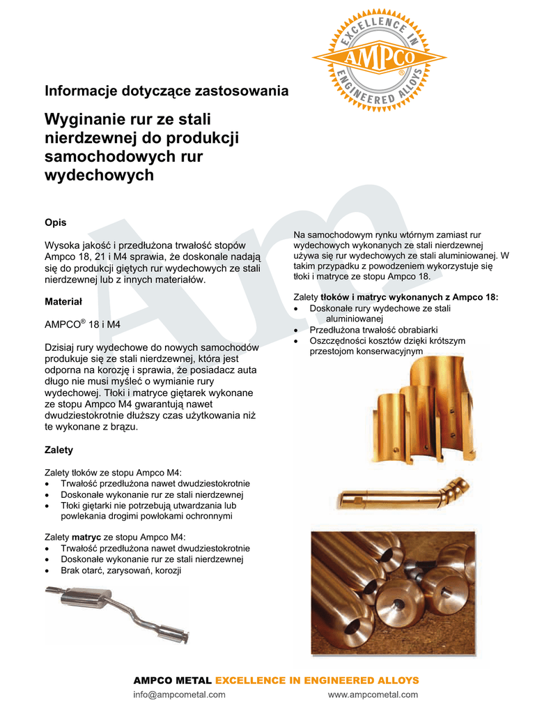 Informacje dotyczące zastosowania Wyginanie rur ze stali nierdzewnej do produkcji samochodowych rur wydechowych Opis Wysoka jakość i przedłużona trwałość stopów Ampco 18, 21 i M4 sprawia, że doskonale nadają się do produkcji giętych rur wydechowych ze stali nierdzewnej lub z innych materiałów. Materiał AMPCO® 18 i M4 Dzisiaj rury wydechowe do nowych samochodów produkuje się ze stali nierdzewnej, która jest odporna na korozję i sprawia, że posiadacz auta długo nie musi myśleć o wymianie rury wydechowej. Tłoki i matryce giętarek wykonane ze stopu Ampco M4 gwarantują nawet dwudziestokrotnie dłuższy czas użytkowania niż te wykonane z brązu. Zalety Zalety tłoków ze stopu Ampco M4: • Trwałość przedłużona nawet dwudziestokrotnie • Doskonałe wykonanie rur ze stali nierdzewnej • Tłoki giętarki nie potrzebują utwardzania lub powlekania drogimi powłokami ochronnymi Zalety matryc ze stopu Ampco M4: • Trwałość przedłużona nawet dwudziestokrotnie • Doskonałe wykonanie rur ze stali nierdzewnej • Brak otarć, zarysowań, korozji Na samochodowym rynku wtórnym zamiast rur wydechowych wykonanych ze stali nierdzewnej używa się rur wydechowych ze stali aluminiowanej. W takim przypadku z powodzeniem wykorzystuje się tłoki i matryce ze stopu Ampco 18. Zalety tłoków i matryc wykonanych z Ampco 18: • Doskonałe rury wydechowe ze stali aluminiowanej • Przedłużona trwałość obrabiarki • Oszczędności kosztów dzięki krótszym przestojom konserwacyjnym