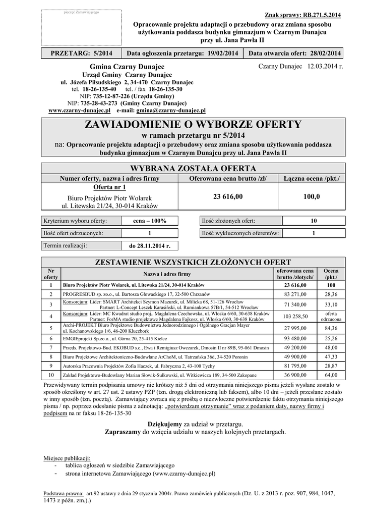 pieczęć Zamawiającego Znak sprawy: RB.271.5.2014 Opracowanie projektu adaptacji o przebudowy oraz zmiana sposobu użytkowania poddasza budynku gimnazjum w Czarnym Dunajcu przy ul. Jana Pawła II PRZETARG: 5/2014 Data ogłoszenia przetargu: 19/02/2014 Data otwarcia ofert: 28/02/2014 Czarny Dunajec 12.03.2014 r. Gmina Czarny Dunajec Urząd Gminy Czarny Dunajec ul. Józefa Piłsudskiego 2, 34-470 Czarny Dunajec tel. 18-26-135-40 tel. / fax 18-26-135-30 NIP: 735-12-87-226 (Urzędu Gminy) NIP: 735-28-43-273 (Gminy Czarny Dunajec) www.czarny-dunajec.pl e-mail: [email protected] ZAWIADOMIENIE O WYBORZE OFERTY w ramach przetargu nr 5/2014 na: Opracowanie projektu adaptacji o przebudowy oraz zmiana sposobu użytkowania poddasza budynku gimnazjum w Czarnym Dunajcu przy ul. Jana Pawła II WYBRANA ZOSTAŁA OFERTA Numer oferty, nazwa i adres firmy Oferta nr 1 Oferowana cena brutto /zł/ Łączna ocena /pkt./ Biuro Projektów Piotr Wolarek ul. Litewska 21/24, 30-014 Kraków 23 616,00 100,0 Kryterium wyboru oferty: Ilość ofert odrzuconych: Termin realizacji: cena – 100% 1 Ilość złożonych ofert: 10 Ilość wykluczonych oferentów: 1 do 28.11.2014 r. ZESTAWIENIE WSZYSTKICH ZŁOŻONYCH OFERT Nr Nazwa i adres firmy oferty Biuro Projektów Piotr Wolarek, ul. Litewska 21/24, 30-014 Kraków 1 2 PROGRESBUD sp. zo.o., ul. Bartosza Głowackiego 17, 32-500 Chrzanów oferowana cena brutto /złotych/ 23 616,00 Ocena /pkt./ 100 83 271,00 28,36 Konsorcjum: Lider: SMART Architekci Szymon Mazurek, ul. Milicka 68, 51-126 Wrocław Partner: L-Concept Leszek Karasiński, ul. Rumiankowa 57B/1, 54-512 Wrocław Konsorcjum: Lider: MC Kwadrat studio proj.. Magdalena Czechowska, ul. Włoska 6/60, 30-638 Kraków Partner: ForMA studio projektowe Magdalena Fajkosz, ul. Włoska 6/60, 30-638 Kraków Archi-PROJEKT Biuro Projektowe Budownictwa Jednorodzinnego i Ogólnego Gracjan Mayer ul. Kochanowskiego 1/6, 46-200 Kluczbork 71 340,00 33,10 103 258,50 oferta odrzucona 27 995,00 84,36 6 EMGIEprojekt Sp.zo.o., ul. Górna 20, 25-415 Kielce 93 480,00 25,26 7 Przeds. Projektowo-Bud. EKOBUD s.c., Ewa i Remigiusz Owczarek, Dmosin II nr 89B, 95-061 Dmosin 49 200,00 48,00 8 Biuro Projektowe Architektoniczno-Budowlane ArChoM, ul. Tatrzańska 36d, 34-520 Poronin 49 900,00 47,33 9 Autorska Pracownia Projektów Zofia Haczek, ul. Fabryczna 2, 43-100 Tychy 81 795,00 28,87 10 Zakład Projektowo-Budowlany Marian Słowik-Sułkowski, ul. Witkiewicza 189, 34-500 Zakopane 36 900,00 64,00 3 4 5 Przewidywany termin podpisania umowy nie krótszy niż 5 dni od otrzymania niniejszego pisma jeżeli wysłane zostało w sposób określony w art. 27 ust. 2 ustawy PZP (tzn. drogą elektroniczną lub faksem), albo 10 dni – jeżeli przesłane zostało w inny sposób (tzn. pocztą). Zamawiający zwraca się z prośbą o niezwłoczne potwierdzenie faktu otrzymania niniejszego pisma / np. poprzez odesłanie pisma z adnotacją: „potwierdzam otrzymanie” wraz z podaniem daty, nazwy firmy i podpisem na nr faksu 18-26-135-30 Dziękujemy za udział w przetargu. Zapraszamy do wzięcia udziału w naszych kolejnych przetargach. Miejsce publikacji: - tablica ogłoszeń w siedzibie Zamawiającego - strona internetowa Zamawiającego (www.czarny-dunajec.pl) Podstawa prawna: art.92 ustawy z dnia 29 stycznia 2004r. Prawo zamówień publicznych (Dz. U. z 2013 r. poz. 907, 984, 1047, 1473 z późn. zm.).) Informacja o ofertach odrzuconych: Numer oferty: 4 Nazwa firmy: konsorcjum firm w którym liderem jest firma MC Kwadrat studio projektowe Magdalena Czechowska a partnerem jest firma ForMA studio projektowe Magdalena Fajkosz Uzasadnienie prawne odrzucenia oferty: Działając na podstawie art. 89 ust. 1 pkt 5 ustawy - Prawo zamówień publicznych, dokonano odrzucenia oferty nr: 4 złożonej przez konsorcjum firm w którym liderem jest firma MC Kwadrat studio projektowe Magdalena Czechowska a partnerem jest firma ForMA studio projektowe Magdalena Fajkosz, gdyż została złożona przez wykonawcę wykluczonego z postępowania o udzielenie zamówienia. Uzasadnienie faktyczne odrzucenia oferty: Zamawiający w celu spełnienia warunków udziału w postępowaniu odnośnie wiedzy i doświadczenia, wymagał by Wykonawca wykonał w okresie ostatnich 3 lat przed dniem wszczęcia postępowania o udzielenie zamówienia, a jeżeli okres prowadzenia działalności jest krótszy – w tym okresie, z należytą starannością co najmniej jedną usługę odpowiadającą przedmiotowi zamówienia tj. polegającą na opracowaniu kompletnego projektu architektonicznobudowlanego, budowy, rozbudowy, przebudowy lub adaptacji budynku o łącznej powierzchni użytkowej co najmniej 600m2 lub kubaturze nie mniejszej niż 1 800 m. Wykonawca pomimo pisemnego wezwania nie uzupełnił oferty o brakujące dokumenty potwierdzające spełnienie postanowionego warunku. Nie spełnienie warunku udziału w postępowaniu, powoduje iż oferent podlega wykluczeniu z postępowania o udzielenie zamówienia. Zamawiający dokonał odrzucenia oferty nr: 4, złożonej przez konsorcjum firm w którym liderem jest firma MC Kwadrat studio projektowe Magdalena Czechowska a partnerem jest firma ForMA studio projektowe Magdalena Fajkosz, na podstawie art. 89 ust. 1 pkt 5 ustawy - Prawo zamówień publicznych.