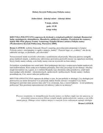 Debaty Krytyki Politycznej Polityka natury Jeden dzień – dziesięć miast – dziesięć debat. 9 maja, sobota godz. 19.30 wstęp wolny KRYTYKA POLITYCZNA zaprasza do dyskusji o związkach polityki i ekologii. Rozmawiać będą: socjologowie, dziennikarze, filozofowie, publicyści, ekolodzy. Pretekstem do rozmowy będzie film Wiek głupoty Franny Armstrong i książka Bruno Latoura Polityka natury (Wydawnictwo Krytyki Politycznej, Warszawa 2009). Bruno LATOUR, wybitny francuski filozof i socjolog, prowokacyjnie proponuje w książce Polityka natury: zrezygnujmy w ogóle z pojęcia „natury”. Przecież tego, co „z natury”, nie da się oddzielić od tego, co pochodzi „od człowieka”. Nowoczesność miała wyzwolić człowieka z uzależnienia od przyrody. Maszyna parowa zastąpiła pracę ludzkich mięśni, a elektryczny odświeżacz powietrza pozwolił cieszyć się zapachem morskiej bryzy, kiedy mamy ochotę, a nie kiedy mamy czas na wycieczki na łono natury. Za każdym wynalazkiem stoi sztab ludzi. Ktoś podejmuje decyzję o rozpoczęciu badań naukowych nad środowiskiem. Ktoś szuka na te badania pieniędzy, ktoś inny przyznaje na nie dotacje. Abyśmy mogli dowiedzieć się z gazet, że w dolinie Rospudy żyje chroniona żaba jeziorkowa, sztab ludzi musi podjąć setki działań – ekonomicznych, społecznych i politycznych. Światy natury i kultury przenikają się. Cóż, nawet żaba jest polityczna. KRYTYKA POLITYCZNA zaprasza do debaty o tym, ile jest polityki w ekologii. Czy ekologia jest prawicowa czy może lewicowa? Czy przyrody należy bronić zawsze i wszędzie? Czy może ekologowie powinni mieć jeszcze inne cele? Czy zwierzęta, lasy, a nawet bakterie – to też podmioty polityczne? Kto powinien reprezentować ich interesy i jakie to są interesy? Wszyscy rozumiemy, że skomplikowane kwestie natury czy kultury nigdy nas nie opuszczą, że przyszłość oznacza jeszcze bliższe związki między społeczeństwem i naturą, a nie tylko emancypację. Dlatego coraz większe miejsce w naszym życiu codziennym zajmuje ekologia. Bruno LATOUR Debaty Krytyki Politycznej Polityka natury Gdzie i kto będzie dyskutował Gdańsk Akademickie Centrum Kultury ul. Wita Stwosza 58 Dariusz Szwed (przewodniczący Zielonych 2004) dr Michał Kaczmarczyk (socjolog, Uniwersytet Gdański) Mikołaj Chrzan („Gazeta Wyborcza”) prowadzenie: Piotr Kozak (Krytyka Polityczna) Katowice kino Rialto, ul. Św. Jana 24 Jacek Bożek (założyciel i prezes Klubu Gaja) Przemysław Sadura (socjolog, publicysta, Krytyka Polityczna) Kraków Kino Pod Baranami Rynek Główny 27 Adam Ostolski (socjolog, filozof, Krytyka Polityczna) Michał Olszewski (pisarz, ekolog, publicysta, „Tygodnik Powszechny”) Jakub Majmurek (Krytyka Polityczna) Prowadzenie: Sebastian Liszka (Krytyka Polityczna) Lublin klubokawiarnia Archiwum, ul. Akademicka 4 Agnieszka Graff (pisarka, publicystka, feministka, Krytyka Polityczna) Agnieszka Grzybek (przewodnicząca Zielonych 2004) Zbigniew Wróblewski (filozof przyrody, KUL) Prowadzenie: Tomasz Kitliński (filozof) w Lublinie zaczynamy o 16.00. Na film i debatę wstęp wolny Łódź kino Charlie ul. Piotrkowska 203/205 Julia Michalak (koordynator kampanii klimatyczno-energetycznej Greenpeace) dr Jakub Kronenberg (Uniwersytet Łódzki) Michał Sobczyk („Obywatel”) Monika Dzięgielewska-Geitz (Lodz Integrated Restoration Institute) Prowadzenie: Jakub Bożek (Krytyka Polityczna) Debaty Krytyki Politycznej Polityka natury Poznań kino Muza ul. Św. Marcina 30 Karol Zamojski (socjolog) Robert Cyglicki (dyrektor Greenpeace Polska) Monika Bakke (filozof, UAM) Prowadzenie: Agnieszka Kowalczyk (Krytyka Polityczna) Szczecin kino Zamek, ul. Korsarzy 34 Marcin Kowalski (politolog, prezes Fundacji Kultury i Sportu „Prawobrzeże”) Wojciech Kłosowski (ekolog, Zieloni 2004) Michał Przypiera (dyrektor Wydziału Gospodarki Komunalnej i Ochrony Środowiska Urzędu Miasta Szczecina) Prowadzenie: Ewa Koś (ekolożka, feministka, Zieloni 2004) Toruń kino Centrum, CSW Znaki Czasu ul. Wały gen. Sikorskiego 13 dr Ewa Bińczyk (filozof przyrody z UMK w Toruniu) dr Krzysztof Abriszewski (socjolog, autor książki Poznanie, zbiorowość, polityka. Analiza teorii aktora - sieci Bruno Latoura) Krzysztof Ślebioda (Pracownia Zrównoważonego Rozwoju) Prowadzenie: Jarosław Wojtas (Krytyka Polityczna) Wrocław kino Warszawa ul. Marszałka J. Piłsudskiego 64 prof. Ludwik Tomiałojć (ekolog, wykładowca Uniwersytetu Wrocławskiego) dr Szymon Szewrański (wykładowca Uniwersytetu Przyrodniczego we Wrocławiu, Krytyka Polityczna) dr Marek Krukowski (Uniwersytet Przyrodniczy, Zieloni 2004) Prowadzenie: Roman Kurkiewicz (dziennikarz, Krytyka Polityczna) Warszawa Kinoteka, pl. Defilad 1 dr Maciej Gdula (autor wstępu do książki Bruno Latoura Polityka natury, Krytyka Polityczna) Ewa Smuk-Stratenwerth (antropolog, ekolog, stowarzyszenie „Ziarno”) prof. Magdalena Środa (etyk, filozof) prof. Maciej Nowicki (minister środowiska) Prowadzenie: Edwin Bendyk (tygodnik „Polityka”) Debaty Krytyki Politycznej Polityka natury WIEK GŁUPOTY Reżyseria: Franny Armstrong Wielka Brytania 2009 Jak będzie wyglądać Ziemia za 50 lat? W jakim miejscu znajdzie się człowiek? Czy spełni się katastroficzna wizja przyszłości: wody z roztopionych lodowców zaleją świat, oszalałe słońce wypali żyzne grunty, zapanuje wielki głód, a gatunki zaczną po kolei wymierać? Wiek głupoty to ambitnie zrealizowana próba przepowiedzenia naszej nieodległej przyszłości. Po kataklizmie ostatni z ludzi budują schron, w którym jak w biblijnej Arce, przechowywane są ostatnie okazy zwierząt, owadów i roślinności. Postać kustosza tego przedziwnego miejsca gra brytyjski aktor Pete Postlethwaite (znany polskiej widowni z Orkiestry i W imię ojca). Jest rok 2055, mężczyzna przegląda archiwalne materiały z przeszłości i stawia pytanie, dlaczego nie powstrzymaliśmy zmian klimatycznych na Ziemi, kiedy j