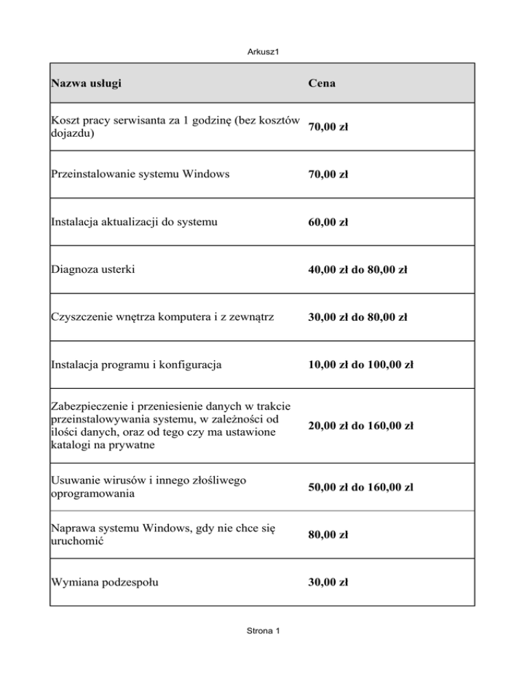 Arkusz1 Nazwa usługi Cena Koszt pracy serwisanta za 1 godzinę (bez kosztów 70,00 zł dojazdu) Przeinstalowanie systemu Windows 70,00 zł Instalacja aktualizacji do systemu 60,00 zł Diagnoza usterki 40,00 zł do 80,00 zł Czyszczenie wnętrza komputera i z zewnątrz 30,00 zł do 80,00 zł Instalacja programu i konfiguracja 10,00 zł do 100,00 zł Zabezpieczenie i przeniesienie danych w trakcie przeinstalowywania systemu, w zależności od ilości danych, oraz od tego czy ma ustawione katalogi na prywatne 20,00 zł do 160,00 zł Usuwanie wirusów i innego złośliwego oprogramowania 50,00 zł do 160,00 zl Naprawa systemu Windows, gdy nie chce się uruchomić 80,00 zł Wymiana podzespołu 30,00 zł Strona 1 Arkusz1 Wymiana płyty głównej (+ czasami koszty instalacji systemu na nowo) 80,00 zł Prace pozostałe płatne za 1 godzinę 70,00 zl Pierwsza konfiguracja zakupionego u nas routera 20,00 zł Każda kolejna konfiguracja routera 20,00 zl zarobienie końcówki RJ45 wraz dotarciem do klienta 10 zł/szt. (tylko osiedle 1MAJA) zarobienie końcówki RJ45 poza Osiedlem 1 Maja u klienta 10 zł/szt. plus dotarcie do klienta dojazd do klienta wg stawki za kilometr, która obowiązuje w danym roku kalendarzowym 2,50 zł spawanie światłowodu, wraz dotarciem do klienta w cenie 30,00 zł/1 spaw wg cennika wymiana okablowania wewnątrz lokalu klienta z winy lub na życzenie, klienta wg stawki za mb kabla plus zarobienie końcówek i dotarcie do klienta pierwsza konfiguracja routera kupionego w siedzibie firmy gratis każda kolejna konfiguracja routera w siedzibie firmy 10,00 zl Strona 2 Arkusz1 każda kolejna konfiguracja routera poza siedzibą firmy 20,00 zł (tylko osiedle 1 Maja) każda kolejna konfiguracja routera poza siedzibą firmy 20,00 zł plus koszty dotarcia Wymiana/naprawa Dysku USB PVR. Opłata za wydanie nowego lub naprawe zewnetrznego, dysku USB w miejsce uszkodzonego z winy Abonenta 300,00 zł Niezwrócenie/zniszczenie Dysku USB PVR. Opłata za niezwrócenie lub zniszczenie zewnetrznego dysku 300,00 zł USB z winy Abonenta Aktywacja Dekodera. Opłata za aktywacje jednego dekodera na potrzeby swiadczenia Usługi Telewizji w 200,00 zł tym Multiroom Wymiana/naprawa Dekodera. Opłata za wydanie nowego lub naprawe dekodera w miejsce uszkodzonego z winy Abonenta 400,00 zł Niezwrócenie/zniszczenie Dekodera. Opłata za niezwrócenie lub zniszczenie dekodera z winy Abonenta 400,00 zł Zasilacz do Dekodera. Opłata za niezwrócenie lub uszkodzenie zasilacza bedacego elementem wyposazenia dekodera 60,00 zł Pilot do obsługi Dekodera. Opłata za niezwrócenie lub uszkodzenie pilota bedacego elementem 40,00 zł wyposażenia dekodera Kabel HDMI/SCART Opłata za niezwrócenie lub uszkodzenie kabla HDMI/SCART bedacego elementem wyposazenia dekodera 20,00 zł Kabel do dysku USB Opłata za niezwrócenie lub uszkodzenie kabla do dysku USB 20,00 zł Strona 3 Arkusz1 Wykonanie innych usług wymagających pobytu u klienta Strona 4 70,00 zł (za godzinę)