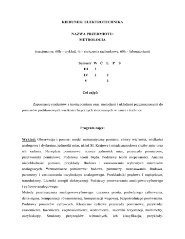 KIERUNEK: ELEKTROTECHNIKA NAZWA PRZEDMIOTU: METROLOGIA (stacjonarne: 60h – wykład, -h – ćwiczenia rachunkowe, 60h – laboratorium) Semestr W Ć L P III 2 IV 2 V S 2 2 Cel zajęć: Zapoznanie studentów z teorią pomiaru oraz metodami i układami przeznaczonymi do pomiarów podstawowych wielkości fizycznych stosowanych w nauce i technice. Program zajęć: Wykład: Obserwacja i pomiar: model matematyczny pomiaru, zbiory wielkości, wielkości analogowe i dyskretne, jednostki miar, układ SI. Krajowe i międzynarodowe służby miar oraz ich zadania. Narzędzia pomiarowe: wzorce jednostek miar, przyrządy pomiarowe, przetworniki pomiarowe. Podstawy teorii błędu. Podstawy teorii niepewności. Analiza niedokładności pomiaru, przykłady. Budowa i zastosowania wybranych mierników analogowych. Wzmacniacze pomiarowe: budowa, parametry, zastosowania. Budowa, parametry i zastosowania oscyloskopu analogowego. Przekładniki prądowe i napięciowe, transduktory. Liczniki energii elektrycznej. Podstawy przetwarzania analogowo-cyfrowego i cyfrowo-analogowego. Metody przetwarzania analogowo-cyfrowego: czasowa prosta, podwójnego całkowania, delta-sigma, kompensacji równomiernej, kompensacji wagowej, bezpośredniego porównania. Podstawy pomiarów cyfrowych. Klasyczne cyfrowe przyrządy pomiarowe, przykłady: czasomierze, fazomierze, częstościomierze, woltomierze, mierniki rezystancji, multimetry, oscyloskopy. Struktury przyrządów wirtualnych, ich klasyfikacja, przykłady. Oprogramowanie wirtualnych przyrządów pomiarowych w graficznym środowisku programowania LabVIEW. Cyfrowa rejestracja i analiza danych pomiarowych. Mostki prądu stałego i przemiennego oraz ich zastosowania metrologiczne. Pomiary kompensacyjne. Metody pomiarów wybranych wielkości elektrycznych. Metody pomiarów wybranych wielkości magnetycznych. Metody pomiarów wybranych wielkości nieelektrycznych metodami elektrycznymi. Klasyfikacja i struktury systemów pomiarowych. Laboratorium: Obsługa karty akwizycji danych pomiarowych w środowisku LabVIEW. Badania laboratoryjnych źródeł napięcia i prądu - LabVIEW. Pomiary techniczne oporności - LabVIEW. Pomiary oscyloskopem analogowym. Pomiary napięcia, prądu i mocy w obwodach jednofazowych - LabVIEW. Badania parametrów przekładnika prądowego. Sprawdzanie jednofazowego licznika energii elektrycznej. Badanie właściwości mostków czterogałęźnych. Zastosowania mostków prądu stałego. Cyfrowe pomiary częstotliwości i czasu. Badanie wzmacniacza pomiarowego - LabVIEW. Zastosowania kompensatorów prądu stałego. Wyznaczanie stratności magnetycznej oraz krzywych magnesowania aparatem Epsteina 25cm. Pomiary podstawowych wielkości magnetycznych. Pomiary odkształconych prądów i napięć - LabVIEW. Badania mierników analogowych. Pomiary mocy czynnej w sieci trójfazowej. Pomiary mocy biernej w sieci trójfazowej. Badanie przyrządów do pomiaru rezystancji uziemień oraz impedancji pętli zwarciowej. Pomiary parametrów dwójników napięcia pasywnych - LabVIEW. metodą trzech Wyznaczanie woltomierzy. charakterystyk Pomiary statycznych wielokrotne przetworników pomiarowych - LabVIEW. Literatura: 1. A. Chwaleba, M. Poniński, A. Siedlecki, Metrologia elektryczna, WNT, Warszawa 2003. 2. M. Stabrowski, Cyfrowe przyrządy pomiarowe, P.W.N., Warszawa 2002. 3. J. Jaworski, Niedokładność, błąd i niepewność pomiaru, Wyd. GUM, Warszawa 1999. 4. J. Dusza, G. Gortat, A. Leśniewski, Podstawy metrologii, Oficyna Wydawnicza Politechniki Warszawskiej, Warszawa 2004. 5. J. Piotrowski, Podstawy miernictwa, WNT, Warszawa 2002. 6. D. Świsulski, Komputerowa technika pomiarowa, Oprogramowanie wirtualnych przyrządów pomiarowych Warszawa 2005. w LabVIEW, Agenda Wydawnicza PAK-u,