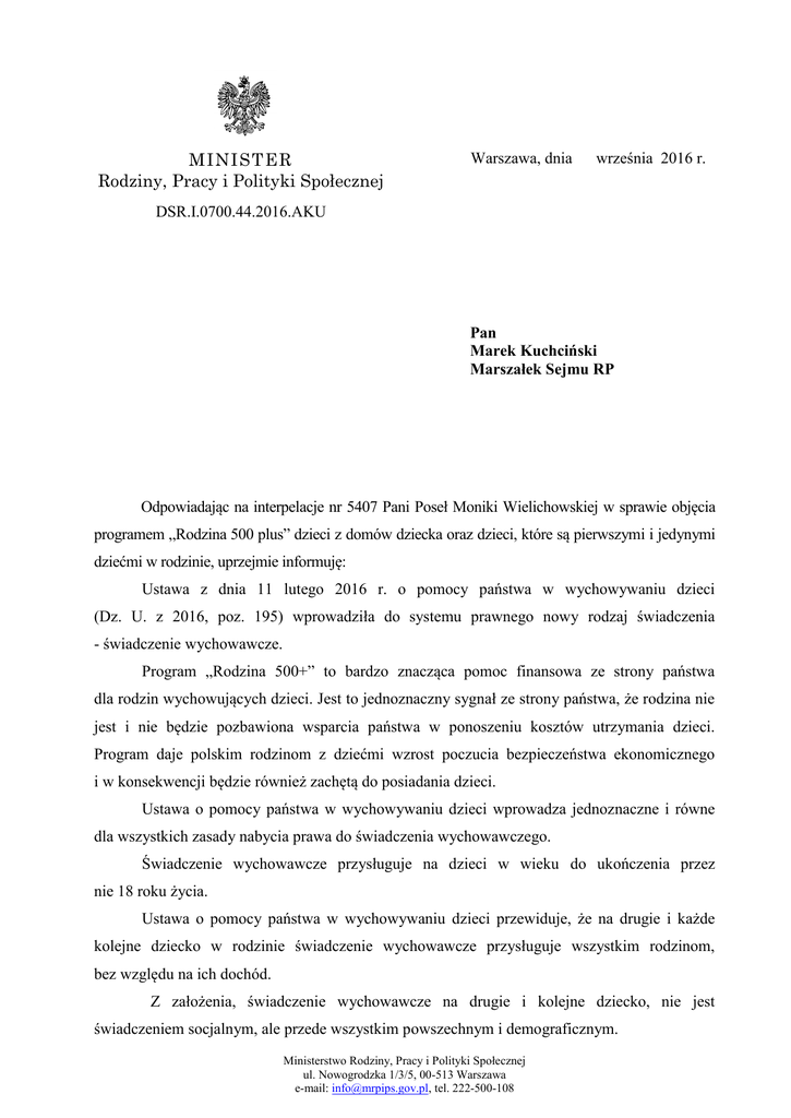 MINIST ER Rodziny, Pracy i Polityki Społecznej Warszawa, dnia września 2016 r. DSR.I.0700.44.2016.AKU Pan Marek Kuchciński Marszałek Sejmu RP Odpowiadając na interpelacje nr 5407 Pani Poseł Moniki Wielichowskiej w sprawie objęcia programem „Rodzina 500 plus” dzieci z domów dziecka oraz dzieci, które są pierwszymi i jedynymi dziećmi w rodzinie, uprzejmie informuję: Ustawa z dnia 11 lutego 2016 r. o pomocy państwa w wychowywaniu dzieci (Dz. U. z 2016, poz. 195) wprowadziła do systemu prawnego nowy rodzaj świadczenia - świadczenie wychowawcze. Program „Rodzina 500+” to bardzo znacząca pomoc finansowa ze strony państwa dla rodzin wychowujących dzieci. Jest to jednoznaczny sygnał ze strony państwa, że rodzina nie jest i nie będzie pozbawiona wsparcia państwa w ponoszeniu kosztów utrzymania dzieci. Program daje polskim rodzinom z dziećmi wzrost poczucia bezpieczeństwa ekonomicznego i w konsekwencji będzie również zachętą do posiadania dzieci. Ustawa o pomocy państwa w wychowywaniu dzieci wprowadza jednoznaczne i równe dla wszystkich zasady nabycia prawa do świadczenia wychowawczego. Świadczenie wychowawcze przysługuje na dzieci w wieku do ukończenia przez nie 18 roku życia. Ustawa o pomocy państwa w wychowywaniu dzieci przewiduje, że na drugie i każde kolejne dziecko w rodzinie świadczenie wychowawcze przysługuje wszystkim rodzinom, bez względu na ich dochód. Z założenia, świadczenie wychowawcze na drugie i kolejne dziecko, nie jest świadczeniem socjalnym, ale przede wszystkim powszechnym i demograficznym. Ministerstwo Rodziny, Pracy i Polityki Społecznej ul. Nowogrodzka 1/3/5, 00-513 Warszawa e-mail: [email protected], tel. 222-500-108 Jak wynika z przeprowadzonych badań społecznych 53% rodzin w Polsce posiada tylko jedno dziecko. Programu „Rodzina 500+” ma być impulsem, który zachęci te rodziny do podjęcia decyzji o posiadaniu jeszcze jednego dziecka poprzez zagwarantowanie dodatkowej, długofalowej pomocy finansowej ze strony państwa bez względu na osiągany przez rodzinę dochód. W obecnej sytuacji demograficznej Polski, każdy, nawet najmniejszy przyrost liczby urodzeń, jest pożądany i oczekiwany. Świadczenie wychowawcze przysługuje na pierwsze dziecko, definiowane jako jedyne lub najstarsze dziecko w rodzinie w wieku do ukończenia 18 roku życia, jeżeli przeciętny, miesięczny dochód rodziny w przeliczeniu na osobę, nie przekracza kwoty 800 zł lub 1200 zł jeżeli członkiem rodziny jest dziecko niepełnosprawne. Dla rodzin niezamożnych, wprowadzono, poprzez kryterium dochodowe, możliwość otrzymania świadczenia wychowawczego na pierwsze dziecko. Nieuprawnione jest zatem twierdzenie, że wsparcie rodzin najuboższych ma charakter dyskryminujący. Możliwość finansowanych z stosowania budżetu kryterium państwa nie dochodowego jest w sprzeczna przyznawaniu z Konstytucją, świadczeń w tym z art. 32 Konstytucji RP, i dotyczy również innych świadczeń o podobnym charakterze, np. świadczeń rodzinnych i świadczeń z pomocy społecznej. Rozwiązanie przewidziane w ramach ww. Programu nie jest przejawem nierównego traktowania osób znajdujących się w takiej samej lub podobnej sytuacji. Ustawowe warunki otrzymania świadczenia wychowawczego w ramach Programu „Rodzina 500+” są identyczne dla wszystkich zainteresowanych, tj. wszystkie rodziny obowiązuje kryterium dochodowe przy ustalaniu prawa do świadczenia na pierwsze dziecko, zaś na drugie i kolejne dzieci kryterium dochodowe nie obowiązuje. Rozszerzenie prawa do świadczenia wychowawczego, bez kryterium dochodowego, także na pierwsze dziecko, w tym na rodziny z jednym dzieckiem wiązałoby się z dodatkowymi wydatkami budżetu państwa na poziomie ponad 14 mld zł w 2016 r., natomiast w 2017 r. - ponad 19 mld zł, które obecnie są niemożliwe do sfinansowania. Jednocześnie uprzejmie informuję, że Minister Rodziny, Pracy i Polityki Społecznej planuje dokonać, nie później niż w ciągu 12 miesięcy od uruchomienia Programu „Rodzina 500+” jego przeglądu, który obejmie między innymi ocenę realizacji założeń ww. Programu oraz wpływu świadczenia wychowawczego na polskie rodziny. Analizowane będą również, uwzględniając możliwości budżetowe, ewentualne możliwości rozszerzenia liczby osób uprawnionych do świadczenia wychowawczego. Przegląd ten obejmie także inne systemy Ministerstwo Rodziny, Pracy i Polityki Społecznej ul. Nowogrodzka 1/3/5, 00-513 Warszawa e-mail: [email protected], tel. 222-500-108 wsparcia materialnego rodzin (m.in. system świadczeń rodzinnych oraz świadczeń z funduszu alimentacyjnego). Ponadto odnosząc się do drugiej kwestii poruszanej przez Panią Poseł dotyczącej dodatku wychowawczego dla dzieci umieszczonych w placówkach opiekuńczo-wychowawczych innych, aniżeli typu rodzinnego informuję, iż: w związku wejściem w życie z dniem 1 kwietnia 2016 r. ustawy o pomocy państwa w wychowywaniu dzieci wprowadzającej zmiany w ustawie z dnia 9 czerwca 2011 r. o wspieraniu rodziny i systemie pieczy zastępczej (Dz. U. z 2016 r. poz. 575) na każde dziecko w wieku do ukończenia 18 roku życia, umieszczone w rodzinie zastępczej, rodzinnym domu dziecka oraz placówce opiekuńczo-wychowawczej typu rodzinnego, przysługuje dodatek w wysokości świadczenia wychowawczego określonego w przepisach o pomocy państwa w wychowywaniu dzieci, przy czym ustawodawca rozróżnia dodatek wychowawczy i dodatek do zryczałtowanej kwoty, o którym mowa w art. 115 ust. 2a ustawy o wspieraniu rodziny i systemie pieczy zastępczej. Dodatek wychowawczy, zgodnie z intencją ustawodawcy, przysługuje rodzinom biologicznym dzieci na wsparcie wydatków bieżących związanych z ich wychowaniem. Analogicznie został on wprowadzony również dla osób wychowujących dzieci w rodzinnych formach pieczy zastępczej, tj. w rodzinach zastępczych, rodzinnych domach dziecka oraz w placówkach opiekuńczo-wychowaw
