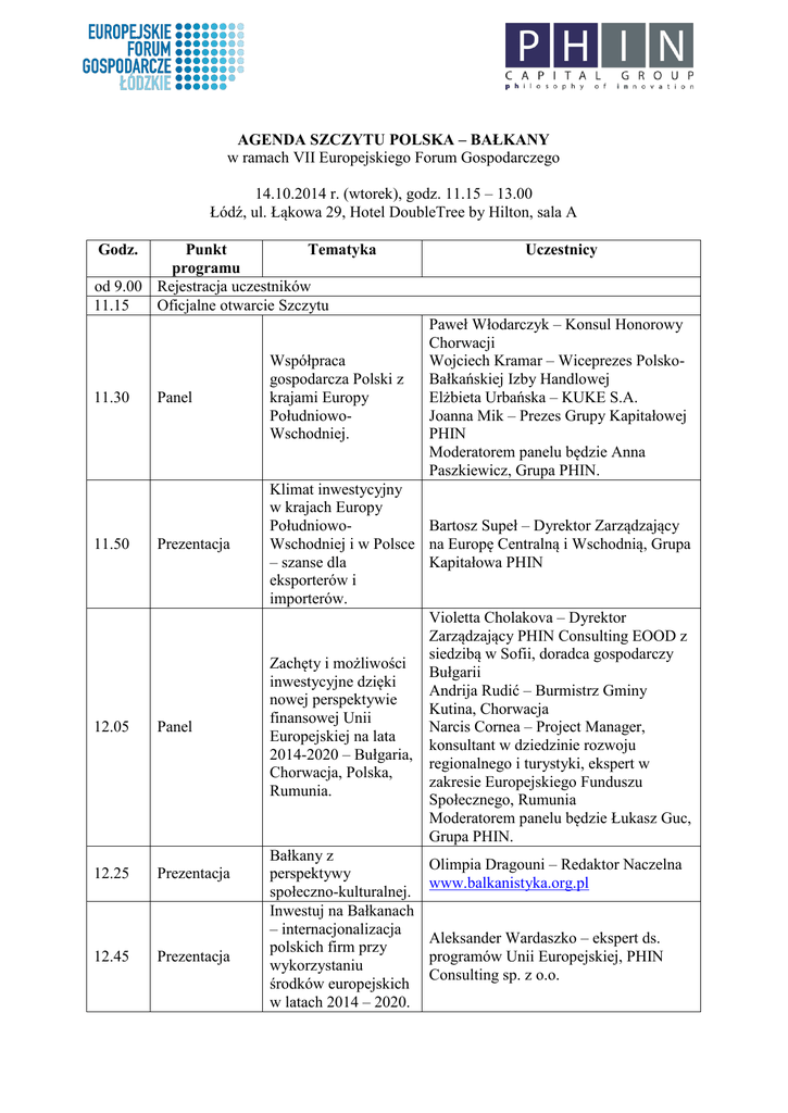 AGENDA SZCZYTU POLSKA – BAŁKANY w ramach VII Europejskiego Forum Gospodarczego 14.10.2014 r. (wtorek), godz. 11.15 – 13.00 Łódź, ul. Łąkowa 29, Hotel DoubleTree by Hilton, sala A Godz. Punkt Tematyka programu od 9.00 Rejestracja uczestników 11.15 Oficjalne otwarcie Szczytu 11.30 Panel 11.50 Prezentacja 12.05 Panel 12.25 Prezentacja 12.45 Prezentacja Współpraca gospodarcza Polski z krajami Europy PołudniowoWschodniej. Uczestnicy Paweł Włodarczyk – Konsul Honorowy Chorwacji Wojciech Kramar – Wiceprezes PolskoBałkańskiej Izby Handlowej Elżbieta Urbańska – KUKE S.A. Joanna Mik – Prezes Grupy Kapitałowej PHIN Moderatorem panelu będzie Anna Paszkiewicz, Grupa PHIN. Klimat inwestycyjny w krajach Europy PołudniowoBartosz Supeł – Dyrektor Zarządzający Wschodniej i w Polsce na Europę Centralną i Wschodnią, Grupa – szanse dla Kapitałowa PHIN eksporterów i importerów. Violetta Cholakova – Dyrektor Zarządzający PHIN Consulting EOOD z siedzibą w Sofii, doradca gospodarczy Zachęty i możliwości Bułgarii inwestycyjne dzięki Andrija Rudić – Burmistrz Gminy nowej perspektywie Kutina, Chorwacja finansowej Unii Narcis Cornea – Project Manager, Europejskiej na lata konsultant w dziedzinie rozwoju 2014-2020 – Bułgaria, regionalnego i turystyki, ekspert w Chorwacja, Polska, zakresie Europejskiego Funduszu Rumunia. Społecznego, Rumunia Moderatorem panelu będzie Łukasz Guc, Grupa PHIN. Bałkany z Olimpia Dragouni – Redaktor Naczelna perspektywy www.balkanistyka.org.pl społeczno-kulturalnej. Inwestuj na Bałkanach – internacjonalizacja Aleksander Wardaszko – ekspert ds. polskich firm przy programów Unii Europejskiej, PHIN wykorzystaniu Consulting sp. z o.o. środków europejskich w latach 2014 – 2020. 13.00 13.0014.00 Indywidualne rozmowy z panelistami i ekspertami. Lunch Szczyt Polska-Bałkany to dla polskich firm znakomita okazja na poznanie specyfiki rynku krajów bałkańskich. Szczyt obejmuje dwie eksperckie rozmowy panelowe oraz trzy merytoryczne prezentacje. Jest adresowany głównie do małych i średnich przedsiębiorstw. Program Szczytu dotyczy realiów funkcjonowania firm na rynkach państw bałkańskich. Poczynając od możliwości pozyskania partnerów biznesowych, procedur związanych z rejestracją działalności gospodarczej oraz wyboru optymalnej formy prawnej tej działalności. Będzie o tym, jak inwestuje się na Bałkanach i jak prowadzi się tam biznes. W Szczycie wezmą udział firmy, które prowadzą już swoją działalność na Bałkanach. Wśród panelistów i ekspertów są doradcy gospodarczy z Chorwacji, Rumunii i Bułgarii. Konsulowie honorowi i przedstawiciele administracji samorządowej z Chorwacji. Specjaliści z Korporacji Ubezpieczeń Kredytów Eksportowych. Głos zabiorą eksperci ds. funduszy unijnych – pokażą możliwości uzyskania przez firmy dofinansowania w perspektywie 2014 – 2020. Swój udział zapowiedział wiceprezes PolskoBałkańskiej Izby Handlowej. Gościem będzie ambasador Bułgarii. Ministerstwo gospodarki ogłosiło w tym roku program promocyjnego wsparcia polskich firm, planujących rozpoczęcie współpracy gospodarczej m.in. z krajami bałkańskimi. Wśród 11 nowych rynków eksportowych wskazanych przez ministerstwo znalazły się m.in.: Chorwacja, Serbia, Bośnia i Hercegowina oraz Macedonia. Szczyt rozpocznie się o godzinie 11.15 i potrwa do 13.00. Sala A Hotelu DoubleTree by Hilton. Wszyscy eksperci będą dostępni dla osób zainteresowanych rozmowami bezpośrednimi tuż po zakończeniu części merytorycznej. Szczyt organizuje Grupa Kapitałowa PHIN, działająca na rynkach Polski, Bułgarii, Chorwacji i Rumunii. Portal www.balkanistyka.org objął wydarzenie swoim patronatem. Szanowni Państwo, Szczyt jest wydarzeniem towarzyszącym VII Europejskiemu Forum Gospodarczemu Łódzkie 2014. Oferta Forum jest szeroka. Serdecznie zapraszamy na stronę dedykowaną wydarzeniu: www.efg2014.pl. Anna Paszkiewicz PR Manager PHIN Group Sp. o.o. tel. 668 117 642 e-mail: [email protected]