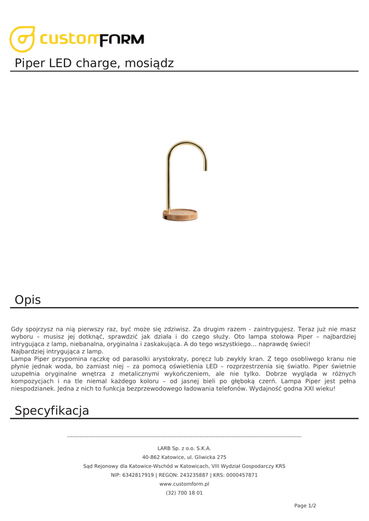 Piper LED charge, mosiądz Opis Gdy spojrzysz na nią pierwszy raz, być może się zdziwisz. Za drugim razem - zaintrygujesz. Teraz już nie masz wyboru – musisz jej dotknąć, sprawdzić jak działa i do czego służy. Oto lampa stołowa Piper – najbardziej intrygująca z lamp, niebanalna, oryginalna i zaskakująca. A do tego wszystkiego… naprawdę świeci! Najbardziej intrygująca z lamp. Lampa Piper przypomina rączkę od parasolki arystokraty, poręcz lub zwykły kran. Z tego osobliwego kranu nie płynie jednak woda, bo zamiast niej – za pomocą oświetlenia LED – rozprzestrzenia się światło. Piper świetnie uzupełnia oryginalne wnętrza z metalicznymi wykończeniem, ale nie tylko. Dobrze wygląda w różnych kompozycjach i na tle niemal każdego koloru – od jasnej bieli po głęboką czerń. Lampa Piper jest pełna niespodzianek. Jedna z nich to funkcja bezprzewodowego ładowania telefonów. Wydajność godna XXI wieku! Specyfikacja ----------------------------------------------------------------------------------------------------------------------------------LARB Sp. z o.o. S.K.A. 40-862 Katowice, ul. Gliwicka 275 Sąd Rejonowy dla Katowice-Wschód w Katowicach, VIII Wydział Gospodarczy KRS NIP: 6342817919 | REGON: 243235887 | KRS: 0000457871 www.customform.pl (32) 700 18 01 Page 1/2 Wysokość 41 cm Gwint żarówki LED Średnica 20 cm Moc żarówki max 2W Ilość żarówek 1 Podstawa drewno Klosz metal Dodatkowe zdjęcia ----------------------------------------------------------------------------------------------------------------------------------LARB Sp. z o.o. S.K.A. 40-862 Katowice, ul. Gliwicka 275 Sąd Rejonowy dla Katowice-Wschód w Katowicach, VIII Wydział Gospodarczy KRS NIP: 6342817919 | REGON: 243235887 | KRS: 0000457871 www.customform.pl (32) 700 18 01 Page 2/2 Powered by TCPDF (www.tcpdf.org)