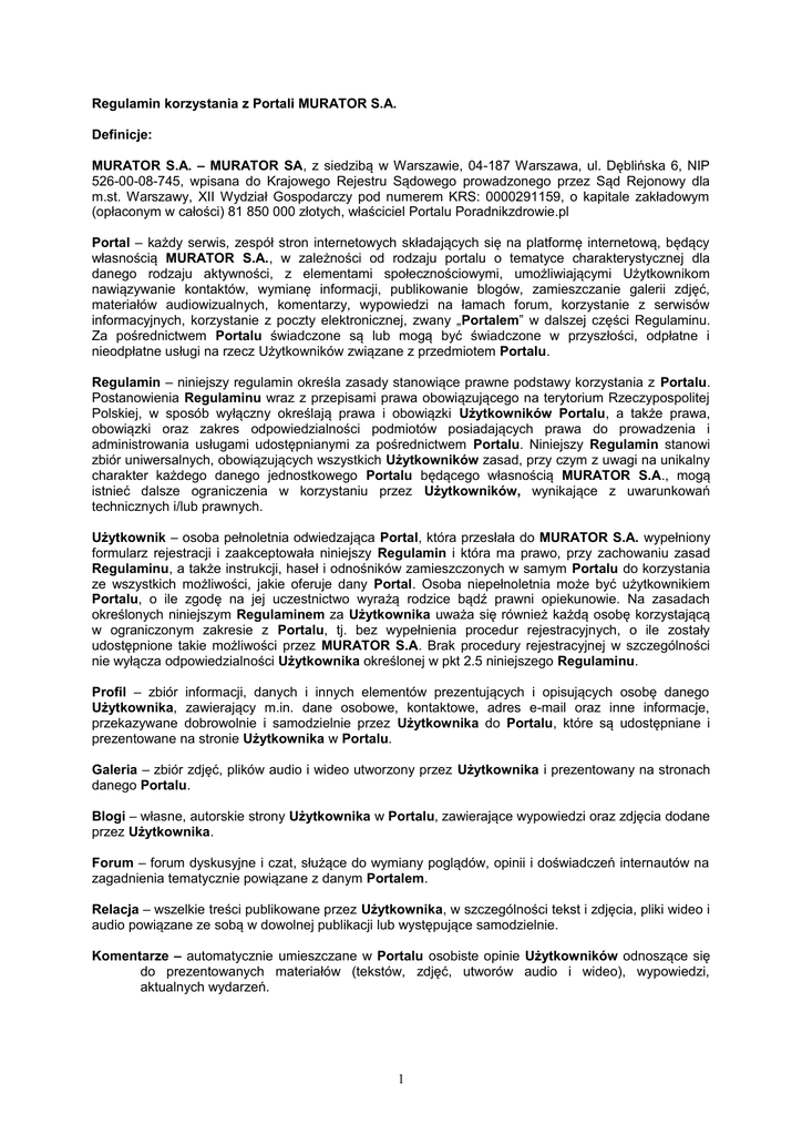 Regulamin korzystania z Portali MURATOR S.A. Definicje: MURATOR S.A. – MURATOR SA, z siedzibą w Warszawie, 04-187 Warszawa, ul. Dęblińska 6, NIP 526-00-08-745, wpisana do Krajowego Rejestru Sądowego prowadzonego przez Sąd Rejonowy dla m.st. Warszawy, XII Wydział Gospodarczy pod numerem KRS: 0000291159, o kapitale zakładowym (opłaconym w całości) 81 850 000 złotych, właściciel Portalu Poradnikzdrowie.pl Portal – każdy serwis, zespół stron internetowych składających się na platformę internetową, będący własnością MURATOR S.A., w zależności od rodzaju portalu o tematyce charakterystycznej dla danego rodzaju aktywności, z elementami społecznościowymi, umożliwiającymi Użytkownikom nawiązywanie kontaktów, wymianę informacji, publikowanie blogów, zamieszczanie galerii zdjęć, materiałów audiowizualnych, komentarzy, wypowiedzi na łamach forum, korzystanie z serwisów informacyjnych, korzystanie z poczty elektronicznej, zwany „Portalem” w dalszej części Regulaminu. Za pośrednictwem Portalu świadczone są lub mogą być świadczone w przyszłości, odpłatne i nieodpłatne usługi na rzecz Użytkowników związane z przedmiotem Portalu. Regulamin – niniejszy regulamin określa zasady stanowiące prawne podstawy korzystania z Portalu. Postanowienia Regulaminu wraz z przepisami prawa obowiązującego na terytorium Rzeczypospolitej Polskiej, w sposób wyłączny określają prawa i obowiązki Użytkowników Portalu, a także prawa, obowiązki oraz zakres odpowiedzialności podmiotów posiadających prawa do prowadzenia i administrowania usługami udostępnianymi za pośrednictwem Portalu. Niniejszy Regulamin stanowi zbiór uniwersalnych, obowiązujących wszystkich Użytkowników zasad, przy czym z uwagi na unikalny charakter każdego danego jednostkowego Portalu będącego własnością MURATOR S.A., mogą istnieć dalsze ograniczenia w korzystaniu przez Użytkowników, wynikające z uwarunkowań technicznych i/lub prawnych. Użytkownik – osoba pełnoletnia odwiedzająca Portal, która przesłała do MURATOR S.A. wypełniony formularz rejestracji i zaakceptowała niniejszy Regulamin i która ma prawo, przy zachowaniu zasad Regulaminu, a także instrukcji, haseł i odnośników zamieszczonych w samym Portalu do korzystania ze wszystkich możliwości, jakie oferuje dany Portal. Osoba niepełnoletnia może być użytkownikiem Portalu, o ile zgodę na jej uczestnictwo wyrażą rodzice bądź prawni opiekunowie. Na zasadach określonych niniejszym Regulaminem za Użytkownika uważa się również każdą osobę korzystającą w ograniczonym zakresie z Portalu, tj. bez wypełnienia procedur rejestracyjnych, o ile zostały udostępnione takie możliwości przez MURATOR S.A. Brak procedury rejestracyjnej w szczególności nie wyłącza odpowiedzialności Użytkownika określonej w pkt 2.5 niniejszego Regulaminu. Profil – zbiór informacji, danych i innych elementów prezentujących i opisujących osobę danego Użytkownika, zawierający m.in. dane osobowe, kontaktowe, adres e-mail oraz inne informacje, przekazywane dobrowolnie i samodzielnie przez Użytkownika do Portalu, które są udostępniane i prezentowane na stronie Użytkownika w Portalu. Galeria – zbiór zdjęć, plików audio i wideo utworzony przez Użytkownika i prezentowany na stronach danego Portalu. Blogi – własne, autorskie strony Użytkownika w Portalu, zawierające wypowiedzi oraz zdjęcia dodane przez Użytkownika. Forum – forum dyskusyjne i czat, służące do wymiany poglądów, opinii i doświadczeń internautów na zagadnienia tematycznie powiązane z danym Portalem. Relacja – wszelkie treści publikowane przez Użytkownika, w szczególności tekst i zdjęcia, pliki wideo i audio powiązane ze sobą w dowolnej publikacji lub występujące samodzielnie. Komentarze – automatycznie umieszczane w Portalu osobiste opinie Użytkowników odnoszące się do prezentowanych materiałów (tekstów, zdjęć, utworów audio i wideo), wypowiedzi, aktualnych wydarzeń. 1 Materiały – wszelkie materiały zamieszczane na stronach Portalu przez Użytkownika w formie tekstowej (wypowiedzi, komentarze, opinie i inne), zdjęć, plików audio i wideo, grafik, map oraz innych akceptowalnych niniejszym Regulaminem. I. PRAWA I OBOWIĄZKI Użytkownik: 1.1 Użytkownik zobowiązany jest do przekazania MURATOR S.A. wypełnionego formularza rejestracji*. Każde zalogowanie się na stronę Portalu przez Użytkownika jest równoznaczne z akceptacją niniejszego Regulaminu. Rejestracja w Portalu jest dobrowolna i bezpłatna. 1.2 Użytkownik jest zobowiązany do korzystania z Portalu w sposób, który nie narusza przepisów prawa, praw osób trzecich, zasad współżycia społecznego oraz niniejszego Regulaminu. 1.3 Użytkownik jest zobowiązany do powstrzymania się od jakichkolwiek działań mogących utrudnić lub zakłócić funkcjonowanie Portalu oraz korzystania z Portalu w sposób uciążliwy dla innych Użytkowników. II. Zamieszczanie galerii, blogów, zdjęć, relacji, komentarzy: 2.1 Warunkiem zamieszczenia galerii, blogów, zdjęć, relacji, komentarzy w danym Portalu jest skuteczne wypełnienie formularza rejestracyjnego w celu założenia indywidualnego Profilu Użytkownika oraz zaakceptowanie Regulaminu, który zawiera zapewnienie dotyczące praw autorskich i zgodę na wykorzystanie galerii, blogów, zdjęć, relacji, komentarzy przez MURATOR S.A. na zasadach określonych w niniejszym Regulaminie. 2.2 Wypełnienie formularza przez Użytkownika jest równoznaczne z Jego oświadczeniem, że: a) podane w formularzu dane są kompletne i zgodne ze stanem faktycznym (Użytkownik jest zobowiązany we wszystkich formularzach do podawania prawdziwych danych określających jego osobę i zamieszczane blogi, zdjęcia, wypowiedzi, komentarze); b) Użytkownik zapoznał się z Regulaminem i zobowiązuje się do przestrzegania jego zasad. 2.3 Użytkownik ma prawo do posiadania wyłącznie jednego 