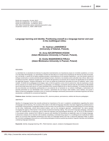 Oceánide 6 Fecha de recepción: 8 julio 2013 Fecha de aceptación: 11 octubre 2013 Fecha de publicación: 10 febrero 2014 URL:http://oceanide.netne.net/articulos/art6-2.php Oceánide número 6, ISSN 1989-6328 Language learning and identity: Positioning oneself as a language learner and user in the multilingual milieu Dr. Hadrian LANKIEWICZ (University of Gdańsk, Poland), Dr. Anna SZCZEPANIAK-KOZAK (Adam Mickiewicz University in Poznań, Poland), Dr. Emilia WĄSIKIEWICZ-FIRLEJ (Adam Mickiewicz University in Poznań, Poland) RESUMEN: La identidad de un estudiante de idiomas ha adquirido recientemente una importancia propia en el ámbito académico, en torno a la naturaleza del lenguaje y su aprendizaje. El éxito de esta idea en el campo de la enseñanza de idiomas ha sido provocado, por una banda, a causa de los logros postestructurales o posmodernos en los estudios lingüísticos, y por otra banda, gracias al enfoque constructivo o construccionista del aprendizaje humano. Asimismo, los estudios socio-culturales más críticos, tales como el enfoque ecocrítico, destacan el papel activo y relevante del aprendiz en el proceso de la creación de significados en el contexto de segundas lenguas / lenguas extranjeras, por lo que se señala las limitaciones derivadas de tomar al hablante ‘nativo’ como modelo. El ámbito de la pedagogía de la lengua, bajo un término genérico como el de la autonomía, trata de explicarse a través de los avances en el campo de la lingüística y la psicología, sin embargo, el presente artículo trata de demostrar las dificultades que el alumnado tiene para asumir su nueva identidad como usuarios legítimos de un idioma extranjero. Un análisis del discurso de una entrevista con estudiantes participantes en una estancia de un semestre en un entorno multilingüe y multicultural nos permite profundizar en sus identidades como usuarios y aprendices de una lengua. Este análisis, como método, nos ayuda a definir el discurso pedagógico normativo como un constructo ideológico dominante posicionando la identidad lingüística de dichos estudiantes y exhibiendo su consciencia lingüística. Palabras clave: identidad, docencia de idiomas, EFL, alumnos polacos, permanencia, análisis del discurso pedagógico ABSTRACT: Identity of a language learner has recently achieved an importance of its own in academic considerations regarding the nature of language and its learning. The success of the notion in the field of language education has been triggered by poststructural or postmodern achievements in language studies on the one hand, and constructive or constructionist approaches to human learning on the other. Additionally, critical socio-cultural studies, such as the ecological approach, “assassinated” the native speaker envisaging the agency of the learner in the process of personal meaning making. The concurrent language pedagogy, subsumed under the umbrella term of autonomy, tries to meet the linguistics and psychological advances, yet, as we try to demonstrate it in the present article, students find it difficult to assume new identities for themselves as legitimate users of a foreign language. A discursive analysis of an interview with students completing a semester-long sojourn in a multilingual and multicultural milieu allows us to pursue their identities pertaining to the roles of a language learner and user. A discourse approach helps us define the normative pedagogical discourse as a dominating ideological construct positioning students’ linguistic identities and exhibiting underlying language awareness. Keywords: identity, language learning, EFL, Polish learners, sojourn, analysis of pedagogical discourse URL:http://oceanide.netne.net/articulos/art6-2.php 2014 Oceánide 6 1. THEORETICAL STANCE: IDENTITY AND LANGUAGE LEARNING By the present undertaking we aim, in most general terms, to elaborate on the relationship between foreign language (FL)1 learning and identity. To pursue our objective, we decided to use discourse analysis as a method for our considerations (cf. Jorgensen and Phillips 2002). Before we delve into the empirical part, we present our theoretical stance. This is to prevent possible misunderstandings and to override some critical interpretations during reading. Theoretical underpinnings to language learning ascribe more and more attention to the issue of identity. Sociocultural approaches to language and its learning, and more critical ones such as the ecological approach (cf. van Lier, 2004) draw on poststructural or postmodern theories which accentuate the agency of the language learner and, ultimately, language user. Making a foreign language learner the subject and creator of the form and meaning of utterances, the newly emerging paradigm and accompanying discourse2 necessitates conceptual changes in the era of the death of the native speaker, “assassinated” both in the field of academic language reflection and pedagogy (cf. Szczepaniak-Kozak and Wąsikiewicz-Firlej, 2013). This, in turn, envisages new identities for the learner as a corollary of the changes. Nonetheless, as we will demonstrate in the empirical part, the perception of new identities by students is rather slow, underscoring deeply engrained cognitive normativity in language education (as exhibited by our discourse analysis) with a concurrent language awareness shaped by the hegemony of normative, pedagogical discourse. In the theoretical part, we consider, respectively, the newly emerging paradigm in the field of language teaching, plurilingualism and languaging, identity and language awareness and, finally, discursive nature of identity itself, all as a frame of reference for the analytical part. 1.1 Shift paradigm in the methodological The shortcomings of the communicative approach based on the assumption of appropriacy, as documented by Fairclough (1992), inspired the Council of Europe to redefine the language policy underlying the communicative paradigm