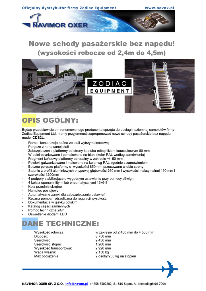 Oficjalny dystrybuto r firmy Zodiac Equipment www .n avo x .p l Nowe schody pasażerskie bez napędu! (wysokości robocze od 2,4m do 4,5m) OPIS OGÓLNY: Będąc przedstawicielem renomowanego producenta sprzętu do obsługi naziemnej samolotów firmy Zodiac Equipment Ltd. mamy przyjemność zaproponować nowe schody pasażerskie bez napędu, model CDS2L. - Rama i konstrukcja nośna ze stali wytrzymałościowej - Poręcze z hartowanej stali - Zabezpieczenie platformy od strony kadłuba odbojnikiem kauczukowym 80 mm - W pełni ocynkowane i pomalowane na biało (kolor RAL według zamówienia) - Fragment końcowy platformy obracalny w zakresie +/- 50 mm - Powłoki galwanizowane i malowane na kolor wg RAL zgodnie z zamówieniem - Boczne poręcze platformy o wysokości 850mm, przesuwane w obie strony - Stopnie z profili aluminiowych o typowej głębokości 260 mm i wysokości maksymalnej 190 mm i szerokości 1200mm - 4 podpory stabilizujące o wygodnym ustawianiu przy pomocy dźwigni - 4 koła z oponami litymi lub pneumatycznymi 16x6-8 - Koła przednie skrętne - Hamulec postojowy - Automatyczne zamki dla zabezpieczania ustawień - Ręczna pompa hydrauliczna do regulacji wysokości - Dokumentacja w języku polskim - Katalog części zamiennych - Pomoc techniczna 24/h - Oświetlenie diodami LED DANE TECHNICZNE: Wysokość robocza: Długość: Szerokość: Szerokość stopni: Wysokość transportowa: Waga własna: Max obciążenie: w zakresie od 2 400 mm do 4 500 mm 8.750 mm 2.450 mm 1.200 mm 2.920 mm 2.150 kg 2 osoby/200 kg na stopień NAVIMOR OXER SP. Z O.O. [email protected] +4858 5507802, 81-810 Sopot, Al. Niepodległości 799A Oficjalny dystrybuto r firmy Zodiac Equipment Max obciążenie Stabilność przy bocznym wietrze: Dopuszczalna temperatura: www .n avo x .p l przodu platformy 5 osób/500kg do 45 węzłów -25C +45C NAVIMOR OXER SP. Z O.O. [email protected] +4858 5507802, 81-810 Sopot, Al. Niepodległości 799A Oficjalny dystrybuto r firmy Zodiac Equipment www .n avo x .p l Opcje: Pompa hydrauliczna do regulacji wysokości z napędem elektrycznym + 1370,--EUR Hydraulicznie wysuwane stabilizatory + 1914,-- EUR Zadaszenie + 2800,-- EUR Dach z bocznymi panelami z pleksi + 4690,-- EUR Elektro-hydrauliczne system dokładnego ustawiania schodów + 4700,-- EUR Hydrauliczno-Diesel system dokładnego ustawiania schodów + 5600,-- EUR Taśmy uniemożliwiające przejście + 250,- EUR Kogut alarmowy *) + 70,- EUR Szperacz *) + 62,- EUR *) Kogut i szperacz tylko z systemami elektrycznymi NAVIMOR OXER SP. Z O.O. [email protected] +4858 5507802, 81-810 Sopot, Al. Niepodległości 799A