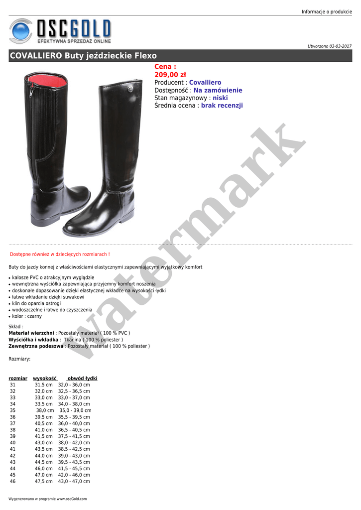 Informacje o produkcie Utworzono 03-03-2017 COVALLIERO Buty jeździeckie Flexo Cena : 209,00 zł er m ar k Producent : Covalliero Dostępność : Na zamówienie Stan magazynowy : niski Średnia ocena : brak recenzji Dostępne również w dziecięcych rozmiarach ! Buty do jazdy konnej z właściwościami elastycznymi zapewniającymi wyjątkowy komfort ● ● ● ● ● ● kalosze PVC o atrakcyjnym wyglądzie wewnętrzna wyściółka zapewniająca przyjemny komfort noszenia doskonałe dopasowanie dzięki elastycznej wkładce na wysokości łydki łatwe wkładanie dzięki suwakowi klin do oparcia ostrogi wodoszczelne i łatwe do czyszczenia kolor : czarny at ● w Skład : Materiał wierzchni : Pozostały materiał ( 100 % PVC ) Wyściółka i wkładka : Tkanina ( 100 % poliester ) Zewnętrzna podeszwa : Pozostały materiał ( 100 % poliester ) Rozmiary: rozmiar 31 32 33 34 35 36 37 38 39 40 41 42 43 44 45 46 wysokość 31,5 cm 32,0 cm 33,0 cm 33,5 cm 38,0 cm 39,5 cm 40,5 cm 41,0 cm 41,5 cm 43,0 cm 43,5 cm 44,0 cm 44,5 cm 46,0 cm 47,0 cm 47,5 cm obwód łydki 32,0 - 36,0 cm 32,5 - 36,5 cm 33,0 - 37,0 cm 34,0 - 38,0 cm 35,0 - 39,0 cm 35,5 - 39,5 cm 36,0 - 40,0 cm 36,5 - 40,5 cm 37,5 - 41,5 cm 38,0 - 42,0 cm 38,5 - 42,5 cm 39,0 - 43,0 cm 39,5 - 43,5 cm 41,5 - 45,5 cm 42,0 - 46,0 cm 43,0 - 47,0 cm Wygenerowano w programie www.oscGold.com Dostępne opcje COVALLIERO Buty jeździeckie Flexo w at er m ar k » Rozmiar 34-44: 31, 32, 33, 34, 35, 36, 37, 38, 39, 40, 44, 41, 42, 45, 43, 44, 45, 46.
