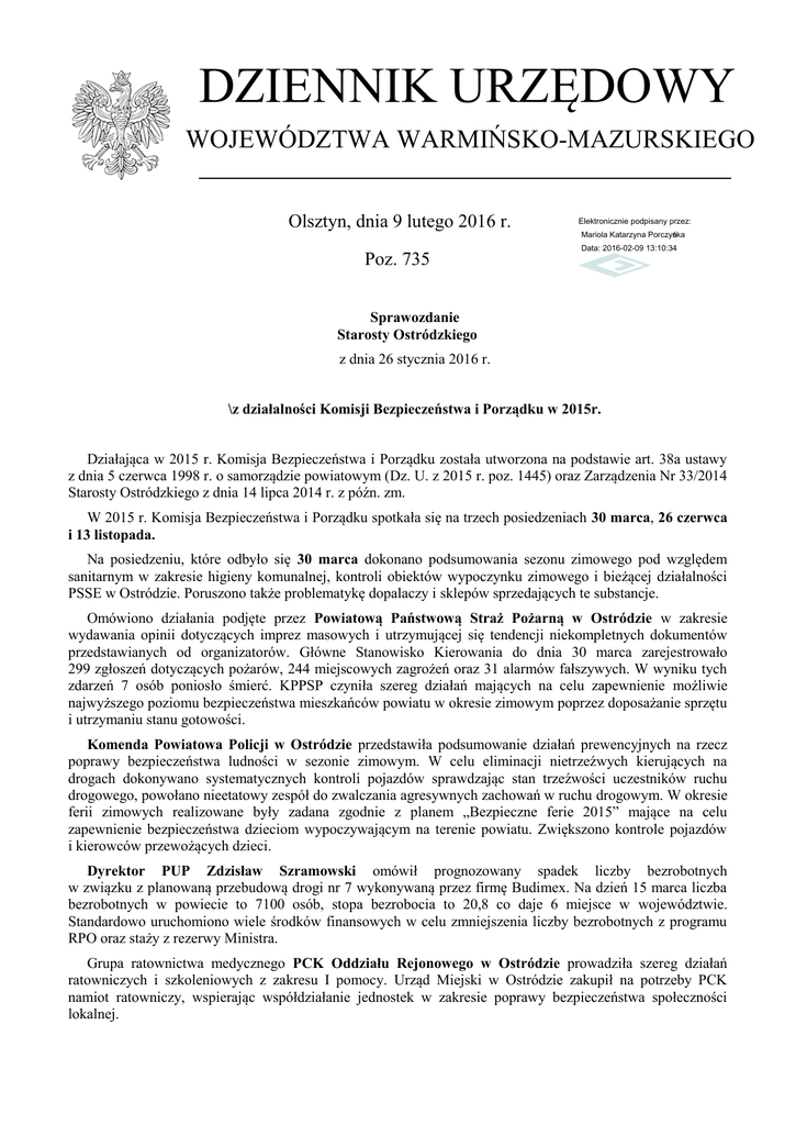 DZIENNIK URZĘDOWY WOJEWÓDZTWA WARMIŃSKO-MAZURSKIEGO Olsztyn, dnia 9 lutego 2016 r. Elektronicznie podpisany przez: Mariola Katarzyna Porczyńska Poz. 735 Data: 2016-02-09 13:10:34 Sprawozdanie Starosty Ostródzkiego z dnia 26 stycznia 2016 r. \z działalności Komisji Bezpieczeństwa i Porządku w 2015r. Działająca w 2015 r. Komisja Bezpieczeństwa i Porządku została utworzona na podstawie art. 38a ustawy z dnia 5 czerwca 1998 r. o samorządzie powiatowym (Dz. U. z 2015 r. poz. 1445) oraz Zarządzenia Nr 33/2014 Starosty Ostródzkiego z dnia 14 lipca 2014 r. z późn. zm. W 2015 r. Komisja Bezpieczeństwa i Porządku spotkała się na trzech posiedzeniach 30 marca, 26 czerwca i 13 listopada. Na posiedzeniu, które odbyło się 30 marca dokonano podsumowania sezonu zimowego pod względem sanitarnym w zakresie higieny komunalnej, kontroli obiektów wypoczynku zimowego i bieżącej działalności PSSE w Ostródzie. Poruszono także problematykę dopalaczy i sklepów sprzedających te substancje. Omówiono działania podjęte przez Powiatową Państwową Straż Pożarną w Ostródzie w zakresie wydawania opinii dotyczących imprez masowych i utrzymującej się tendencji niekompletnych dokumentów przedstawianych od organizatorów. Główne Stanowisko Kierowania do dnia 30 marca zarejestrowało 299 zgłoszeń dotyczących pożarów, 244 miejscowych zagrożeń oraz 31 alarmów fałszywych. W wyniku tych zdarzeń 7 osób poniosło śmierć. KPPSP czyniła szereg działań mających na celu zapewnienie możliwie najwyższego poziomu bezpieczeństwa mieszkańców powiatu w okresie zimowym poprzez doposażanie sprzętu i utrzymaniu stanu gotowości. Komenda Powiatowa Policji w Ostródzie przedstawiła podsumowanie działań prewencyjnych na rzecz poprawy bezpieczeństwa ludności w sezonie zimowym. W celu eliminacji nietrzeźwych kierujących na drogach dokonywano systematycznych kontroli pojazdów sprawdzając stan trzeźwości uczestników ruchu drogowego, powołano nieetatowy zespół do zwalczania agresywnych zachowań w ruchu drogowym. W okresie ferii zimowych realizowane były zadana zgodnie z planem „Bezpieczne ferie 2015” mające na celu zapewnienie bezpieczeństwa dzieciom wypoczywającym na terenie powiatu. Zwiększono kontrole pojazdów i kierowców przewożących dzieci. Dyrektor PUP Zdzisław Szramowski omówił prognozowany spadek liczby bezrobotnych w związku z planowaną przebudową drogi nr 7 wykonywaną przez firmę Budimex. Na dzień 15 marca liczba bezrobotnych w powiecie to 7100 osób, stopa bezrobocia to 20,8 co daje 6 miejsce w województwie. Standardowo uruchomiono wiele środków finansowych w celu zmniejszenia liczby bezrobotnych z programu RPO oraz staży z rezerwy Ministra. Grupa ratownictwa medycznego PCK Oddziału Rejonowego w Ostródzie prowadziła szereg działań ratowniczych i szkoleniowych z zakresu I pomocy. Urząd Miejski w Ostródzie zakupił na potrzeby PCK namiot ratowniczy, wspierając współdziałanie jednostek w zakresie poprawy bezpieczeństwa społeczności lokalnej. Dziennik Urzędowy Województwa Warmińsko-Mazurskiego –2– Poz. 735 Przewodniczący KBiP Starosta Andrzej Wiczkowski podkreślił, iż współdziałanie służb ma ogromne znaczenie i przekłada się na stan bezpieczeństwa społeczności lokalnej powiatu ostródzkiego. Nadmienił również, że zbliżająca się przebudowa drogi będzie ogromnym wyzwaniem zarówno dla wykonawców jaki mieszkańców. Firma Budimex, która będzie wykonawcą przebudowy wspomoże gospodarkę finansową firm lokalnych i osób fizycznych wynajmujących mieszkania prywatne. Kolejne czerwcowe posiedzenie Komisji Bezpieczeństwa i Porządku dotyczyło problematyki bezpieczeństwa ludności powiatu oraz przygotowania do sezonu letniego inspekcji i służb powiatowych zapewniającym bezpieczeństwo turystom i mieszkańcom powiatu w nadchodzącym sezonie letnim. Dyrektor Zarządu Dróg Powiatowych w Ostródzie Małgorzata Ostrowska przedstawiła działania realizowane przez ZDP w związku ze zbliżającym się sezonem letnim, naprawy ubytków, koszenie traw pasów drogowych oraz przygotowania do Dni Grunwaldu. Przedstawiła także krótką informację na temat przebudowy drogi S7, Budimex to firma zabezpieczająca drogi przed i w czasie budowy. Całe przedsięwzięcie na pewno utrudni czasowo codzienne życie mieszkańców powiatu i osób przejezdnych ale w rezultacie będzie to w przyszłości wielkie udogodnienie i znacząca poprawa w ruchu drogowym. Problemem będzie utrudnienie ruchu w czasie przebudowy na ulicy Mickiewicza i Olsztyńskiej, tam pojawi się problem z włączeniem się do ruchu na skrzyżowaniu. Objazd rusza od 1.09.2015 r. i łączy się także z rozpoczęciem roku szkolnego, firma Budimex zabezpieczy w związku z powyższym szkoły przy drogach wyznaczonych do objazdu. Przedstawicielka Komendy Powiatowy Policji w Ostródzie Jolanta Burakiewicz przedstawiła działania KPP na rzecz poprawy bezpieczeństwa społeczności lokalnej powiatu przed sezonem letnim. Poinformowała również, iż policjanci będą pomagać w usprawnieniu ruchu poprzez dzienną regulacje ruchu w czasie przebudowy drogi. Poruszono także temat związany z brakiem obsady na posterunku policji w Miłomłynie oraz brakiem zabezpieczenia terenów wodnych przy Narie, zaostrzenia przepisów dotyczących kąpielisk, zamykając tym samym w większości ze względu na koszty możliwości wzrostu liczy kąpielisk strzeżonych na terenie powiatu. Komendant Powiatowej Państwowej Straży Pożarnej w Ostródzie Tomasz Ostrowski poinformował o tym, że tereny wodne zabezpieczają dwie jednostki ratowniczo gaśnicze w Morągu i Ostródzie. W Ostródzie jest 12 nurków i 5 stermotorzystów z uprawnieniami ratowników medycznych. Ponadto łodzie ratownicze są w Dąbrównie, Miłomłynie, Miłakowie i niebawem w Starych Jabłonkach. W ciągu doby na służbie są co najmniej dwie osoby posiadające uprawnienia nurka. Przeds