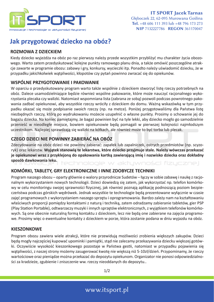 IT SPORT Jacek Tarnas Głęboczek 22, 62-095 Murowana Goślina Tel. +48 606 111 393 lub +48 796 173 273 NIP 7132227786 REGON 361170047 Jak przygotować dziecko na obóz? ROZMOWA Z DZIECKIEM Kiedy dziecko wyjeżdża na obóz po raz pierwszy należy przede wszystkim przybliżyć mu charakter życia obozowego. Warto zatem przedyskutować kolejne punkty ramowego planu dnia, a także omówić poszczególne atrakcje zawarte w programie obozu: zabawy i gry, konkursy, wycieczki itp. Ponadto należy uświadomić dziecku, że w przypadku jakichkolwiek wątpliwości, kłopotów czy pytań powinno zwracać się do opiekunów. WSPÓLNE PRZYGOTOWANIE I PAKOWANIE W oparciu o przedyskutowany program warto także wspólnie z dzieckiem stworzyć listę rzeczy potrzebnych na obóz. Dalece usamodzielniające będzie również wspólne pakowanie, które może nauczyć racjonalnego wykorzystania plecaka czy walizki. Natomiast wspomniana lista (zabrana ze sobą) pozwoli podczas powrotnego pakowania zadbać opiekunowi, aby wszystkie rzeczy wróciły z dzieckiem do domu. Ważną wskazówką w tym przypadku okazać się może podpisanie swoich rzeczy (np. na metce). Poniżej przygotowaliśmy dla Państwa listę niezbędnych rzeczy, którą po wydrukowaniu możecie uzupełnić o własne punkty. Prosimy o schowanie jej do bagażu dziecka. Na koniec pamiętajmy, że bagaż powinien być na tyle lekki, aby dziecko mogło go samodzielnie przenieść w nieodległe miejsce, bowiem opiekunowie będą pomagali w pierwszej kolejności najmłodszym uczestnikom. Najlepiej sprawdzają się walizki na kółkach, ale również może to być torba lub plecak. CZEGO DZIECI NIE POWINNY ZABIERAĆ NA OBÓZ Zdecydowanie na obóz dzieci nie powinny zabierać: zapałek lub zapalniczek, ostrych przedmiotów (np. scyzoryk) oraz lekarstw. Wyjątek stanowią te lekarstwa, które dziecko przyjmuje stale. Należy wówczas przekazać je opiekunowi wraz z przyklejoną do opakowania kartką zawierającą imię i nazwisko dziecka oraz dokładny sposób dawkowania leku. KOMÓRKI, TABLETY, GRY ELEKTRONICZNE I INNE ZDOBYCZE TECHNIKI Program naszego obozu – oparty głównie o walory przyrodnicze Sudetów – łączy w sobie zabawę i naukę z racjonalnym wykorzystaniem nowych technologii. Dzieci dowiedzą się zatem, jak wykorzystać np. telefon komórkowy w celu monitoringu swojej sprawności fizycznej, jak również poznają aplikację podnoszącą poziom bezpieczeństwa podczas górskich wędrówek. Jednak wszystkie te technologie będą prezentowane wyłącznie w czasie zajęć programowych z wykorzystaniem naszego sprzętu i oprogramowania. Bardzo zależy nam na kształtowaniu właściwych proporcji pomiędzy kontaktami z naturą i techniką, zatem odradzamy zabieranie tabletów, gier PSP (Play Station Portable), odtwarzaczy muzyki i innych sprzętów elektronicznych, z wyjątkiem telefonów komórkowych. Są one obecnie naturalną formą kontaktu z dzieckiem, lecz nie będą one zabierane na zajęcia programowe. Prosimy więc o ewentualne kontakty z dzieckiem w porze, która zostanie podana w dniu wyjazdu na obóz. KIESZONKOWE Program obozu zawiera wiele atrakcji, które nie przewidują możliwości zrobienia większych zakupów. Dzieci będą mogły najczęściej kupować upominki i pamiątki, stąd nie zalecamy przekazywania dziecku większej gotówki. Oczywiście wysokość kieszonkowego pozostaje w Państwa gestii, natomiast w przypadku pojawienia się wątpliwości, z naszej strony możemy zasugerować kwotę nie większą niż 5-10zł/dzień. Przypominamy, że rzeczy wartościowe oraz pieniądze można przekazać do depozytu opiekunom. Organizator nie ponosi odpowiedzialności za kradzieże, zgubienie i zniszczenie ww. rzeczy nieoddanych do depozytu.. 1/2 www.itsport.pl IT SPORT Jacek Tarnas Głęboczek 22, 62-095 Murowana Goślina Tel. +48 606 111 393 lub +48 796 173 273 NIP 7132227786 REGON 361170047 CO NALEŻY ZABRAĆ NA OBÓZ TENISOWO-PRZYGODOWY kurtkę nieprzemakalną ubranie na ciepłą (z krótkim rękawem) i zimną pogodę (bluzę np. polar) dres bieliznę na każdy dzień strój kąpielowy czapkę, najlepiej z daszkiem sandały buty tenisowe (zaokrąglona krawędź podeszwy) – niezbędne buty sportowe na boisko i w teren klapki pod prysznic . okulary przeciwsłoneczne . mały plecak kosmetyki i środki higieny osobistej: pasta i szczoteczka do zębów, mydło, szampon (najlepiej w saszetkach), duży ręcznik plażowy i dwa ręczniki, chusteczki higieniczne, kremy z filtrem UV krem lub spray przeciw komarom i kleszczom inne rzeczy: długopis, notes z adresami, latarka, saszetka do zawieszania na szyi (na pieniądze z kieszonkowym) legitymację szkolną (obowiązkowo) oraz kartkę z adresem wypoczynku i telefonami kontaktowymi do rodziców ………………………………………………………………………………………………………………………………………........ ………………………………………………………………………………………………………………………………………........ ………………………………………………………………………………………………………………………………………........ ………………………………………………………………………………………………………………………………………........ ………………………………………………………………………………………………………………………………………........ ………………………………………………………………………………………………………………………………………........ ………………………………………………………………………………………………………………………………………........ ..………………………………………………………………