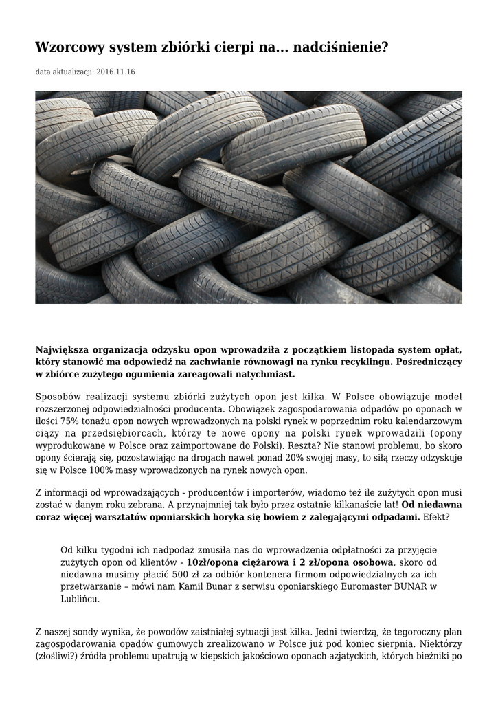 Wzorcowy system zbiórki cierpi na... nadciśnienie? data aktualizacji: 2016.11.16 Największa organizacja odzysku opon wprowadziła z początkiem listopada system opłat, który stanowić ma odpowiedź na zachwianie równowagi na rynku recyklingu. Pośredniczący w zbiórce zużytego ogumienia zareagowali natychmiast. Sposobów realizacji systemu zbiórki zużytych opon jest kilka. W Polsce obowiązuje model rozszerzonej odpowiedzialności producenta. Obowiązek zagospodarowania odpadów po oponach w ilości 75% tonażu opon nowych wprowadzonych na polski rynek w poprzednim roku kalendarzowym ciąży na przedsiębiorcach, którzy te nowe opony na polski rynek wprowadzili (opony wyprodukowane w Polsce oraz zaimportowane do Polski). Reszta? Nie stanowi problemu, bo skoro opony ścierają̨ się, pozostawiając na drogach nawet ponad 20% swojej masy, to siłą rzeczy odzyskuje się w Polsce 100% masy wprowadzonych na rynek nowych opon. Z informacji od wprowadzających - producentów i importerów, wiadomo też ile zużytych opon musi zostać w danym roku zebrana. A przynajmniej tak było przez ostatnie kilkanaście lat! Od niedawna coraz więcej warsztatów oponiarskich boryka się bowiem z zalegającymi odpadami. Efekt? Od kilku tygodni ich nadpodaż zmusiła nas do wprowadzenia odpłatności za przyjęcie zużytych opon od klientów - 10zł/opona ciężarowa i 2 zł/opona osobowa, skoro od niedawna musimy płacić 500 zł za odbiór kontenera firmom odpowiedzialnych za ich przetwarzanie – mówi nam Kamil Bunar z serwisu oponiarskiego Euromaster BUNAR w Lublińcu. Z naszej sondy wynika, że powodów zaistniałej sytuacji jest kilka. Jedni twierdzą, że tegoroczny plan zagospodarowania opadów gumowych zrealizowano w Polsce już pod koniec sierpnia. Niektórzy (złośliwi?) źródła problemu upatrują w kiepskich jakościowo oponach azjatyckich, których bieżniki po prostu zużyły się nadspodziewanie szybko, więc w ogromnej mierze zachwiały równowagą na rynku recyklingu ogumienia. O komentarz poprosiliśmy przedstawiciela największej organizacji odzysku w branży oponiarskiej, która od blisko 15 lat odbiera zużyte opony bezpłatnie od wszystkich przedsiębiorców z terenu całej Polski, o ile tylko zadeklarowali chęć ich przekazania do utylizacji. Sytuacja zaczęła się zmieniać już pod koniec ubiegłego roku wraz z rosnącym importem do Polski pojazdów używanych i pojazdów rozbitych przeznaczonych do demontażu, a także opon używanych i opon zużytych – tłumaczy Grzegorz Karnicki z Centrum Utylizacji Opon. Możliwe jest, że nie wszyscy przedsiębiorcy wprowadzający na polski rynek opony nowe i używane mają świadomość, że ciąży na nich obowiązek zebrania i zutylizowania 75% wprowadzonego tonażu. Z kolei inni, zapewne ze względów finansowych nie organizują zbiórki związanej z wykonaniem obowiązku ustawowego lub wykonują ją tylko częściowo, zachęcając jednocześnie do bezpłatnego przekazywania opon do CUO. Doprowadziło to do wykonania zbiórki pokrywającej obowiązki naszych akcjonariuszy i klientów już pod koniec sierpnia br. Z tych powodów miesiąc później zdecydowaliśmy się na czasowe zawieszenie przyjmowania zamówień odbioru, a następnie uruchomienie dodatkowej zbiórki ponad wysokość naszych obowiązków już za odpłatnością. Cennik obowiązuje od 2 listopada (dla opon motocyklowych - 1,50 zł/szt.; dla opon osobowych - 2,50 zł/szt.; dla opon ciężarowych - 12,00 zł/szt.). Decyzja CUO jawi się precedensowo. Mimo, że jej udział w rynku od 2002 roku zmalał z ponad 80% do około 50%, to pozostaje nadal największą i jedyną organizacją obejmującą zakresem usług całą Polskę. Problem jest w mojej opinii wielowątkowy, więc nie upatrywałbym winy po stronie warsztatów oponiarskich, a raczej firm, które wykorzystują system zbiórki opon w Polsce dla nieuczciwego zarobku – dowodzi Adam Małyszko, prezes Stowarzyszenia Forum Recyklingu Samochodów (FORS). W tym miejscu trzeba sięgnąć do historii, do 2002 roku, kiedy to cementownie z uwagi na wysoką kaloryczność zużytych opon chętnie je przyjmowały, płacąc ok. 150 zł za tonę. Po wejściu w życie ustawy produktowej, w ciągu jednego dnia zarządy cementowni diametralnie zmieniły politykę i zażądały opłaty w wysokości 150 zł za tonę, odsyłając jednocześnie posiadaczy zużytych opon do organizacji odzysku. Po kilkumiesięcznych negocjacjach osiągnięto kompromis, gwarantujący między innymi prowadzącym stacje demontażu bezkosztowy odbiór zużytych opon. Stowarzyszenie FORS zawarło stosowne porozumienie z CUO, które do dnia dzisiejszego obowiązuje. Niestety, w ostatnim roku sytuacja zaczęła się niepokojąco zmieniać, przedłużano termin odbioru lub próbowano żądać zapłaty. Wprowadzona w cenniku CUO opłata całkowicie zaskoczyła naszą branżę, zwłaszcza że do dnia dzisiejszego nie została wypowiedziana umowa. Źródło: