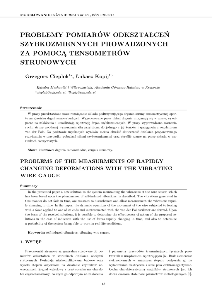 MODELOWANIE INŻYNIERSKIE nr 48 , ISSN 1896-771X PROBLEMY POMIARÓW ODKSZTAŁCEŃ SZYBKOZMIENNYCH PROWADZONYCH ZA POMOCĄ TENSOMETRÓW STRUNOWYCH Grzegorz Cieplok1a, Łukasz Kopij1b 1 a Katedra Mechaniki i Wibroakustyki, Akademia Górniczo-Hutnicza w Krakowie [email protected], [email protected] Streszczenie W pracy przedstawiono nowe rozwiązanie układu podtrzymującego drgania struny tensometrycznej oparte na zjawisku drgań samowzbudnych. Wygenerowane przez układ drgania utrzymują się w czasie, są odporne na zakłócenia i umożliwiają rejestrację drgań szybkozmiennych. W pracy wyprowadzono równania ruchu struny poddanej wymuszeniu siłą przyłożoną do jednego z jej końców i sprzęgniętą z oscylatorem van der Pola. Na podstawie uzyskanych wyników można określić skuteczność działania proponowanego rozwiązania w przypadku pobudzeń siłami szybkozmiennymi oraz określić szanse na pracę układu w warunkach rzeczywistych. Słowa kluczowe: drgania samowzbudne, czujnik strunowy. PROBLEMS OF THE MEASURMENTS OF RAPIDLY CHANGING DEFORMATIONS WITH THE VIBRATING WIRE GAUGE Summary In the presented paper a new solution to the system maintaining the vibrations of the wire sensor, which has been based upon the phenomenon of self-induced vibrations, is described. The vibrations generated in this manner do not fade in time, are resistant to disturbances and allow measurement the vibrations rapidly changing in time. In the paper, the dynamic equations of the movement of the wire subjected to forcing with a force applied to one of its ends and interconnected with the van der Pol oscillator are derived. Upon the basis of the received solutions, it is possible to determine the effectiveness of action of the proposed solutions in the case of induction with the use of forces rapidly changing in time, and also to determine a probability of the system being able to work in real-life conditions. Keywords: self-induced vibrations, vibrating wire sensor. 1. WSTĘP Przetworniki strunowe są generalnie stosowane do pomiarów odkształceń w warunkach działania obciążeń statycznych. Posiadają nieskomplikowaną budowę oraz wysoki stopień odporności na działanie czynników zewnętrznych. Sygnał wyjściowy z przetwornika ma charakter częstotliwościowy, co czyni go odpornym na zakłócenia 13 i parametry przewodów transmisyjnych łączących przetwornik z urządzeniem rejestrującym [5]. Brak elementów elektronicznych w znacznym stopniu uodparnia go na wyładowania elektryczne i silne pola elektromagnetyczne. Cechą charakterystyczną czujników strunowych jest ich dobra czasowa stabilność parametrów metrologicznych [6]. PROBLEMY POMIARÓW ODKSZTAŁCEŃ SZYBKOZMIENNYCH PROWADZONYCH… 2. KONCEPCJA NOWEGO ROZWIĄZANIA Udokumentowane badania wskazują na możliwość stosowania czujników w pomiarach trwających około 30 lat. Ma to szczególne znaczenie w przypadku konstrukcji budowlanych i inżynierskich, których czas użytkowania przyjmowany jest na 50 lat. Wymienione cechy powodują, że czujniki strunowe są szeroko stosowane w wielu gałęziach przemysłu; w szczególności w budownictwie lądowym, wodnym, geotechnice oraz ochronie środowiska [2][7][13][14]. Ze względu na charakter działania czujnika, w którym wzbudzenia struny odbywają się cyklicznie, w odstępach czasu potrzebnych na wygaszenie się drgań swobodnych, jego zastosowanie jest ograniczone do pomiarów wielkości mechanicznych i temperatury stałych lub wolno zmieniających się w czasie. Dlatego metoda ma ograniczone zastosowanie np. w przypadku obiektów wysokich narażonych na działanie wiatru (np. kominach, masztach, wieżach), wspornikach maszyn (fundamenty pod turbogeneratory)[3][9], mostach kolejowych i drogowych, w przypadku wymuszeń parasejsmicznych (w warunkach krajowych) i sejsmicznych (na świecie). Znane są rozwiązania stosowane do pomiarów odkształceń szybkozmiennych, gdy te zachodzą w czasie krótszym niż czas wytłumiania się drgań struny. W tym przypadku pobudzenie struny jest synchronizowane z chwilą pojawienia się wymuszenia powodującego zmianę jej naciągu. W ten sposób tensometr strunowy może zostać wykorzystany np. do rejestracji nacisków wywieranych przez koła jadących pojazdów [5]. Rozszerzeniem tej koncepcji jest synfazowe pobudzanie struny do drgań quasi-ciągłych [4]. W tym przypadku struna jest pobudzana cyklicznie co n okresów, a faza impulsu pobudzającego pozostaje w odpowiedniej zgodności z fazą drgań struny. W rozwiązaniu traci się pewną część sygnału wynikającą z obecności stanów przejściowych spowodowanych impulsem pobudzającym. Zastosowanie dwóch elektromagnesów, które pozwalają rozdzielić funkcję pobudzania drgań i ich przekształcania w sygnał pomiarowy, pozwala na uzyskanie drgań o stałej amplitudzie [4]. Najbardziej zaawansowanymi rozwiązaniami są układy wykorzystujące pętlę sprzężenia fazowego PLL (ang. Phase Locked Loop). Systemy te posiadają również swoje wady i ich zastosowanie q jest ograniczone. Ciągła rejestracja sygnału pozwala na całościową analizę przebiegu odkształcenia i wychwycenie wartości ekstremalnych, co z kolei przekłada się na właściwszą ocenę bezpieczeństwa elementu lub obiektu. Najistotniejszym problemem, z którym obecnie zmagają się firmy produkujące tensometry strunowe, pozostaje nadal pomiar odkształceń szybkozmiennych, w tym krótkotrwałych i losowych. Sposobem na wzbudzenie i utrzymanie niegasnących drgań własnych struny - wg autorów - jest rozwinięcie drgań samowzbudnych struny. Drgania tego typu są dobrze znane w inżynierii mechanicznej. Występują w układach niezachowawczych i mają tę cechę, że są zdolne do samoczynnego uzupełniania utraconej energii, a ich amplituda i częstotliwość określona jest przez parametry fizyczne układu. Z tego powodu różnią się od drgań swobodnych tłumionych tym, że nie zanikają w czasie oraz o