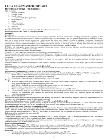 LEICA RANGEMASTER CRF 1600B Instrukcja obsługi – tłumaczenie Opis elementów 1. Przycisk dodatkowy 2. Przycisk główny 3. Muszla oczna z a. kompensatą dioptrii z podziałką 4. Oczko na pasek 5. Okular 6. Pokrywka baterii 7. Zasobnik na baterię 8. Soczewka 9. Optyka lasera W zestawie: Dalmierz, 1 sztuka baterii 3V typu CR2, Pasek, Pokrowiec, Gwarancja Leica Rangemaster CRF 1600B Nr katalogowy 40 534 Przedmowa Drogi kliencie Na całym świecie nazwa Leica oznacza wysoką jakość, precyzję mechaniki, doskonała niezawodność oraz długi czas działania. Życzymy ci dużo przyjemności i sukcesów przy korzystaniu z twojego nowego dalmierza Leica Rangemaster CRF. Ten dalmierz wysyła impulsy laserowego światła, które są w paśmie podczerwonym, niewidoczne i nieszkodliwe dla gołego oka. Niektóre te pulsy są odbijane z powrotem. Wbudowany mikroprocesor oblicza na tej podstawie dystans do obiektu. Jest on wyposażony w znakomita optykę z powiększeniem 7x, która zapewnia dobre nacelowywanie nawet w trudnych warunkach, a jego funkcjonalny design sprawia, że jest łatwy w użyciu. Prosimy, abyś przeczytał całą niniejszą instrukcję, aby czerpać maksimum korzyści z tego wszechstronnego laserowego dalmierza wysokiej jakości. UWAGA: Jak w przypadku każdej optyki, aby zapobiec uszkodzeniu wzroku, w czasie używania dalmierza Leica Rangemaster należy unikać patrzenia bezpośrednio na źródła jasnego światła. Likwidacja sprzętu elektrycznego i elektronicznego (Zgodnie z EC, oraz z lokalnymi prawami segregacji odpadów w krajach europejskich) To urządzenie posiada wyposażenie elektryczne oraz/lub elektroniczne i dlatego nie należy wyrzucać go do zbiorczego kontenera na domowe odpadki. Zamiast tego należy oddać to urządzenie do punktu przetwórstwa odpadów wtórnych zapewnionego przez władze lokalne. Ta czynność nic nie kosztuje. Jeżeli urządzenie posiada wymienne (ładowalne) baterie, to muszą być one wyjęte, i jeżeli jest to wymagane, poddane likwidacji zgodnie z odpowiednimi przepisami. Dodatkowe informacje w tej kwestii są dostępne u władz lokalnych, lokalnych firmach wywozu odpadów albo w sklepie, gdzie to urządzenie zostało zakupione. Zakładanie paska (*schemat na stronie 26 oryginalnej instrukcji) Przełóż małą pętelkę przez oko (4) w obudowie Leica Rangemaster CRF. Następnie przewlecz dużą pętlę przez małą i pociągnij zaciskając ją na oku. Instalowanie i wymiana baterii (*schemat na stronie 26 oryginalnej instrukcji) Dalmierz Leica Rangemaster CRF posiada w zestawie jedną baterię litowa 3V (np. Duracell DL CR2, Ucar CR2, Varta CR2, lub inna typu CR2). 1. Otwórz pokrywkę (6) zasobnika baterii (7) poprzez obrót w stronę przeciwną do ruchu wskazówek zegara. 2. Włóż baterię plusem do środka(tak, jak oznaczono w zasobniku). 3. Zamknij pokrywkę przekręcając ją zgodnie z ruchem wskazówek zegara. Uwaga: W niskich temperaturach spada żywotność baterii, dlatego zaleca się w takich warunkach wyposażyć dalmierz Leica Rangemaster CRF w nową baterię i trzymać go w wewnętrznej kieszeni, blisko ciała. Jeżeli dalmierz nie będzie używany przez dłuższy okres czasu, bateria powinna zostać wyjęta. Baterie powinny być przechowywane w chłodnym i suchym miejscu. Baterie nie mogą być wrzucane do ognia, podgrzewane, ładowane, rozbierane na części lub łamane Zużyte baterie nie mogą być wyrzucane tak, jak normalne domowe odpadki, ponieważ zawierają materiały niebezpieczne, które mogą być szkodliwe dla środowiska. Aby zapewnić ich prawidłowe przetworzenie, baterie muszą być zwrócone dilerowi lub oddane do odpowiedniego punktu przyjęć. Poziom naładowania baterii Niski poziom energii jest sygnalizowany poprzez mruganie markera oraz dystansu. Kiedy zacznie się mruganie, oznacza to, że pozostało około 100 pomiarów, lecz zasięg dalmierza będzie się sukcesywnie zmniejszał. Używanie z okularami optycznymi i bez (Rysunki A i B na str.28 w oryginalnej instrukcji) Jeżeli nie nosisz okularów, zostaw gumową muszlę oczną (3) rozwiniętą tak, jak jest dostarczana (Rysunek A). Takie ustawienie zapewnia prawidłową odległość dalmierza Leica od oka. Jeżeli patrzysz przez okulary, zawiń gumową muszlę oczną (Rysunek B). Korekta dioptrii(Rysunek C na str.28 oryginalnej instrukcji) Kompensacja dioptrii pozwala na ustawienie indywidualne ostrości markera. Po prostu naceluj dalmierz Leica Rangemaster CRF na jakiś odległy obiekt i obracając gumową muszlę oczną (3) ustaw ostrość markera celującego. Marker będzie widoczny po naciśnięciu przycisku głównego (2). Możesz odczytać wartość ustawień na „+” lub na „-” na podziałce na muszli ocznej (3b). Kompensacja jest możliwa w zakresie ±3,5 dioptrii. Podstawowe informacje na temat menu ustawień Dla wszystkich ustawień: - menu główne posiada 4 pozycje – ustawienia metry/jardy („USEU”), krzyw balistyczna („baLL"), dystans przystrzelania („SId”) oraz sposób wyświetlania balistyki („AbC”). Opisy poszczególnych funkcji znajdują się w niniejszej instrukcji. - zarówno menu główne, jak i poszczególne ustawienia są ustawione w nieskończonej pętli, oznacza to, że wszystkie pozycje będą wyświetlane jedna po drugiej w kółko po przyciśnięciu przycisku. Ustawienie jednostek pomiaru Dalmierz Leica Rangemaster CRF 1600B może dokonywać pomiaru w jednostkach metrycznych („EU” - m/C/milibar) lub jednostkach imperialnych („US” - yd/F/InHG) odpowiednio dla dystansu/temperatury/ciśnienia. To ustawienie dotyczy też wartości przewyższenia w cm lub w in oraz dostępnych krzywych balistycznych (dostępnych na stronie 178 oryginalnej instrukcji). Ustawianie 1. Przyciśnij na krótko przycisk dodatkowy (1) (>3s). Pojawi się mrugający napis „EU.US”. 2. Wciśnij przycisk główny (2), aby wybrać pożądane jednostki miary: US dla jardów, EU dla metrów. 1 Uwaga: Aktualne ustawienie 