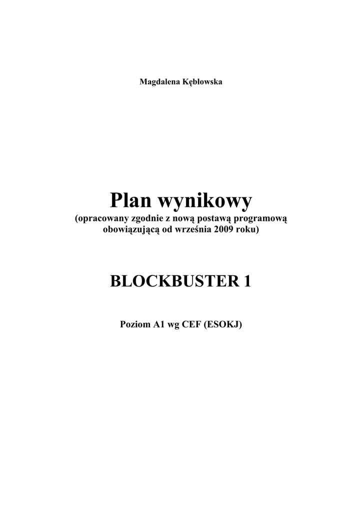 Magdalena Kębłowska Plan wynikowy (opracowany zgodnie z nową postawą programową obowiązującą od września 2009 roku) BLOCKBUSTER 1 Poziom A1 wg CEF (ESOKJ) Wstęp 1. Czym jest plan wynikowy Powtarzając za H. Komorowską, za podstawową zmianę, jaka powinna dokonać się w systemie edukacji w Polsce, należy uważać „ukierunkowanie działań dydaktycznych na osobę ucznia, a nie na osobę nauczyciela” (2000:5)1. Plan wynikowy, który określa o c z e k i w a n e o s i ą g n i ę c i a u c z n i ó w po przerobieniu danej partii materiału, znakomicie spełnia ten warunek i pozostaje w zgodzie z postulatem podejścia skoncentrowanego na uczniu (learner-centeredness). Tak skonstruowany, stanowi nieocenioną pomoc w wielu aspektach pracy nauczyciela. Po pierwsze, pozwala zaplanować zajęcia, przygotować dodatkowe materiały i ćwiczenia, pomoce wizualne, tematy prac projektowych itp. zarówno na najbliższy tydzień, jak i na cały rok szkolny, a nawet na koniec danego etapu edukacyjnego. W ten sposób przyczynia się do bardziej spójnego i lepiej zorganizowanego procesu dydaktycznego. Po drugie, jest szczególnie przydatny przy opracowywaniu testów i kartkówek, ponieważ pomaga wyznaczyć właściwe kryteria oceny. Dzięki temu może się również okazać pomocny w kontaktach nauczyciela z rodzicami, dla których jasno sformułowane w planie wynikowym umiejętności i wiedza są bardziej czytelne niż spis treści w języku obcym w podręczniku. Rodzice mogą się także zainteresować planem wynikowym, by wiedzieć, jak pracować z dzieckiem w domu czy jakie materiały mu dostarczyć, by wspomóc pracę nauczyciela, a tym samym przyczynić się do większej niezależności ucznia. Sami uczniowie, zwłaszcza na wyższych poziomach, mogą docenić plan wynikowy przy wytyczaniu i realizowaniu swoich celów. Wreszcie będzie plan wynikowy wskazówką dla nauczycieli innych przedmiotów w procesie integracji wiedzy i umiejętności. 1 Komorowska, H., „Nowe tendencje w nauczaniu języków obcych.” w: Komorowska, H. (red.), Nauczanie języków obcych w zreformowanej szkole. Warszawa: IBE, 2000. 2 2. Struktura planu wynikowego do podręcznika Blockbuster 1 (Podręcznik ucznia i Zeszyt ćwiczeń) Poniższa propozycja planu wynikowego składa się z dwóch zasadniczych części: - tabeli zawierającej oczekiwane osiągnięcia uczniów oraz - tabeli ukazującej realizowanie wytycznych Podstawy programowej w danej części podręcznika. 2.1. Oczekiwane osiągnięcia ucznia Podział pierwszej z tabel na wiedzę (czyli UCZEŃ ZNA) i umiejętności (czyli UCZEŃ POTRAFI) jest istotnym elementem planowania wynikowego oraz ustalania kryteriów oceny. Pamiętać należy, że we współczesnej szkole w i e d z a, a więc opanowanie słownictwa i struktur gramatycznych, nie jest już ostatecznym celem procesu nauczania/ uczenia się, a jedynie pomocnym narzędziem w osiągnięciu właściwego celu, czyli u m i e j ę t n o ś c i. Dlatego też znajomość słownictwa i materiału gramatycznego należy traktować jako punkt wyjściowy dla rozwoju umiejętności posługiwania się językiem obcym. W kolumnie Słownictwo znalazły się kategorie leksykalne proponowane w każdym dziale (Unit) podręcznika wraz z konkretnymi przykładami wyrazów, zwrotów czy wyrażeń. Z przyczyn technicznych lista słów nie jest kompletna, zawiera natomiast wystarczającą liczbę przykładów, które pozwalają na rozpoznanie danej kategorii. Warto w tym miejscu przypomnieć, iż na poziomie początkującym każde nowopoznane słowo powinno zazwyczaj znaleźć się w aktywnym repertuarze ucznia. Na wyższych poziomach, gdzie pojawia się coraz więcej nowego słownictwa, nauczyciel – biorąc pod uwagę różne kryteria (np. przydatności dla ucznia, zainteresowań ucznia itp.) – będzie często decydował, które słowa uczeń musi znać aktywnie (a więc używać), a które biernie (a więc jedynie rozpoznawać i ogólnie orientować się w ich znaczeniu). Materiał gramatyczny to lista struktur gramatycznych wraz z przykładami, które uczeń powinien znać, a więc powinien podać reguły i struktury. W celu ułatwienia nauczycielowi określenia właściwych kryteriów oceny Plan proponuje zastosowanie kategoryzacji wg taksonomii prof. Niemierki. I tak opisane powyżej kolumny Słownictwo i Materiał gramatyczny, odnoszące się do wiedzy ucznia, należałoby określić jako A – zapamiętanie wiadomości leksykalnych i gramatycznych (uczeń potrafi nazwać kolory, zwierzęta, dni tygodnia, podać regułę gramatyczną itp.). Jak już wspomniano, samo odtworzenie reguły lub przytoczenie słówka bez kontekstu to dopiero punkt wyjściowy, a nie znak tego, co uczeń potrafi. W ostatniej kolumnie tabeli znajdziemy właśnie umiejętności ucznia, które zaklasyfikować możemy jako rozumienie 3 wiadomości (kategoria B wg Niemierki) przejawiające się poprawnym rozwiązywaniem kontrolowanych2 zadań leksykalnych (np. wstawianie odpowiednich wyrazów w zdaniach) i gramatycznych (wypełnianie luk, transformacje) lub stosowanie wiadomości w określonych sytuacjach komunikacyjnych (kategoria C wg taksonomii Niemierki). Na przykład, możemy ocenić, czy uczeń potrafi używać czasu Present Simple, jeśli umie rozmawiać z kolegą na temat jego i swoich czynności dnia codziennego: A: How often do you exercise? B: I exercise once a week. A: Do you ever do the shopping? B: I do the shopping on Saturdays. lub napisać kartkę do kolegi z wakacji o tym, jak wygląda typowy wakacyjny dzień, a co wyjątkowo robi teraz: We go to the beach every afternoon, but this afternoon we are writing letters at the hotel. Reasumując, całą kolumnę Słownictwo i Materiał gramatyczny określimy jako kategorię A, zaś w ostatniej kolumnie – Uczeń potrafi – znajdziemy umiejętności we wszystkich kategoriach A, B, C, z przewagą dwóch ostatnich. Informację tę zaznaczono tłustym drukiem w nagłówkach ta