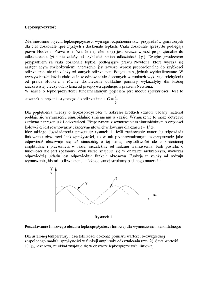 Lepkosprężystość Zdefiniowanie pojęcia lepkosprężystości wymaga rozpatrzenia tzw. przypadków granicznych dla ciał doskonale spre˛z˙ystych i doskonale lepkich. Ciała doskonale sprężyste podlegają prawu Hooke’a. Prawo to mówi, że naprężenie (τ) jest zawsze wprost proporcjonalne do odkształcenia (γ) i nie zależy od szybkości zmian odkształceń ( γ& ). Drugim granicznym przypadkiem są ciała doskonale lepkie, podlegające prawu Newtona, które wyraża się następującym stwierdzeniem: naprężenie jest zawsze wprost proporcjonalne do szybkości odkształceń, ale nie zależy od samych odkształceń. Pojęcia te są jednak wyidealizowane. W rzeczywistości każde ciało stałe w odpowiednio dobranych warunkach wykazuje odchylenia od prawa Hooke’a i równie dostatecznie dokładne pomiary wykazałyby dla każdej rzeczywistej cieczy odchylenia od przepływu zgodnego z prawem Newtona. W nauce o lepkospreżystości fundamentalnym pojęciem jest moduł sprężystości. Jest to stosunek naprężenia stycznego do odkształcenia G = τ . γ Dla pogłębienia wiedzy o lepkosprężystości w zakresie krótkich czasów badany materiał poddaje się wymuszeniu sinusoidalnie zmiennemu w czasie. Wymuszenie to może dotyczyć zarówno naprężeń jak i odkształceń. Eksperyment z wymuszeniem sinusoidalnym o częstości kołowej ω jest równoważny eksperymentowi chwilowemu dla czasu t = 1/ ω. Ideę takiego doświadczenia prezentuje rysunek 1. Jeśli zachowanie materiału odpowiada liniowemu obszarowi lepkosprężystości, to w tak przeprowadzonym eksperymencie jako odpowiedź obserwuje się też sinusoidę, o tej samej częstotliwości ale o zmienionej amplitudzie i przesuniętą w fazie, niezależnie od rodzaju wymuszenia. Jeśli postulat o liniowości nie jest spełniony, czyli układ znajduje się w obszarze nieliniowym, wówczas odpowiedzią układu jest odpowiednia funkcja okresowa. Funkcja ta zależy od rodzaju wymuszenia, historii odkształceń, a także od samej struktury badanego materiału Rysunek 1. Poszukiwanie liniowego obszaru lepkosprężystości liniowej dla wymuszenia sinusoidalnego: Dla ustalonej temperatury i częstotliwości dokonać pomiaru wartości bezwzględnej zespolonego modułu sprężystości w funkcji amplitudy odkształcenia (rys. 2). Stała wartość |G*(γο)| oznacza, że układ znajduje się w obszarze lepkosprężystości liniowej. Rysunek 2. Na rysunku 3 przedstawiono typowe przemiatanie częstotliwością w obszarze lepkosprężystości liniowej. W wyniku tak przeprowadzonego uzyskuje się zależność zespolonego modułu sprężystości od częstotliwośći. Rysunek 3. Cel Celem ćwiczenia jest wyznaczenie obszaru lepkosprężystości liniowej, oraz analiza zmian modułu sprężystości w dziedzinie częstotliwościowej dla 5% kleiku skrobi natywnej kukurydzianej. Metodyka pomiaru Pomiary zależności lepkości od temperatury wykonane zostaną za pomoc reometru RS150 Haake przy użyciu procedury programu RheoWin (Haake). Badania przeprowadzone będą w temperaturze 25oC, w zakresie częstotliwości od 0.1Hz do 100Hz. Wyposażenie reometr RS150 Haake waga techniczna waga analityczna dwie łaźnie wodne dwa mieszadła mechaniczne