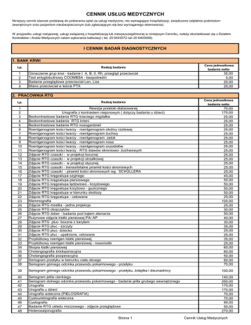 CENNIK USŁUG MEDYCZNYCH Niniejszy cennik stanowi podstawę do pobierania opłat za usługi medyczne, nie wymagające hospitalizacji, świadczone odpłatnie podmiotom zewnętrznym oraz pacjentom nieubezpieczonym (lub zgłaszającym się bez wymaganego skierowania). W przypadku usługi nietypowej, usługi związanej z hospitalizacją lub niewyszczególnionej w niniejszym Cenniku, należy skontaktować się z Działem Kontraktów i Analiz Medycznych celem wykonania kalkulacji ( tel. 25 6403572 lub 25 6403008) I CENNIK BADAŃ DIAGNOSTYCZNYCH 1. BANK KRWI Rodzaj badania Lp. 1 2 3 4 Oznaczenie grup krwi - badanie I A, B, 0, Rh; przegląd przeciwciał Test antyglobulinowy COOMBSA - bezpośredni Badanie przeglądowe przeciwciał Len, Liss Miano przeciwciał w teście PTA Cena jednostkowa badania netto 35,00 5,00 20,00 25,00 2. PRACOWNIA RTG Lp. Rodzaj badania Cena jednostkowa badania netto 1 2 3 4 5 6 7 8 9 10 11 12 13 14 15 16 17 18 19 20 21 22 23 24 25 26 27 28 29 30 31 32 33 34 35 36 37 38 Rewizja przetoki dializowanej Urografia z kontrastem niejonowym ( dotyczy badania u dzieci) Bezkontrastowe badanie RTG trzeciego migdałka Bezkontrastowe badanie RTG krtani Bezkontrastowe badanie RTG nosogardzieli Roentgenogram kości twarzy - roentgenogram okolicy czołowej Roentgenogram kości twarzy - roentgenogram żuchwy Roentgenogram kości twarzy - roentgenogram zatok Roentgenogram kości twarzy - roentgenogram nosa Roentgenogram kości twarzy - roentgenogram oczodołów Roentgenogram kości twarzy - RTG stawów skroniowo- żuchwowych Zdjęcie RTG czaszki - w projekcji bocznej Zdjęcie RTG czaszki - w projekcji strzałkowej Zdjęcie RTG czaszki - w projekcji stycznej Zdjęcie RTG czaszki - transorbitalne piramid kości skroniowych Zdjęcie RTG czaszki - piramid kości skroniowych wg. SCHÜLLERA Zdjęcie RTG kręgosłupa szyjnego Zdjęcie RTG kręgosłupa piersiowego Zdjęcie RTG kręgosłupa lędźwiowo - krzyżowego Zdjęcie RTG kręgosłupa krzyżowo - guzicznego Zdjęcie RTG kręgosłupa w kierunku skoliozy Zdjęcie RTG kręgosłupa - celowane Mammografia Zdjęcie RTG mostka - jedna projekcja Zdjęcie RTG obojczyków Zdjęcie RTG żeber - badanie pod kątem złamania Rutynowe zdjęcie klatki piersiowej PA/ AP Zdjęcie RTG płuc- boczne z barytem Zdjęcie RTG płuc - szczyty Zdjęcie RTG płuc- dziecko Zdjęcie RTG płuc - upatrzone, celowane Przyłóżkowy roentgen klatki piersiowej Przyłóżkowy roentgen klatki piersiowej - noworodki Skopia klatki piersiowej Cholangiografia śródoperacyjna Cholangiografia pooperacyjna Seriogram przełyku w kierunku ciała obcego Seriogram górnego odcinka przewodu pokarmowego - przełyku 70,00 170,00 25,00 25,00 25,00 25,00 25,00 25,00 25,00 25,00 25,00 25,00 25,00 25,00 25,00 25,00 45,00 50,00 50,00 50,00 50,00 25,00 100,00 25,00 30,00 50,00 40,00 30,00 35,00 25,00 25,00 35,00 25,00 60,00 60,00 50,00 60,00 70,00 39 Seriogram górnego odcinka przewodu pokarmowego - przełyku, żołądka i dwunastnicy 100,00 40 41 42 43 44 45 46 47 48 Seriogram jelita cienkiego Seriogram dolnego odcinka przewodu pokarmowego - badanie jelita grubego wewnętrznego Urografia Urografia u dzieci Urografia wsteczna (PIELOGRAFIA) Cystouretrografia wsteczna Cystografia Badanie RTG układu moczowego - zdjęcie przeglądowe Histerosalpinografia 140,00 250,00 170,00 170,00 70,00 70,00 90,00 50,00 270,00 Strona 1 Cennik Usług Medycznych 49 50 51 52 53 54 55 56 57 58 59 60 61 62 63 Zdjęcie RTG brzucha ZdjęcieRTG kości barku i ramienia Zdjęcie RTG kości łokcia - przedramienia RTG ręki/ nadgarstka - zdjęcie pourazowe Zdjęcie RTG dłoni/ nadgarstka Zdjęcie RTG kości kończyny górnej - kości palców Zdjęcie RTG kości miednicy/ biodra Zdjęcie RTG kości biodra - osiowe RTG uda Zdjęcie RTG kolana/ podudzia RTG kostki/ stopy RTG kości kończyny dolnej - inne (kości palców) Flebografia kończyny górnej Flebografia kończyny dolnej - ULTRAVIST Badanie RTG oka (ciało obce) 50,00 50,00 50,00 50,00 50,00 25,00 25,00 25,00 50,00 50,00 50,00 50,00 720,00 230,00 50,00 3. PRACOWNIA REZONANSU MAGNETYCZNEGO Cena jednostkowa badania netto Rodzaj badania Lp. 13 14 15 Rezonans magnetyczny mózgu/ pnia bez kontrastu Rezonans magnetyczny mózgu/ pnia z kontrastem Angiomr głowy bez kontrastu Angiomr głowy z kontrastem Rezonans magnetyczny kanału rdzeniowego na poziomie odcinka szyjnego bez kontrastu Rezonans magnetyczny kanału rdzeniowego na poziomie odcinka szyjnego z kontrastem Rezonans magnetyczny kanału rdzeniowego na poziomie odcinka lędźwiowego bez kontrastu Rezonans magnetyczny kanału rdzeniowego na poziomie odcinka lędźwiowego z kontrastem Rezonans magnetyczny kanału rdzeniowego na poziomie odcinka piersiowego bez kontrastu Rezonans magnetyczny kanału rdzeniowego na poziomie odcinka piersiowego z kontrastem Rezonans magnetyczny układu miśniowo - szkieletowego - kończyny górnej bez kontrastu Rezonans magnetyczny układu miśniowo - szkieletowego - kończyny dolnej bez kontrastu Rezonans magnetyczny układu miśniowo - szkieletowego - kończyny górnej z kontrastem Rezonans magnetyczny układu miśniowo - szkieletowego - kończyny dolnej z kontrastem Rezonans magnetyczny miednicy, pęcherza, stercza bez kontrastu Rezonans magnetyczny miednicy, pęcherza, stercza z kontrastuem Rezonans magnetyczny (jamy brzusznej) innych okolic i miejsc nieokreślonych bez kontrastu 440,00 710,00 450,00 730,00 450,00 710,00 480,00 710,00 480,00 710,00 630,00 630,00 860,00 860,00 540,00 830,00 520,00 16 Rezonans magnetyczny (jamy brzusznej) innych okolic i miejsc nieokreślonych z kontrastem 760,00 1 2 3 4 5 6 7 8 9 10 11 12 4. PRACOWNIA TOMOGRAFII KOMPUTEROWEJ Cena jednostkowa badania netto Rodzaj badania Lp. 1 2 3 4 5 6 7 8 9 TK piramid kości skroniowych (bez kontrastu) TK głowy i/lub szyi inne (bez kontrastu) TK głowy i/lub szyi - z kontrastem TK klatki piersiowej bez kontrastu TK klatki piersiowej z kontrastem TK nerek TK brzucha bez kontrastu TK brzucha z kontrastem TK angiografia