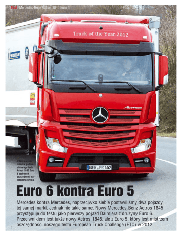 Test Mercedes-Benz Actros 1845 Euro 6 Udana niespodzianka: podczas zimowego testu Actros 1845 Euro 6 zachwycił oszczędnymi wartościami zużycia Euro 6 kontra Euro 5 Mercedes kontra Mercedes, naprzeciwko siebie postawiliśmy dwa pojazdy tej samej marki. Jednak nie takie same. Nowy Mercedes-Benz Actros 1845 przystępuje do testu jako pierwszy pojazd Daimlera z drużyny Euro 6. Przeciwnikiem jest także nowy Actros 1845, ale z Euro 5, który jest mistrzem oszczędności naszego testu European Truck Challenge (ETC) w 2012. Porównanie kosztów Euro 6/Euro 5: bazą porównawczą jest mistrz oszczędności ETC Actros 1845 Euro 5 N owy Mercedes-Benz Actros 1845 LS 4x2 Euro 6 BigSpace jako pierwszy pojazd z drużyny Daimlera Euro 6 pojawił się w KFZ-Anzeiger na odcinku testowym European Truck Challenge (ETC) podczas trudnych warunków zimowych. Na tym samym odcinku, ale latem, jego brat bliźniak, starszy o jedną normę, Actros 1845 Euro 5 zachwycił podczas ETC 2012 jako mistrz oszczędności. Wówczas w czasie testu porównawczego zmierzył się ze Scanią Euro 6, DAF Euro 5 i MAN. Tym razem nowy Actros 1845 Euro 6 w solowym teście w zimowych warunkach pokazał, dlaczego Daimler wygrywa w „pokerze” Euro 6. W końcu udział zamówień nowych, „czystych” Actrosów wzrósł na przełomie 2012/2013 aż o ponad 30 procent. Podczas zimowego testu nowy Actros 1845 Euro 6 rzeczywiście sprawił wielką niespodziankę: osiągnął przeciętne zużycie diesla 34,0 l/100 km przy przeciętnej prędkości 71,9 km/h (na autostradzie 32,9 l/100 km przy 78,6 km/h). Nowy Actros 1845 Euro 5 podczas letniego testu ETC 2012 osiągnął całkowity wynik z przecięt- nym zużyciem diesla 33,8 l/100 km i przeciętną prędkością 72,0 km/h (autostrada 32,8 l/100 km przy 78,5 km/h). runkach, które powodują sporą różnicę w zużyciu paliwa na niekorzyść Euro 6. Trzeba mieć to na uwadze. Na tym samym poziomie Test na odcinku długości 10000 km Tym samym oba pojazdy znajdują się praktycznie na tym samym poziomie zużycia paliwa. Przy zużyciu AdBlue na poziomie 2,5 proc. na każdy l/100 km Euro 6 zużywa 33,4 l/100 km na autostradzie i 34,4 l/100 km, jako wynik przy zużyciu mieszanym. Nowy Actros 1845 Euro 5 przy zużyciu AdBlue 4,1 proc. osiągnął odpowiednio 34,5 l/100 km przy przy zużyciu mieszanym i 33,5 l/100 km na autostradzie. Jednak wartości te nie pochodzą z prawdziwego testu porównawczego. Nowy Actros 1845 Euro 5 jeździł latem i był wyposażony w kabinę StreamSpace. Do tego posiadał handicap w postaci nowego ogumienia dla transportu dalekobieżnego i regionalnego o niskich oporach toczenia oraz zabudowaną naczepę pakietem aerodynamicznym. 1845 Euro 6 był wyposażony w kabinę BigSpace i dobre, ale konwencjonalne ogumienie dla transportu dalekobieżnego. No i jeździł zimą. Pojazdy testowane były w różnych wa- Jednak w certyfikowanym przez Dekra porównawczym teście zużycia na odcinku długości 10000 km nowy Actros Euro 6 osiągnął większe zużycie. Test był przeprowadzany w dniach 26 czerwca – 2 lipca w roku 2011 wraz z poprzednikiem Actrosem V6 1844 Euro 5 (MP 3), nowym Actrosem 1845 Euro 5 i nowym Actrosem 1845 Euro 6. Jeżdżono głównie po autostradzie. Na koniec maratonu V6-Euro 5 osiągnął wynik przeciętnego zużycia na poziomie 27,1 l diesla/100 km (100 procent wartości podstawowej). Nowy Actros Euro 5 osiągnął przeciętne zużycie 25,1 l diesla/100 km (7,6 proc. mniej), a nowy Actros Euro 6 25,9 l diesla/100 km (4,5 proc. mniej). Wartości pokazują innowacyjną technologię nowych 6-cylindrowych silników rzędowych z globalnej platformy Daimlera. Dla nowego Actrosa Euro 6, w porównaniu z nowym Actrosem Euro 5, oznacza to większe zużycie diesla o około 3,1 proc. Chociaż trzeba jeszcze doliczyć zużycie AdBlue (przy Euro 6 Test Mercedes-Benz Actros 1845 Euro 6 Fakty Actros 1845 Euro 6 Zdaniem testera Kabina Wspaniała ergonomia; perfekcyjne oprzyrządowanie; doskonałe wnętrze; łatwe wsiadanie, w wersji dla jednego kierowcy ponadprzeciętny komfort w międzynarodowym transporcie, równa podłoga; odpowiednia liczba schowków, duże schowki zewnętrzne i korzystnie ulokowane półki; łatwe przejście na stronę pasażera i do tunelu silnika Napęd Dane techniczne Masy i wymiary Ciągnik z naczepą plandeką, wymiary: ok. 16,50 x 2,50 x 4,0 m (długość x szerokość x wysokość); ciągnik siodłowy Mercedes-Benz Actros 1845 Euro 6 BigSpace 4x2; wymiary: długość: 5,86 m; szerokość (kabina): 2,50 m; wysokość (dach kabiny): około 3,79 m; rozstaw kół: 3,70 m; średnica koła skrętu: 15,00 m; masa własna (bez kierowcy z pełnym bakiem 390 l i 60 l AdBlue): ok. 7,7 t; dopuszczalne naciski na oś (z przodu/ z tyłu): 7,5 t/11,5 t; dopuszczalna mała całkowita/ masa całkowita zestawu: 18,0/40,0 t Napęd Silnik: Daimler OM 471 Euro 6; 6-cylindrowy, silnik rzędowy Diesla, turbosprężarka i intercooler, obniżenie emisji spalin, technologia SCR z AdBlue i Anti-Slip-Kat (ASC); wysokociśnieniowy wtrysk bezpośredni Common-Rail X-Pulse; pojemność: 12,8 l; moc: 449 KM (330 kW) przy 1800 obr./min; maksymalny moment obrotowy: 2200 Nm przy 1100 obr./min z elektronicznym zwiększeniem momentu obrotowego do 2400 Nm przy 1100 obr./min na 12. biegu 10 Sprzęgło: jednotarczowe sprzęgło suche z automatyczną regulacją Wyniki testu Skrzynia biegów: automatyczna Mercedes PowerShift 3, 12 biegów; przełożenia 14,93:1 do 1:1 Autostrada Tylna oś napędowa: hipoidalna oś sztywna z blokadą mechanizmu różnicowego; przełożenia: 2,61:1 Podwozie Zawieszenie: z przodu: zawieszenie płytkowo-paraboliczne, z tyłu: zawieszenie pneumatyczne Hamulce: dwuobwodowy, pneumatyczny układ hamulcowy z EBS i hamulcami tarczowymi; zintegrowane funkcje ABS, ASR; dekompresyjny hamulec silnikowy, retarder Voith; hamulec pomocniczy i postojowy działające na koła tylne poprzez akumulator sprężynowy. Systemy asystenckie: ESP, Active Brake Assist 