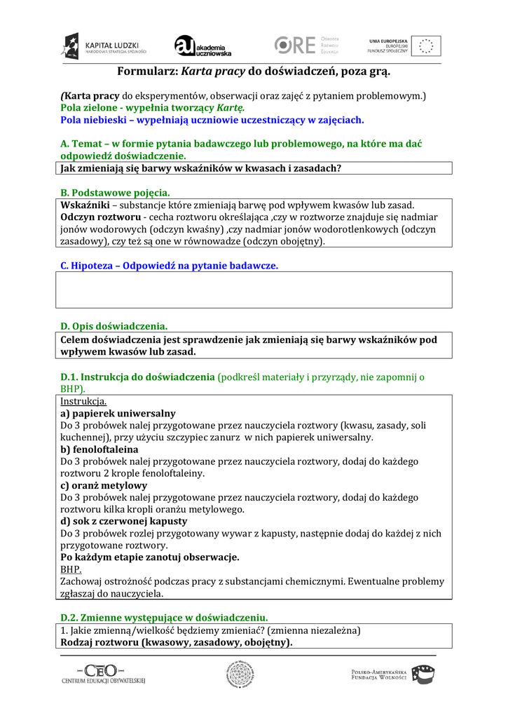 Formularz: Karta pracy do doświadczeń, poza grą. (Karta pracy do eksperymentów, obserwacji oraz zajęć z pytaniem problemowym.) Pola zielone - wypełnia tworzący Kartę. Pola niebieski – wypełniają uczniowie uczestniczący w zajęciach. A. Temat – w formie pytania badawczego lub problemowego, na które ma dać odpowiedź doświadczenie. Jak zmieniają się barwy wskaźników w kwasach i zasadach? B. Podstawowe pojęcia. Wskaźniki – substancje które zmieniają barwę pod wpływem kwasów lub zasad. Odczyn roztworu - cecha roztworu określająca ,czy w roztworze znajduje się nadmiar jonów wodorowych (odczyn kwaśny) ,czy nadmiar jonów wodorotlenkowych (odczyn zasadowy), czy też są one w równowadze (odczyn obojętny). C. Hipoteza – Odpowiedź na pytanie badawcze. D. Opis doświadczenia. Celem doświadczenia jest sprawdzenie jak zmieniają się barwy wskaźników pod wpływem kwasów lub zasad. D.1. Instrukcja do doświadczenia (podkreśl materiały i przyrządy, nie zapomnij o BHP). Instrukcja. a) papierek uniwersalny Do 3 probówek nalej przygotowane przez nauczyciela roztwory (kwasu, zasady, soli kuchennej), przy użyciu szczypiec zanurz w nich papierek uniwersalny. b) fenoloftaleina Do 3 probówek nalej przygotowane przez nauczyciela roztwory, dodaj do każdego roztworu 2 krople fenoloftaleiny. c) oranż metylowy Do 3 probówek nalej przygotowane przez nauczyciela roztwory, dodaj do każdego roztworu kilka kropli oranżu metylowego. d) sok z czerwonej kapusty Do 3 probówek rozlej przygotowany wywar z kapusty, następnie dodaj do każdej z nich przygotowane roztwory. Po każdym etapie zanotuj obserwacje. BHP. Zachowaj ostrożność podczas pracy z substancjami chemicznymi. Ewentualne problemy zgłaszaj do nauczyciela. D.2. Zmienne występujące w doświadczeniu. 1. Jakie zmienną/wielkość będziemy zmieniać? (zmienna niezależna) Rodzaj roztworu (kwasowy, zasadowy, obojętny). 2. Jaką zmienną/wielkość będziemy mierzyć - obserwować? (zmienna zależna) Zmianę barwy wskaźnika 3. Czego w naszym eksperymencie nie będziemy zmieniać? (zmienne kontrolne) Każdy podpunkt traktujemy jako oddzielne doświadczenie więc nie zmieniamy wskaźnika. D.3. Odnośniki literaturowe. Podręczniki z chemii do gimnazjum. D.4. Uczniowska dokumentacja doświadczenie (wyniki pomiarów, tabelki, rysunki, obliczenia… ). Uzupełnij tabelę wpisując barwy wskaźników w podanych roztworach: Odczyn Odczyn Odczyn Wskaźniki kwasowy zasadowy obojętny (KWAS) (ZASADA) (SÓL) Papierek uniwersalny (żółty) Fenoloftaleina (bezbarwna) Oranż metylowy (pomarańczowy) Sok z czerwonej kapusty (fioletowoniebieski) E. Wnioski z doświadczenia. Czy wyniki doświadczenia są zgodne z hipotezą? Wypowiedź uzasadnij. TAK NIE F. Podsumowanie. Nauczyłam / Nauczyłem się, że: Wybierz, co najmniej jedno ze zdań i dokończ je: Zaciekawiło mnie ………………………….. Udało mi się …………………………………. Chciałabym/ Chciałbym wiedzieć więcej ………………………………. Zauważyłem również ……………………………………… G. Praca domowa. 1. Przygotuj 3 szklanki, łyżeczkę, sodę oczyszczoną, kwasek cytrynowy. Zaparz szklankę mocnej herbaty. Do 3 szklanek wlej identyczne ilości naparu herbacianego. Do 1 dodaj ½ łyżeczki sody, do 2 dodaj ½ łyżeczki kwasku cytrynowego, ostatnią pozostaw do porównania. Jakie zmiany zaobserwowałeś? 2. Podobne doświadczenie możesz przeprowadzić używając jako wskaźników: soku z buraków, jagód, przyprawy curry lub czerwonej cebuli. Dodatkowe komentarze dla osób pragnących skorzystać z waszego pomysłu na doświadczenie. Zdjęcia z obserwacji: fenyloftaleina oranż metylowy papierek uniwersalny sok z kapusty