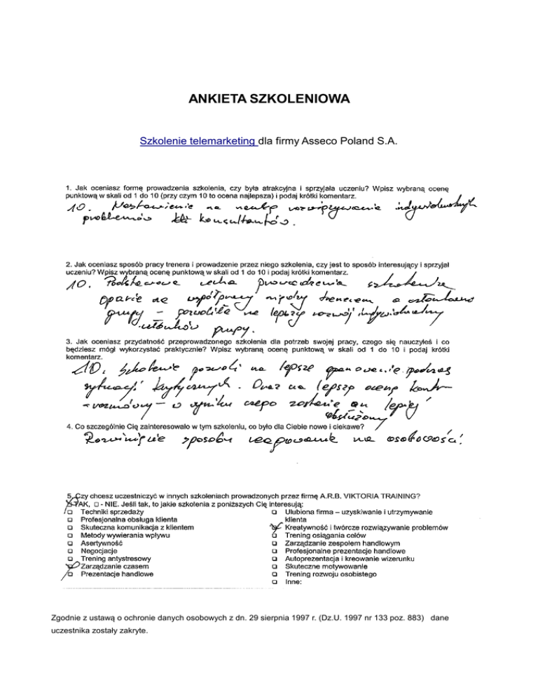 ANKIETA SZKOLENIOWA Szkolenie telemarketing dla firmy Asseco Poland S.A. Zgodnie z ustawą o ochronie danych osobowych z dn. 29 sierpnia 1997 r. (Dz.U. 1997 nr 133 poz. 883) dane uczestnika zostały zakryte. Biznes Edukator Sp. z o.o. - profesjonalna firma szkoleniowa zaprasza do współpracy szkoleniowej Dlaczego warto z nami współpracować, jakie mamy atuty jako organizator szkoleń? Jako firma szkoleniowa prowadzimy działalność szkoleniowo-doradczą od 1999 roku (do roku 2004 pod nazwą Viktoria Training sp. z o.o.). Realizujemy szkolenia dla przedsiębiorstw i urzędów w całym kraju. Przeprowadzamy szkolenia dla pracowników i menedżerów (ponad 14550 osób stan na czerwiec 2012). Uczestnicy naszych szkoleń oceniali naszą pracę bardzo wysoko: ocena szkolenia pod względem formy i praktyczności – 9,08 (w skali 1 do 10), ocena trenera prowadzącego szkolenie – 9,17. Dzięki wysokiej jakości naszych szkoleń zostaliśmy dwukrotnym laureatem Certyfikatu ORGANIZATOR SZKOLEŃ NAJWYŻSZEJ JAKOŚCI Jako firma szkoleniowa jesteśmy członkiem – założycielem Polskiej Izby Firm Szkoleniowych (od 2007 roku). Jesteśmy uprawnieni do posługiwania się certyfikatem STANDARD USŁUGI SZKOLENIOWEJ nadawany przez Polską Izbę Firm Szkoleniowych (zbiór zasad realizacji szkoleń mających na celu utrzymanie ich wysokiej jakości) Jesteśmy wpisani pod numerem 2.14/00107/2011 do rejestru firm szkoleniowych prowadzonych przez Wojewódzki Urząd Pracy w Warszawie Mamy w swoim zespole szkoleniowym 18 ekspertów (trenerów, coachów, doradców, aktorów) – wszyscy mają duże doświadczenie biznesowe oraz szkoleniowe. Możemy prowadzić szkolenia biznesowe w języku angielskim i francuskim (oczywiście oprócz polskiego:) Mamy doświadczenia w realizacji szkoleń w projektach finansowych ze środków EFS Specjalizujemy się w tworzeniu orygianalnych i innowacyjnych gier szkoleniowych dopasowanych do potrzeb klienta (gry teambuildingowe, gry handlowe i negocjacyjne, gry z zarządzania czasem, gry integracyjne) Jak wszystkie firmy szkoleniowe prowadzimy interaktywne szkolenia warsztatowe, natomiast od połowy 2010 roku z powodzeniem wdrażamy nowe, znacznie bardziej skuteczne i praktyczne szkolenia: POLIGON HANDLOWY, POLIGON NEGOCJACYJNY, POLIGON PREZENTACYJNY, POLIGON MENEDŻERSKI. Jakie szkolenia możemy przeprowadzić? SZKOLENIA ZAMKNIĘTE szkolenia handlowe: szkolenie skuteczna sprzedaż, szkolenie telemarketing, szkolenie prezentacje handlowe, szkolenie negocjacje handlowe, szkolenie obsługa klienta, szkolenie zarządzanie czasem handlowca, szkolenie psychologia klienta, szkolenie techniki sprzedaży, szkolenie komunikacja z klientem, szkolenie windykacja, szkolenie przyjmowanie reklamacji, szkolenie zarządzanie sprzedażą, szkolenie emisja głosu; szkolenia menedżerskie: szkolenie zarządzanie ludźmi, szkolenie komunikacja z pracownikami, szkolenie negocjacje biznesowe dla menedżerów, szkolenie prezentacje i wystąpienia publiczne, szkolenie zarządzanie zmianą, szkolenie ocena okresowa, szkolenie zarządzanie zespołem w sytuacji kryzysowej, szkolenie rekrutacja i selekcja, szkolenie zarządzanie konfliktem w zespole, szkolenie coaching w pracy menedżera, szkolenie strategiczne myślenie, szkolenie feedback i komunikowanie trudnych rzeczy, szkolenie komunikacja kryzysowa; szkolenia z budowania zespołów: szkolenie motywacja zespołu, szkolenie komunikacja wewnętrzna, szkolenie teamwork, szkolenie integracyjne, szkolenie z teambuildingu, szkolenie budowanie współpracy, szkolenie synergia zespołu, szkolenie etapy rozwoju zespołu, szkolenie Ja w zespole; szkolenia rozwojowe: szkolenie zarządzanie czasem, szkolenie asertywność, szkolenie antystresowe, szkolenie zarządzanie emocjami, szkolenie komunikacja interpersonalna, szkolenie osiąganie celów, szkolenie autoprezentacja, szkolenie rozwiązywanie konfliktów, szkolenie kreatywność, szkolenie savoir-vivre i elegancja w biznesie, szkolenie train the trainer, szkolenie siła motywacji, szkolenie etyka w biznesie, szkolenie rozwój osobisty; SZKOLENIA OTWARTE: szkolenie ze sprzedaży, szkolenie z telemarketingu, szkolenie z obsługi klienta, szkolenie z prezentacji, szkolenie z negocjacji, szkolenie z zarządzania ludźmi, szkolenie z zarzadzania czasem, szkolenie zarzadzanie stresem, szkolenie z prezentacji i wystąpień publicznych, szkolenie ze skutecznej sprzedaży – psychologia klienta i techniki sprzedaży, , szkolenie z obsługi reklamacji i trudnego klienta, szkolenie z rekrutacji i selekcji, coaching dla menedżerów, szkolenie lidership, szkolenie z zarządzania zmianą, szkolenie z oceny okresowej, szkolenie z komunikacji organizacyjnej, szkolenie z zarządzania sszkolenie z savoir-vivre'u i elegancji w biznesie, szkolenie z komunikacji kryzysowej, szkolenie z komunikacji interpersonalnej, szkolenie z obsługi klienta, szkolenie ze sprzedaży i obsługi klienta w sklepieprzedażą; SZKOLENIA INDYWIDUALNE GRY SZKOLENIOWE: gra negocjacyjna, gra handlowa, gra z budowania zespołu, gra z zarządzania czasem, gra integracyjna, gra motywacyjna, gra teambuildingowa, gra komunikacyjna, gra z zarządzania zespołem, gra z zarządzania sytuacją kryzysową; POLIGONY SZKOLENIOWE: Poligon Handlowy (szkolenie sprzedażowe, szkolenie telemarketingowe, szkolenie negocjacyjne, szkolenie z obsługi klienta, szkolenie z prezentacji handlowych), Poligon Menedżerski (szkolenie komunikacyjne, szkolenie motywacyjne, szkolenie na temat zarządzania ludźmi), Poligon Prezentacyjny (szkolenie wystąpienia publiczne i prezentacje, szkolenie trenerskie) SZKOLENIA I IMPREZY INTEGRACYJNE ROZWIJAJ SIĘ I WYGRYWAJ! *** szkolenia biznesowe i rozwojowe *** ROZWIJAJ SIĘ I WYGRYWAJ!