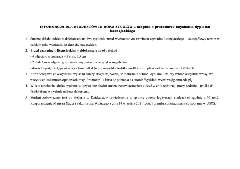 INFORMACJA DLA STUDENTÓW III ROKU STUDIÓW 1-stopnia o procedurze uzyskania dyplomu licencjackiego 1. Student składa indeks w dziekanacie na dwa tygodnie przed wyznaczonym terminem egzaminu licencjackiego - szczegółowy termin w każdym roku wyznacza dziekan ds. studenckich. 2. Przed egzaminem licencjackim w dziekanacie należy złożyć: - 4 zdjęcia o wymiarach 4,5 cm x 6,5 cm - 2 dodatkowe zdjęcia, gdy zamawiany jest odpis w języku angielskim - dowód wpłaty za dyplom w wysokości 60 zł (odpis angielski dodatkowo 40 zł) → opłata nadana na koncie USOSweb 3. Kartę obiegową ze wszystkimi wpisami należy złożyć najpóźniej w momencie odbioru dyplomu - należy zebrać wszystkie wpisy, we wszystkich kolumnach oprócz kolumny ‘Promotor’→ karta do pobrania na stronie Wydziału www.wngig.amu.edu.pl. 4. W celu uzyskania odpisu dyplomu w języku angielskim student zobowiązany jest złożyć w dniu rejestracji pracy podanie – prośbę do Prodziekana o wydanie takiego dokumentu. 5. Student zobowiązany jest do złożenia w Dziekanacie oświadczenia w sprawie zwrotu legitymacji studenckiej zgodnie z §7 ust.2. Rozporządzenia Ministra Nauki i Szkolnictwa Wyższego z dnia 14 września 2011 roku. Formularz oświadczenia do pobrania w USOS.