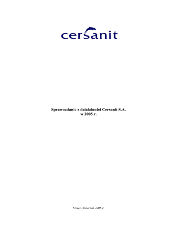 Sprawozdanie z działalności Cersanit S.A. w 2005 r. Kielce, kwiecień 2006 r. Cersanit S.A. __________________________________________________________________________________________________________________________________________________________________________________________________________________________________________________________________ Do Akcjonariuszy, Partnerów handlowych, Klientów i Pracowników Grupy Cersanit Szanowni Państwo, Z wielką satysfakcją zwracam się do Państwa, podsumowując 2005 rok – kolejny, bardzo pomyślny okres dla Grupy Cersanit, w którym osiągnęliśmy wszystkie przyjęte do realizacji cele. W 2005 roku przychody ze sprzedaży i zysk netto Grupy wzrosły do rekordowego poziomu i wyniosły odpowiednio: 653.629 tys. zł i 144.613 tys. zł., co oznacza w porównaniu z 2004 rokiem ponad 12%-owy wzrost przychodów ze sprzedaży i ponad 23%-owy wzrost zysku netto. Kapitalizacja Spółki na Giełdzie Papierów Wartościowych w Warszawie osiągnęła historyczne maksimum, wynosząc na 03.04.2006 r. blisko 2,2 mld PLN. Czyniąc starania o coraz większe uznanie dla naszych produktów wśród Klientów, kontynuowaliśmy wprowadzanie do sprzedaży w 2005 r. licznych nowości asortymentowych, m.in.: nowych kolekcji płytek ceramicznych, nowych linii ceramiki sanitarnej, a także nowych wzorów mebli łazienkowych, wanien akrylowych oraz kabin prysznicowych. Jestem przekonany, że staną się one powodem dużego zadowolenia dla Nabywców naszych wyrobów. Jak informowaliśmy Państwa w lipcu ubiegłego roku, zakończona została budowa fabryki mebli łazienkowych w starachowickiej Specjalnej Strefie Ekonomicznej – jednego z najnowocześniejszych tego typu obiektów w Europie. Zakończenie wspomnianego projektu przyczyni się do poszerzenia bogatej oferty cersanitowskich produktów. Drodzy Państwo, strategia dla Cersanitu zakłada dalsze, systematyczne umacnianie pozycji Grupy, jako dostawcy kompleksowego wyposażenia łazienek, zarówno na rynku krajowym, jak i zagranicznym. Pragnę w tym miejscu po raz kolejny zapewnić Akcjonariuszy Spółki, że wzorem lat ubiegłych, również w przyszłości nie będziemy szczędzić wysiłków, w celu najbardziej efektywnego gospodarowania powierzonym nam przez Państwa kapitałem. Mirosław Jędrzejczyk Prezes Zarządu Cersanit S.A. Kielce, 3 kwietnia 2006 r. __________________________________________________________________________________________________________________________________________________________________________________________________________________________________________________________________ Sprawozdanie z działalności - SA- R / 2005 2 Cersanit S.A. __________________________________________________________________________________________________________________________________________________________________________________________________________________________________________________________________ 1. Wstęp 1.1. Grupa Kapitałowa Cersanit Cersanit S.A. jest największym krajowym dostawcą kompleksowego wyposażenia łazienek. Spółka prowadzi działalność w ramach Grupy Kapitałowej. Cersanit S.A. prowadzi dystrybucję produktów wytworzonych w zależnych spółkach produkcyjnych oraz innych towarów służących wyposażeniu łazienek. Każda z zależnych spółek krajowych produkuje inny asortyment wyrobów. Organizacja Grupy sprzyja m.in. oszczędnościom kosztowym oraz umożliwia budowanie jednolitego wizerunku marki CERSANIT, jako synonimu „WSZYSTKIEGO DO ŁAZIENKI”. Grupę tworzą: Cersanit S.A. z siedzibą w Kielcach – spółka matka, podmiot dystrybucyjny, lider na krajowym rynku kompleksowego wyposażenia łazienek. Cersanit I Sp. z o.o. w Krasnymstawie (podmiot w 100% zależny od Cersanit S.A.) największy polski producent ceramiki sanitarnej. Cersanit II S.A. w Specjalnej Strefie Ekonomicznej w Starachowicach (spółka w 99,99% zależna od Cersanit S.A.) – producent mebli łazienkowych, kabin prysznicowych, brodzików i wanien akrylowych. Cersanit III S.A. w Specjalnej Strefie Ekonomicznej w Wałbrzychu ( spółka w 99,99% zależna od Cersanit S.A.) - jeden z największych i najnowocześniejszych zakładów w Europie produkujących płytki ceramiczne i gresy. Cersanit Invest Sp. z o.o. z siedzibą w Nowogradzie-Wołyńskim na Ukrainie (spółka w 100% zależna od Cersanit S.A.) - potencjalny producent wyrobów wyposażenia łazienek. Cersanit Ukraina Sp. z o.o. z siedzibą w Nowogradzie-Wołyńskim na Ukrainie (spółka w 99,99% zależna od Cersanit Invest Sp. z o.o.) – potencjalny producent wyrobów wyposażenia łazienek. Cersanit S.A. nie posiada oddziałów (zakładów). Spółki zależne od Cersanit S.A. – poza Cersanit Invest Sp. z o.o. – nie posiadają jednostek zależnych ani stowarzyszonych. Cersanit S.A. posiada przedstawicielstwa w Moskwie i Kijowie, sporządzające samodzielnie sprawozdania finansowe. 1.2. Kapitał zakładowy Cersanit S.A. 1.2.1. Cersanit S.A. jest przedsiębiorstwem z kapitałem zakładowym w wysokości 13.294.629 zł., obejmującym: 56.328.000 akcji zwykłych na okaziciela serii A o wartości nominalnej 0,10 zł. każda, 50.000.000 akcji zwykłych na okaziciela serii B o wartości nominalnej 0,10 zł. każda, 10.000.000 akcji zwykłych na okaziciela serii C o wartości nominalnej 0,10 zł. każda, 16.618.290 akcji zwykłych na okaziciela serii D o wartości nominalnej 0,10 zł. każda. 1.2.1.1. W 2005 r. przeprowadzono podział wartości nominalnej akcji Spółki w stosunku 1:10. __________________________________________________________________________________________________________________________________________________________________________________________________________________________________________________________________ Sprawozdanie z działalności - SA- R / 2005 3 Cersanit S.A. ___________________________________________________________________________________________________________________________________