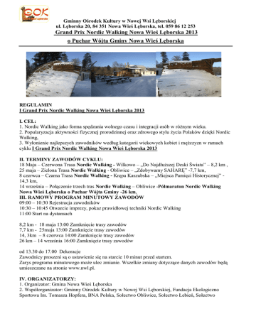 Gminny Ośrodek Kultury w Nowej Wsi Lęborskiej ul. Lęborska 20, 84 351 Nowa Wieś Lęborska, tel. 059 86 12 253 Grand Prix Nordic Walking Nowa Wieś Lęborska 2013 o Puchar Wójta Gminy Nowa Wieś Lęborska REGULAMIN I Grand Prix Nordic Walking Nowa Wieś Lęborska 2013 I. CEL: 1. Nordic Walking jako forma spędzania wolnego czasu i integracji osób w różnym wieku. 2. Popularyzacja aktywności fizycznej prorodzinnej oraz zdrowego stylu życia Polaków dzięki Nordic Walking, 3. Wyłonienie najlepszych zawodników według kategorii wiekowych kobiet i mężczyzn w ramach cyklu I Grand Prix Nordic Walking Nowa Wieś Lęborska 2013 II. TERMINY ZAWODÓW CYKLU: 18 Maja – Czerwona Trasa Nordic Walking - Wilkowo – „Do Najdłuższej Deski Świata” – 8,2 km , 25 maja – Zielona Trasa Nordic Walking - Obliwice – „Zdobywamy SAHARĘ” -7,7 km, 8 czerwca – Czarna Trasa Nordic Walking - Krępa Kaszubska – „Miejsca Pamięci Historycznej” 14,3 km, 14 września – Połączenie trzech tras Nordic Walking – Obliwice -Półmaraton Nordic Walking Nowa Wieś Lęborska o Puchar Wójta Gminy -26 km, III. RAMOWY PROGRAM MINUTOWY ZAWODÓW 09:00 – 10:30 Rejestracja zawodników 10:30 – 10:45 Otwarcie imprezy, pokaz prawidłowej techniki Nordic Walking 11:00 Start na dystansach 8,2 km - 18 maja 13:00 Zamknięcie trasy zawodów 7,7 km - 25maja 13:00 Zamknięcie trasy zawodów 14, 3km – 8 czerwca 14:00 Zamknięcie trasy zawodów 26 km – 14 września 16:00 Zamknięcie trasy zawodów od 13.30 do 17.00 Dekoracje Zawodnicy proszeni są o ustawienie się na starcie 10 minut przed startem. Zarys programu minutowego może ulec zmianie. Wszelkie zmiany dotyczące danych zawodów będą umieszczane na stronie www.nwl.pl. IV. ORGANIZATORZY: 1. Organizator: Gmina Nowa Wieś Lęborska 2. Współorganizator: Gminny Ośrodek Kultury w Nowej Wsi Lęborskiej, Fundacja Ekologiczno Sportowa Im. Tomasza Hopfera, BNA Polska, Sołectwo Obliwice, Sołectwo Łebień, Sołectwo Lędziechowo, Sołectwo Krępa Kaszubska, Sołectwo Garczegorze, Sołectwo Wilkowo, Stadnina Koni Koniczynka, Nadleśnictwo Lębork, Lokalna Grupa Działania „Bursztynowy Pasaż”. V. DYSTANSE 1. Uczestnicy startują na 4 dystansach: 7,7 km, 8,2 km, 14,3 km, 26 km. VI. ZGŁOSZENIA DO ZAWODÓW BEZ OPŁATY STARTOWEJ 1. Rejestracja osobista w Biurze Zawodów w dniu zawodów: 9.00 -10.30. 18 Maja – Czerwona Trasa - Wilkowo – „Do Najdłuższej Deski Świata” – 8,2 km , 25 maja – Zielona Trasa - Obliwice – „Zdobywamy SAHARĘ” -7,7 km, 8 czerwca – Czarna Trasa, Krępa Kaszubska – „Miejsca Pamięci Historycznej” - 14,3 km, 14 września – Połączenie trzech tras – Obliwice -Półmaraton Nordic Walking Nowa Wieś Lęborska o Puchar Wójta Gminy -26 km, 2. Zawodnicy dokonując rejestracji i startując w zawodach oświadczają, że biorą w nich udział na własną odpowiedzialność wyrażają zgodę na wykorzystanie wizerunku do celów promocji I Grand Prix Nordic Walking Nowa Wieś Lęborska 2013 na zdjęciach i filmach wykonanych podczas imprez. 3. Rejestracja traktowana jest jako przyjęcie warunków Regulaminu I Grand Prix Nordic Walking Nowa Wieś Lęborska 2013 4. Uczestnictwo w imprezie jest nieodpłatne 5. Zawodnik otrzyma nieodpłatnie numer startowy + 4 agrafki, ważny przez cztery imprezy. 6. Zawodnicy otrzymają posiłek regeneracyjny w postaci parowanego lub pieczonego ziemniaka oraz napoje na trasach Nordic Walking w Stanicach Turystycznych. 6. Weryfikacja zawodników oraz wydawanie numerów startowych będą odbywały się w Biurze Zawodów w dniu imprezy. VII. ZASADY UCZESTNICTWA I TECHNIKA MARSZU 1. Podczas imprezy obowiązują przepisy zawodów Polskiej Federacji Nordic Walking. 2. Pomiar czasu i ustalenie kolejności zawodników na mecie będzie dokonywane elektronicznym systemem pomiarowym. Oficjalnym czasem jest czas netto. 3. Osoby niepełnosprawne startujące na dłuższych dystansach są klasyfikowane z innymi kategoriami. 4. Wszyscy zawodnicy muszą zostać zweryfikowani (z dowodem tożsamości ze zdjęciem, a osoby niepełnosprawne również z orzeczeniem o niepełnosprawności) w Biurze Zawodów. 5. Osoby startujące w zawodach zobowiązane są posiadać zaświadczenie od lekarza o braku przeciwwskazań do wysiłku fizycznego oraz podpisać w biurze zawodów stosowne oświadczenie o braku przeciwwskazań do wysiłku fizycznego w zawodach NW. W szczególnych przypadkach wymagających badania medycznego decyzja obsługi medycznej zawodów przed i w czasie zawodów jest ostateczna. 6. W zawodach mogą brać udział obywatele wszystkich krajów świata. 7. Każdy uczestnik zobowiązany jest posiadać strój sportowy stosowny do warunków pogodowych. Zaleca się posiadanie własnych kijów do NW. Posiadanie kijów składanych wymaga od uczestnika zwrócenia uwagi na dokładne dokręcenie części składowych kija, jak również uwzględnienie podczas treningu, rozgrzewki oraz zawodów faktu, iż kij składany jest mniej wytrzymały niż kij jednoczęściowy. 8. Podczas marszu wszyscy zawodnicy muszą mieć numery startowe przymocowane do koszulek sportowych na klatce piersiowej. Zasłanianie numeru startowego w części lub w całości lub jego modyfikacja jest zabroniona pod karą dyskwalifikacji. Nie można używać własnych numerów startowych. 9 Zawodnicy zobowiązani są zwrócić szczególną uwagę na bezpieczeństwo podczas rozgrzewki, aby nie uderzyć lub nie ukłuć kijkiem współćwiczącego. 10. W marszach o podziale na kategorie wiekowe decyduje rok urodzenia. 11. Uczestnicy zostaną sklasyfikowani następujących kategoriach wiekowych: Dystans 7,7 km , 8,2 km, 14,3 km, 26 km lp. kategoria wiekowa Lat 1. K / M 18-29 18 – 29 2. K / M 30-39 30 – 39 3. K / M 40-49 40 – 49 5. K / M 50-59 50 – 59 6. K / M 60-69 60 – 69 7. K / M 70+ 70 i więcej 12. W I Grand Prix Nordic Walking Nowa Wieś Lęborska 2013 Nordic Walking obowiązuje podział na kategorie Kobiet i Męż