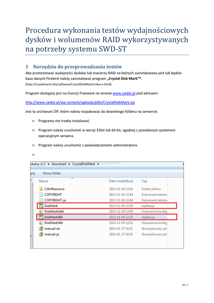 Procedura wykonania testó w wydajnoś ciowych dyskó w i wolumenó w RAID wykorzystywanych na potrzeby systemu SWD-ST 1 Narzędzia do przeprowadzania testów Aby przetestować wydajności dysków lub macierzy RAID na których zainstalowana jest lub będzie baza danych Firebird należy zainstalować program „Crystal Disk Mark”®. (http://crystalmark.info/software/CrystalDiskMark/index-e.html) Program dostępny jest na licencji Freeware na stronie www.swdst.pl pod adresem: http://www.swdst.pl/wp-content/uploads/pliki/CrystalDiskMark.zip Jest to archiwum ZIP, które należy rozpakować do dowolnego folderu na serwerze. • Programu nie trzeba instalować. • Program należy uruchomić w wersji 32bit lub 64 bit, zgodnej z posiadanym systemem operacyjnym serwera. • Program należy uruchomić z poświadczeniami administratora. • str. 1 1.1 Wykonanie testów wydajności Jeżeli w serwerze zainstalowany jest więcej niż jeden dysk fizyczny (lub skonfigurowany jest więcej niż jeden wolumen logiczny RAID) to kroki testu należy przeprowadzić dla woluminu na którym jest umieszczona lub ma być umieszczona baza danych systemu SWD-ST. W takiej sytuacji należy wraz z wynikami testów przesłać literę dysku (C lub D lub E etc.), oraz ścieżkę do pliku swd.gdb, na którym zlokalizowany jest lub będzie planowo plik bazy danych systemu SWDST. Wykonywane testy, generują obciążenie wybranego dysku (lub wolumenu logicznego macierzy) i na czas wykonywania spowolnią pracę innych programów zainstalowanych na serwerze – w tym także spowolnią działanie systemu SWD-ST. Zalecamy wyłączenie stacji klienckich SWD-ST na czas testów. Średni czas wykonywania testów w zależności od wydajności i rozmiaru samych dysków lub wolumenów RAID mieści się w granicach od 2 do 5 minut. 1.1.1 Test „ALL” 1. Po uruchomieniu programu, należy wybrać literę dysku zgodnie z opisem powyżej. 2. Następnie należy wybrać opcję 500MB 3. Następnie kliknąć klawisz „All” – test rozpocznie się, a w pasku programu pojawi się napis „Preapring… 4. Należy cierpliwie czekać na zakończenie całego testu, tj wypełenienia się ostaniej sekcji obliczeń. str. 2 1.1.2 Odczyt wyników testu Po zakończeniu testu należy zebrać wyniki poprzez program: 1. Najpierw wykonujemy Print-Screen. Plik ze screenem programu najlepiej wykonać jest poprzez najechanie kursorem myszy na ekran testu(programu), a następnie używając skrótu [ALT] + [PRN SCR]. (wtedy kopiuje się tylko program pod myszką, a nie cały pulpit) 2. Następnie otworzyć program graficzny Paint. Menu START URUCHOM i wpisać: mspaint str. 3 3. Następnie wkleić obraz ze schowka klawiszem WKLEJ, następnie klawisz PRZYTNIJ: 4. Taki plik należy zapisać jako PNG lub JPEG (NAZWA zgodna ze wzorem poniżej) str. 4 5. Następnie należy wrócić do programu testowego i skopiować wyniki do schowka: 6. Następnie należy skopiować zawartość do pliku tekstowego (NAZWA zgodna ze wzorem poniżej): 1.1.3 Przesłanie wyników przeprowadzonych testów. Zebrane wyniki testów (2 pliki PNG/JPG + TXT) należy przygotować do wysyłki zgodnie ze wzorem: • • „XXYY.NAZWA JEDNOSTKI.20141218.png”; „XXYY.NAZWA JEDNOSTKI.20141218.txt”; o Gdzie XXYY to początek numeru zgodnego z numeracją PSP w EWID99 o NAZWA JEDNOSTKI to nazwa komendy, w której robiony jest test o 20141218 to aktualna data bez znaków rozdzielających Przykładowa nazwa pliku: „1203.KM PSP Bielsko-Biała.20141218.png” • W ramach przekazywanych informacji należy podać adres IP i ścieżkę do pliku bazy danych swd.gdb Zestaw plików należy przesłać na wskazany w adres e-mail w KW PSP. str. 5