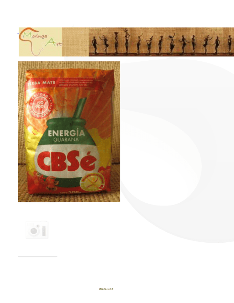 Strona 1 z 2 Herbata Yerba Mate CBSe Energia guarana. Yerba Mate czyli ostrokrzew paragwajski to roślina uprawiana w krajach Ameryki Południowej (Argentyna, Paragwaj i Brazylia). Regeneruje siły, poprawia przemianę materii i oczyszcza organizm z toksyn. Skład: herbata Yerba Mate 63%, mięta polej 35,98%, werbena cytrynowa 0,5%, ekstrakt z guarany 0,22%, aromaty 0,3%. Wsypać herbatę - 1/2 naczynia, zalać gorącą wodą ok. 70 - 80 st. C. Można zaparzać 4-5 razy. 50 g. Pochodzenie: Argentyna Strona 2 z 2