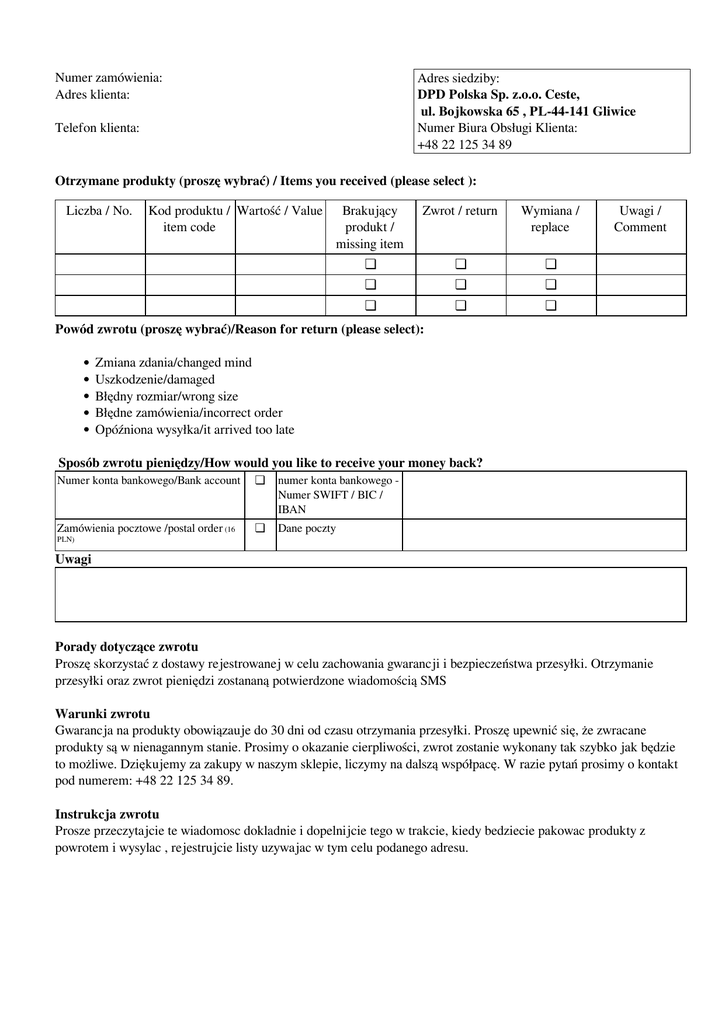 Numer zamówienia: Adres klienta: Adres siedziby: DPD Polska Sp. z.o.o. Ceste, ul. Bojkowska 65 , PL-44-141 Gliwice Numer Biura Obsługi Klienta: +48 22 125 34 89 Telefon klienta: Otrzymane produkty (proszę wybrać) / Items you received (please select ): Liczba / No. Kod produktu / Wartość / Value item code Brakujący produkt / missing item Zwrot / return Wymiana / replace ❏ ❏ ❏ ❏ ❏ ❏ ❏ ❏ ❏ Uwagi / Comment Powód zwrotu (proszę wybrać)/Reason for return (please select): Zmiana zdania/changed mind Uszkodzenie/damaged Błędny rozmiar/wrong size Błędne zamówienia/incorrect order Opóźniona wysyłka/it arrived too late Sposób zwrotu pieniędzy/How would you like to receive your money back? Numer konta bankowego/Bank account ❏ numer konta bankowego Numer SWIFT / BIC / IBAN Zamówienia pocztowe /postal order (16 ❏ Dane poczty PLN) Uwagi Porady dotyczące zwrotu Proszę skorzystać z dostawy rejestrowanej w celu zachowania gwarancji i bezpieczeństwa przesyłki. Otrzymanie przesyłki oraz zwrot pieniędzi zostananą potwierdzone wiadomością SMS Warunki zwrotu Gwarancja na produkty obowiązauje do 30 dni od czasu otrzymania przesyłki. Proszę upewnić się, że zwracane produkty są w nienagannym stanie. Prosimy o okazanie cierpliwości, zwrot zostanie wykonany tak szybko jak będzie to możliwe. Dziękujemy za zakupy w naszym sklepie, liczymy na dalszą współpacę. W razie pytań prosimy o kontakt pod numerem: +48 22 125 34 89. Instrukcja zwrotu Prosze przeczytajcie te wiadomosc dokladnie i dopelnijcie tego w trakcie, kiedy bedziecie pakowac produkty z powrotem i wysylac , rejestrujcie listy uzywajac w tym celu podanego adresu. Powered by TCPDF (www.tcpdf.org)