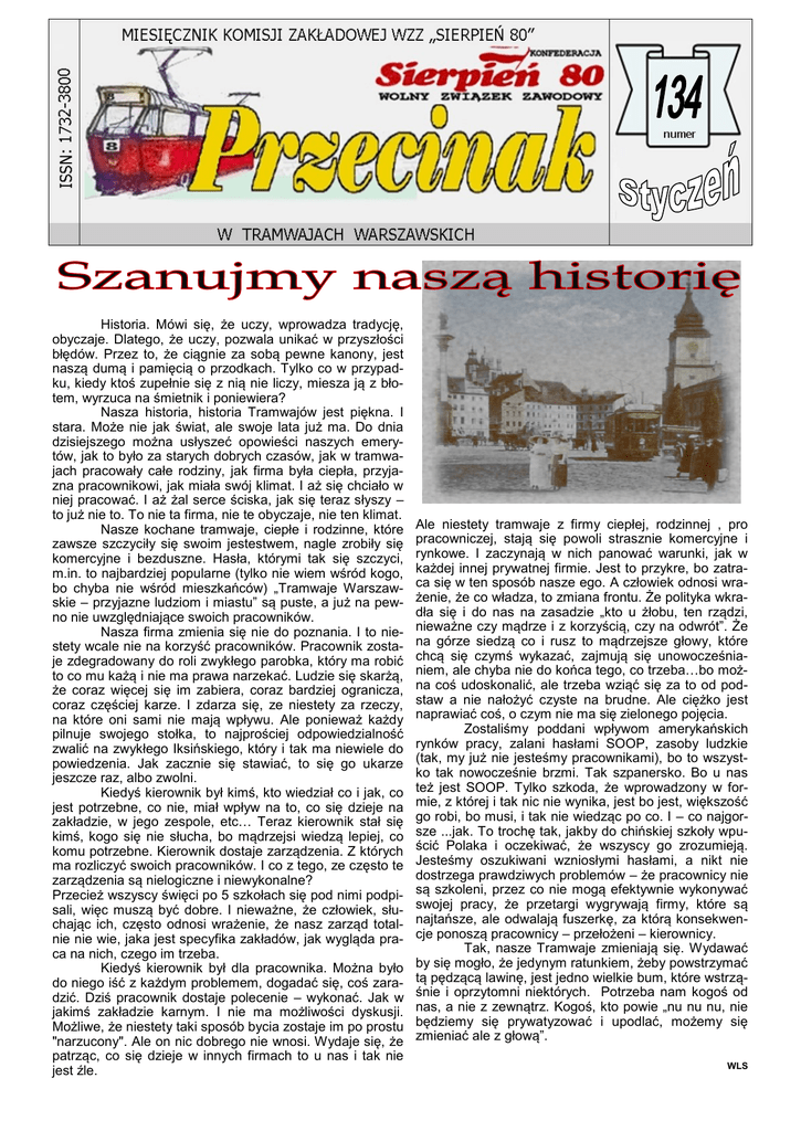 Historia. Mówi się, że uczy, wprowadza tradycję, obyczaje. Dlatego, że uczy, pozwala unikać w przyszłości błędów. Przez to, że ciągnie za sobą pewne kanony, jest naszą dumą i pamięcią o przodkach. Tylko co w przypadku, kiedy ktoś zupełnie się z nią nie liczy, miesza ją z błotem, wyrzuca na śmietnik i poniewiera? Nasza historia, historia Tramwajów jest piękna. I stara. Może nie jak świat, ale swoje lata już ma. Do dnia dzisiejszego można usłyszeć opowieści naszych emerytów, jak to było za starych dobrych czasów, jak w tramwajach pracowały całe rodziny, jak firma była ciepła, przyjazna pracownikowi, jak miała swój klimat. I aż się chciało w niej pracować. I aż żal serce ściska, jak się teraz słyszy – to już nie to. To nie ta firma, nie te obyczaje, nie ten klimat. Nasze kochane tramwaje, ciepłe i rodzinne, które zawsze szczyciły się swoim jestestwem, nagle zrobiły się komercyjne i bezduszne. Hasła, którymi tak się szczyci, m.in. to najbardziej popularne (tylko nie wiem wśród kogo, bo chyba nie wśród mieszkańców) „Tramwaje Warszawskie – przyjazne ludziom i miastu” są puste, a już na pewno nie uwzględniające swoich pracowników. Nasza firma zmienia się nie do poznania. I to niestety wcale nie na korzyść pracowników. Pracownik zostaje zdegradowany do roli zwykłego parobka, który ma robić to co mu każą i nie ma prawa narzekać. Ludzie się skarżą, że coraz więcej się im zabiera, coraz bardziej ogranicza, coraz częściej karze. I zdarza się, ze niestety za rzeczy, na które oni sami nie mają wpływu. Ale ponieważ każdy pilnuje swojego stołka, to najprościej odpowiedzialność zwalić na zwykłego Iksińskiego, który i tak ma niewiele do powiedzenia. Jak zacznie się stawiać, to się go ukarze jeszcze raz, albo zwolni. Kiedyś kierownik był kimś, kto wiedział co i jak, co jest potrzebne, co nie, miał wpływ na to, co się dzieje na zakładzie, w jego zespole, etc… Teraz kierownik stał się kimś, kogo się nie słucha, bo mądrzejsi wiedzą lepiej, co komu potrzebne. Kierownik dostaje zarządzenia. Z których ma rozliczyć swoich pracowników. I co z tego, ze często te zarządzenia są nielogiczne i niewykonalne? Przecież wszyscy święci po 5 szkołach się pod nimi podpisali, więc muszą być dobre. I nieważne, że człowiek, słuchając ich, często odnosi wrażenie, że nasz zarząd totalnie nie wie, jaka jest specyfika zakładów, jak wygląda praca na nich, czego im trzeba. Kiedyś kierownik był dla pracownika. Można było do niego iść z każdym problemem, dogadać się, coś zaradzić. Dziś pracownik dostaje polecenie – wykonać. Jak w jakimś zakładzie karnym. I nie ma możliwości dyskusji. Możliwe, że niestety taki sposób bycia zostaje im po prostu "narzucony". Ale on nic dobrego nie wnosi. Wydaje się, że patrząc, co się dzieje w innych firmach to u nas i tak nie jest źle. Ale niestety tramwaje z firmy ciepłej, rodzinnej , pro pracowniczej, stają się powoli strasznie komercyjne i rynkowe. I zaczynają w nich panować warunki, jak w każdej innej prywatnej firmie. Jest to przykre, bo zatraca się w ten sposób nasze ego. A człowiek odnosi wrażenie, że co władza, to zmiana frontu. Że polityka wkradła się i do nas na zasadzie „kto u żłobu, ten rządzi, nieważne czy mądrze i z korzyścią, czy na odwrót”. Że na górze siedzą co i rusz to mądrzejsze głowy, które chcą się czymś wykazać, zajmują się unowocześnianiem, ale chyba nie do końca tego, co trzeba…bo można coś udoskonalić, ale trzeba wziąć się za to od podstaw a nie nałożyć czyste na brudne. Ale ciężko jest naprawiać coś, o czym nie ma się zielonego pojęcia. Zostaliśmy poddani wpływom amerykańskich rynków pracy, zalani hasłami SOOP, zasoby ludzkie (tak, my już nie jesteśmy pracownikami), bo to wszystko tak nowocześnie brzmi. Tak szpanersko. Bo u nas też jest SOOP. Tylko szkoda, że wprowadzony w formie, z której i tak nic nie wynika, jest bo jest, większość go robi, bo musi, i tak nie wiedząc po co. I – co najgorsze ...jak. To trochę tak, jakby do chińskiej szkoły wpuścić Polaka i oczekiwać, że wszyscy go zrozumieją. Jesteśmy oszukiwani wzniosłymi hasłami, a nikt nie dostrzega prawdziwych problemów – że pracownicy nie są szkoleni, przez co nie mogą efektywnie wykonywać swojej pracy, że przetargi wygrywają firmy, które są najtańsze, ale odwalają fuszerkę, za którą konsekwencje ponoszą pracownicy – przełożeni – kierownicy. Tak, nasze Tramwaje zmieniają się. Wydawać by się mogło, że jedynym ratunkiem, żeby powstrzymać tą pędzącą lawinę, jest jedno wielkie bum, które wstrząśnie i oprzytomni niektórych. Potrzeba nam kogoś od nas, a nie z zewnątrz. Kogoś, kto powie „nu nu nu, nie będziemy się prywatyzować i upodlać, możemy się zmieniać ale z głową”. WLS W przeciągu ostatnich dwóch lat Zarząd Spółki podjął decyzję o rozwiązaniu umów o pracę na stanowisku motorniczego z osobami, które wykonywały ten fach w niepełnym wymiarze (np. 1/8 czy 1/4 etatu). Patrząc na tą decyzję od strony rynku pracy to dobra decyzja, ponieważ zwolniły się etaty dla bezrobotnych, jest jednak i druga strona medalu, na której chciałbym się skupić. Otóż w znakomitej większości na wspomnianym niepełnym etacie pracowali mechanicy, mistrzowie, dyspozytorzy, kierownicy, instruktorzy C.R., czy instruktorzy nauki jazdy. I chociaż wiele osób grzmiało, że dorabiają się fortuny to ich praca przynosiła ogromne zyski dla firmy. Jakie? Wiadomo, że nic w przyrodzie nie ginie, a wręcz jest to system naczyń połączonych. Mechanicy. Nie raz i nie dwa byłem świadkiem rozmów w kantorku mistrzów żeby ustawić kłopotliwy wagon, który wymaga dokładniejszego przyjrzenia się na brygadę, którą będzie, jako motorniczy obsługiwał mistrz czy mechanik. Wiadomo, że jemu łatwiej zdiagno