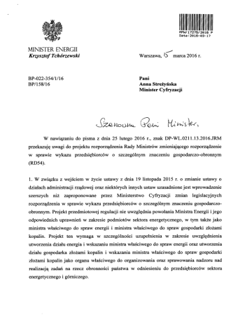 RPW/17275/2016 P Data:2016-03-17 MINISTER ENERGII Krzysztof Tchdrzewski Warszawa, BP-022-354/1/16 BP/158/16 Pani Anna Strezynska Minister Cyfryzacji marca2016r. W nawi^aniu do pisma z dnia 25 lutego 2016 r., znak DP-WL.0211.13.2016.JRM przekazuj? uwagi do projektu rozporz^dzenia Rady Ministrow zmieniaj^cego rozporz^dzenie w sprawie wykazu przedsi^biorcow o szczegolnym znaczeniu gospodarczo-obronnym (RD54). 1. W zwi^zku z wejsciem w zycie ustawy z dnia 19 listopada 2015 r. o zmianie ustawy o dziaiach administracji rz^dowej oraz niektorych innych ustaw uzasadnione jest wprowadzenie szerszych niz zaproponowane przez Ministerstwo Cyfiyzacji zmian legislacyjnych rozporz^dzenia w sprawie wykazu przedsi^biorcow o szczegolnym znaczeniu gospodarczoobronnym. Projekt przedmiotowej regulacji nie uwzgl§dnia powolania Ministra Energii i jego odpowiednich uprawnien w zakresie podmiotow sektora energetycznego, w tym takze jako ministra wlasciwego do spraw energii i ministra wlasciwego do spraw gospodarki zlozami kopalin. Projekt ten wymaga w szczegolnosci uzupelnienia w zakresie uwzgl^dnienia utworzenia dziahi energia i wskazaniu ministra wlasciwego do spraw energii oraz utworzenia dziahi gospodarka zlozami kopalin i wskazania ministra wlasciwego do spraw gospodarki zlozami kopalin jako organu wlasciwego do organizewania oraz sprawowania nadzoru nad realizacj^ zadah na rzecz obrormosci panstwa w odniesieniu do przedsi?biorc6w sektora energetycznego i gomiczego. 2. Maj^c na uwadze powyzsze projekt rozporz^dzenia Rady Ministrow zmieniaj^cy rozporz^dzenie w sprawie wykazu przedsi^biorcow o szczegolnym znaczeniu gospodarczoobronnym powinien zawierac nast^puj^ce zapisy: 1) W § 2 w pkt 8 kropk? zast?puje si§ srednikiem i dodaje si? pkt 9 i 10 w brzmieniu: „9. minister wlasciwy do spraw energii - w odniesieniu do przedsi§biorc6w wymienionych w cz^sci IX zal^cznika do rozporz^dzenia; 10. minister wlasciwy do spraw gospodarki zlozami kopalin - w odniesieniu do przedsi?biorc6w wymienionych w cz^sci X zal^cznika do rozporz^dzenia." 2) W zal^czniku do rozporz^dzenia: a) dodaje si§ cz^sc IX w brzmieniu: „IX. Minister wlasciwy do spraw energii: 1. PGE Energia Odnawialna S.A. w Warszawie 2. PGE Gomictwo i Energetyka Konwencjonalna S.A. w Belchatowie S.Polskie Sieci Elektroenergetyczne S.A. w Konstancinie-Jeziomie 4. TAURON Wytwarzanie S.A. w Jaworznie 5. ENERGA Elektrownie Ostrol^ka S.A. w Ostrol^ce 6. ENEA Wytwarzanie Sp. z o.o. w Swierzach Gomych 7. ENGIE Energia Polska S.A. w Zawadzie 8. EDF Polska S.A. w Warszawie 9. CEZ Skawina S.A. w Skawinie 10. Zespol Elektrowni P^tnow-Adamow-Konin S.A. w Koninie 11. Operator Gazoci^ow Przesylowych GAZ-SYSTEM S.A. w Warszawie 12. Polskie LNG S.A. w Swinoujsciu 13. PGE Dystrybucja S.A. w Lublinie 14. ENERGA-OPERATOR S.A. w Gdansku 15. RWE STOEN Operator Sp. z o.o. w Warszawie 16. TAURON Ekoenergia Sp. z o.o. w Jeleniej Gorze 17. Zespol Elektrowni Wodnych Niedzica S.A. w Niedzicy 18. TAURON Ekoserwis Sp. z o.o. w Roznowie 19. ENEA Operator Sp. z o.o. w Poznaniu 20. Polski Koncem Naftowy ORLEN S.A. w Ptocku 21. Grupa LOTOS S.A. w Gdansku 2/3 22. Przedsi?biorstwo Eksploatacji Ruroci^ow Naftowych "Przyjazn" S.A. w Plocku 23. Polskie Gomictwo Naftowe i Gazownictwo S.A. w Warszawie 24. System Gazoci^ow Tranzytowych "EUROPOL GAZ" S.A. w Warszawie 25. Lotos Petrobaltic S.A. w Gdansku 26. Przedsi?biorstwo Przeladunku Paliw Plynnych "NAFTOPORT" Sp. z o.o. w Gdansku 27. "GATX Rail Poland" Sp. z o.o. w Warszawie 28. "Operator Logistyczny Paliw Plynnych" Sp. z o.o. w Plocku 29. TAURON Dystrybucja S.A. w Krakowie 30. Polska Spolka Gazownictwa Sp. z o.o. w Warszawie 31. Operator Systemu Magazynowania Sp. z o.o. w D^bogorzu 32. Inowroclawskie Kopalnie Soli "SOLINO" S.A. w Inowroclawiu 33. Exalo Drilling S.A. w Pile" 34. Instytut Lotnictwa w Warszawie 35. EXATEL SA w Warszawie 36. Zarz^dca Rozliczen SA w Warszawie 37. ENERGO-TEL SA w Warszawie. d) dodaje si? cz?sc X w brzmieniu: „X. Minister wlasciwy do spraw gospodarki zlozami kopalin: 1. PAK Kopalnia W§gla Brunatnego Konin S.A. w Kleczewie 2. PAK Kopalnia W^gla Brunatnego Adamow S.A. w Turku 3. Jastrz?bska Spolka W^glowa S.A. w Jastrz?biu-Zdroju 4. Katowicki Holding W^glowy S.A. w Katowicach 5. Kompania Wqglowa S.A. w Katowicach 6. Lubelski W^giel "Bogdanka" S.A. w Bogdance 7. TAURON Wydobycie S.A w Jaworznie.". Reasumuj^c, rekomenduj? by przedmiotowa regulacja stanowila przedmiot dalszych prac legislacyjnych z uwzgl^dnieniem ww. uwag. V 3/3