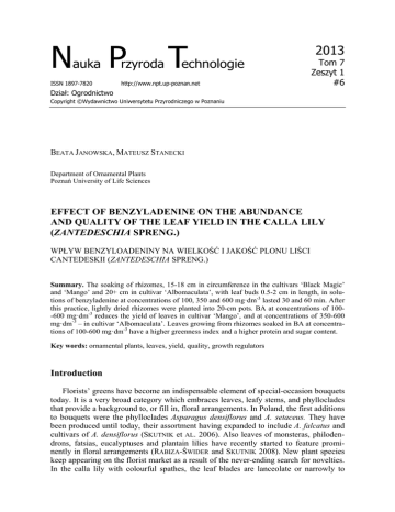 Nauka Przyroda Technologie ISSN 1897-7820 http://www.npt.up-poznan.net 2013 Tom 7 Zeszyt 1 #6 Dział: Ogrodnictwo Copyright ©Wydawnictwo Uniwersytetu Przyrodniczego w Poznaniu BEATA JANOWSKA, MATEUSZ STANECKI Department of Ornamental Plants Poznań University of Life Sciences EFFECT OF BENZYLADENINE ON THE ABUNDANCE AND QUALITY OF THE LEAF YIELD IN THE CALLA LILY (ZANTEDESCHIA SPRENG.) WPŁYW BENZYLOADENINY NA WIELKOŚĆ I JAKOŚĆ PLONU LIŚCI CANTEDESKII (ZANTEDESCHIA SPRENG.) Summary. The soaking of rhizomes, 15-18 cm in circumference in the cultivars ‘Black Magic’ and ‘Mango’ and 20+ cm in cultivar ‘Albomaculata’, with leaf buds 0.5-2 cm in length, in solutions of benzyladenine at concentrations of 100, 350 and 600 mg·dm-3 lasted 30 and 60 min. After this practice, lightly dried rhizomes were planted into 20-cm pots. BA at concentrations of 100-600 mg·dm-3 reduces the yield of leaves in cultivar ‘Mango’, and at concentrations of 350-600 mg·dm-3 – in cultivar ‘Albomaculata’. Leaves growing from rhizomes soaked in BA at concentrations of 100-600 mg·dm-3 have a higher greenness index and a higher protein and sugar content. Key words: ornamental plants, leaves, yield, quality, growth regulators Introduction Florists’ greens have become an indispensable element of special-occasion bouquets today. It is a very broad category which embraces leaves, leafy stems, and phylloclades that provide a background to, or fill in, floral arrangements. In Poland, the first additions to bouquets were the phylloclades Asparagus densiflorus and A. setaceus. They have been produced until today, their assortment having expanded to include A. falcatus and cultivars of A. densiflorus (SKUTNIK et AL. 2006). Also leaves of monsteras, philodendrons, fatsias, eucalyptuses and plantain lilies have recently started to feature prominently in floral arrangements (RABIZA-ŚWIDER and SKUTNIK 2008). New plant species keep appearing on the florist market as a result of the never-ending search for novelties. In the calla lily with colourful spathes, the leaf blades are lanceolate or narrowly to 2 Janowska B., Stanecki M., 2013. Effect of benzyladenine on the abundance and quality of the leaf yield in the calla lily (Zantedeschia Spreng.). Nauka Przyr. Technol. 7, 1, #6. broadly sagittate, medium- to dark-green, and covered or not with white, transparent spots (JANOWSKA 2006). They could be a valuable addition to bouquets obtained from plantations of those plants grown for cut flowers. In the calla lily, the yield of leaves depends on the cultivar. In the present article, an assessment is made of the effect of benzyladenine on the yield and quality of leaves of three calla lily cultivars with colourful spathes. Material and methods The research was conducted in the Department of Ornamental Plants of the Poznań University of Life Sciences from 12 May to 4 November 2007 and from 18 April to 30 October 2011. The cultivars employed were ‘Albomaculata’ deriving from Zantedeschia albomaculata (Hook.) Baill., ‘Black Magic’ coming from an inter-species hybrid of Z. elliottiana (Wats.) Engl. × Z. macrocarpa Engl., and ‘Mango’ deriving from Zantedeschia sp. The plants were grown in a plastic tunnel. Before planting, rhizomes of those cultivars were soaked in benzyladenine. The soaking of rhizomes, 15-18 cm in circumference in the cultivars ‘Black Magic’ and ‘Mango’ and 20+ cm in cultivar ‘Albomaculata’, with leaf buds 0.5-2 cm in length, in solutions of benzyladenine at concentrations of 100, 350 and 600 mg·dm-3 lasted 30 and 60 min. After this practice, lightly dried rhizomes were planted into 20-cm pots into a medium consisting of peat with a pH of 6.2, enriched with a slow-release fertilizer Osmocote Plus (3-4M) in the amount of 3 g·dm-3 and mixed with fresh, shredded pine bark at a rate of 3:1 (v:v). The plants, grown in a plastic tunnel, were fed starting with WRiL, Poznań: 33-43. of benzyladenine and gibberellic acid on the growth and flowering of Anemone ce start vegetation, when the leaves were fully developed, lime saltpetre at a concentration of 0.2% was foliar applied once. One treatment (BA concentration × soaking time) involved five plants in three replications. The yield of leaves developing from a single rhizome was determined as well as their greenness index, in SPAD units, using a SPAD-502 Chlorophyll Meter (GREGORCZYK and RACZYŃSKA 1997, GREGORCZYK et AL. 1998). In addition, protein and sugar content in the leaves was calculated. The determination of protein content was made with the help of BRADFORD’s (1976) method. 2 ml of a solution of Coomassie Brilliant Blue G-250 (CBB) in 85% orthophosphoric acid was added to 100 μl of a diluted extract, with the extraction in a phosphorate-potassium buffer (pH 7.0). After 10 min absorbance was measured at a wavelength of 595 nm. Protein content was determined from a curve plotted for albumin. Total saccharides were determined using the antron reagent (BJÖRNESJÖ 1955). The method consists in the fact that under the influence of sulphuric acid, all saccharides transform into derivatives of furfural, which, together with antron, yield blue-green products. The intensity of the colour is proportional to their content. Weighted portions (0.5 g) were crushed in a mortar with 5 cm3 of distilled water and the homogenate was centrifuged for 20 min. 1 cm3 of the supernatant thus obtained was added to 2 cm3 of a cooled antron reagent (0.02% in concentrated H2SO4), and then the content of the test tubes was heated, slowly mixed, on a water bath at 90°C for 14 min. After the tubes 3 Janowska B., Stanecki M., 2013. Effect of benzyladenine on the abundance and quality of the leaf yield in the calla lily (Zantedeschia Spreng.). Nauka Przyr. Technol. 7, 1, #6. were cooled, the absorbance of the solutions was measured in a spectrophotometer at a wavelength of 620 nm. The content of saccharides was read from a standard curve prepa