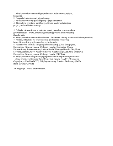1. Międzynarodowe stosunki gospodarcze - podstawowe pojęcia, kategorie. 2. Gospodarka światowa i jej podmioty. 3. Międzynarowdowy podział pracy i jego znaczenie. 4. Korzyści z wymiany handlowej, główne teorie wyjaśniające przyczyny handlu światowego. 5. Polityka ekonomiczna w zakresie międzynarodowych stosunków gospodarczych - istota, środki zagranicznej polityki ekonomicznej (handlowej). 6. Międzynarodowe stosunki walutowe i finansowe - kursy walutowe i bilans płatniczy. 7. Procesy integracji we współczesnej gospodarce światowej istota i formy integracji gospodarczej w świecie. 8. Podstawowe kierunki integracji ekonomicznej, (Unia Europejska, Europejskie Stowarzyszenie Wolnego Handlu, Europejski Obszar Ekonomiczny, Północnoamerykańska Strefa Wolnego Handlu (NAFTA), Stowarzyszenie Krajów Azji Południowo-Wschodniej (ASEAN), ŚrodkowoEuropejskie Stowarzyszenie Wolnego Handlu (CEFTA). 9. Międzynarodowe organizacje gospodarcze we współczesnym świecie - Układ Ogólny w Sprawie Taryf Celnych i Handlu (GATT) / Światowa Organizacja Handlu (WTO), Międzynarodowy Fundusz Walutowy (IMF), Bank Światowy (WB). 10, Migracje i skutki ekonomiczne.