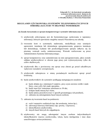 Załącznik Nr 1 do Instrukcji zarządzania systemem informatycznym służącym do przetwarzania danych osobowych w Ośrodku Kultury w Drawsku Pomorskim REGULAMIN UŻYTKOWNIKA SYSTEMÓW TELEINFORMATYCZNYCH OŚRODKA KULTURY W DRAWSKU POMORSKIM §1.Zasady korzystania ze sprzętu komputerowego i systemów informatycznych: 1) użytkownik zobowiązany jest do bezterminowego zachowania w tajemnicy informacji, których ujawnienie mogłoby narazić Pracodawcę na szkodę; 2) tworzenie kont w systemach, nadawanie, modyfikacja oraz usunięcie uprawnień, instalacja lub deinstalacja oprogramowania, grupowa instalacja lub deinstalacja, wydanie lub przekonfigurowanie sprzętu odbywa się na pisemny wniosek osoby zainteresowanej. Wnioski realizowane są przez Administratora Systemu Informatycznego; 3) sprzęt komputerowy oraz zainstalowane na nim oprogramowanie, jakie zostało oddane użytkownikowi w okresie jego pracy jest wykorzystywany tylko do celów służbowych; 4) użytkownik dba o powierzony mu sprzęt oraz chroni go przed szkodliwym wpływem warunków zewnętrznych; 5) użytkownik zabezpiecza w miarę posiadanych możliwości sprzęt przed kradzieżą; 6) hasła użytkowników do systemów podlegają następującym zasadom: a) hasło składa się z minimum 8 znaków, przy czym zawiera wielki i małe litery, oraz cyfry lub znaki specjalne, b) hasło musi być zmieniane minimum co 30 dni, c) kolejne hasła muszą być różne, d) hasła należy przechowywać w sposób gwarantujący ich poufność, e) zabrania się udostępniania haseł innym osobom; 7) zabrania się tworzenia haseł na podstawie: a) b) c) d) cech i numerów osobistych (np. dat urodzenia, imion itp.), sekwencji klawiszy klawiatury (np. qwerty, 12qwaszx), identyfikatora użytkownika, innych haseł łatwych do odgadnięcia. 8) użytkownicy nie mogą udostępniać innym osobom indywidualnych identyfikatorów (nazwa użytkownika, token, karta inteligentna i inne dane umożliwiające uwierzytelnienie); 9) użytkownik zobowiązany jest przestrzegać zasady „czystego biurka” i „czystego ekranu”. Stosowanie tych zasad sprowadza się do: a) schowania wszystkich dokumentów, nośników danych, związanych z informacjami chronionymi w miejsce niedostępne dla innych osób po zakończeniu pracy, b) odchodząc od stacji roboczej, użytkownik blokuje komputer uniemożliwiając zalogowanie się do systemu osobie nieuprawnionej, c) kończąc pracę użytkownik zamyka wszystkie aplikacje, wylogowuje się z systemu i wyłącza komputer; 10) zabrania się użytkownikom uruchamiać (w tym aplikacji przenośnych ang. portable) i instalować na sprzęcie służbowym jakiegokolwiek oprogramowania. Instalacji oprogramowania dokonuje Administrator Systemu Informatycznego, na podstawie pisemnych wniosków; 11) zabrania się użytkownikom: a) omijania mechanizmów kontroli (np. używania serwerów proxy), b) testowania wdrożonych zabezpieczeń, c) skanowania urządzeń sieciowych, serwerów oraz stacji roboczych pod kątem badania świadczonych usług, d) wyłączania programów uruchamianych automatycznie przy starcie systemu, e) odinstalowania programów, f) przyłączania i użytkowania prywatnego sprzętu, w tym używania prywatnych nośników danych, g) podejmowania jakichkolwiek prób ingerencji w sprzęt komputerowy, poza czynnościami związanymi z codzienną eksploatacją; 12) ważne pliki należy przechowywać w wyznaczonych folderach na serwerach, które gwarantują bezpieczeństwo danych; 13) za bezpieczeństwo danych przechowywanych lokalnie na komputerze odpowiada użytkownik; 14) zabrania się przechowywania na sprzęcie służbowym gier oraz plików multimedialnych np. filmów, obrazów, dźwięków nie związanych z zadaniami służbowymi; 15) na sprzęcie komputerowym instaluje się oprogramowanie do ilościowej jak i jakościowej kontroli użytkowników, które stosuje się w celu okresowej kontroli wykorzystania sprzętu służbowego przez użytkowników; 16) w przypadku używania zewnętrznych nośników danych na stacji roboczej użytkownik wcześniej wykonuje skanowanie programem antywirusowym wszystkich danych na nośniku; 17) w przypadku gdy użytkownik wykryje zainfekowane dane niezależnie od źródła (np. strona internetowa, załącznik poczty elektronicznej, dane na nośniku) bezzwłocznie powiadamia Informatycznego; o tym fakcie Administratora Systemu 18) zabrania się użytkownikom samodzielnego przenoszenia i podłączania sprzętu teleinformatycznego między stanowiskami pracy. Czynności te wykonuje Administrator Systemu Informatycznego; 19) kończąc świadczenie pracy dla Pracodawcy, użytkownik ma obowiązek przekazać wszystkie dane (dokumenty papierowe, pliki oraz inne posiadane informacje) związane z wykonywanymi zadaniami służbowymi przełożonemu. §2.Zasady korzystania z poczty elektronicznej: 1) nadzór i opiekę techniczną nad systemem poczty elektronicznej sprawuje Administrator Systemu Informatycznego. Użytkownik zobowiązany jest do sprawdzania własnej skrzynki poczty elektronicznej; 2) poczta elektroniczna jest wykorzystywana tylko do celów służbowych; 3) zabrania się rozsyłania m.in.: a) ogłoszeń komercyjnych, b) tzw. łańcuszków szczęścia (listów, które wykorzystując elementy socjotechniki generują niepożądany ruch na serwerach poczty elektronicznej), c) treści wulgarnych, d) materiałów erotycznych, e) treści niezgodnych z obowiązującymi przepisami prawa, f) treści prawem chronionych bez odpowiedniego zabezpieczenia np. szyfrowanie; 4) korespondencja, którą przechowuje i dostarcza system pocztowy jest własnością Pracodawcy; 5) pracodawca w celach dowodowych oraz bezpieczeństwa systemów ma prawo do kontroli skrzynek pocztowych użytkowników. O wynikach kontroli powinien być poinformowany użytkownik; 6) nie należy otwierać linków oraz załączników poczty elektronicznej ze źródeł niewiadomego pochodzenia; 7) w przypadku dostępu do poczty elektroniczn