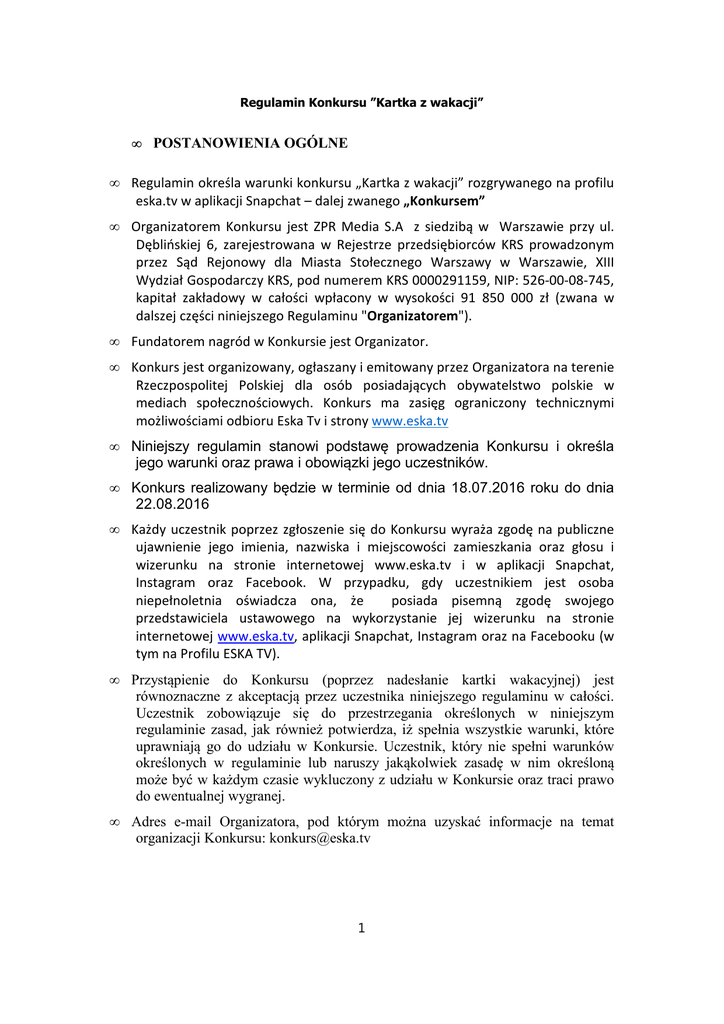 Regulamin Konkursu ”Kartka z wakacji” • POSTANOWIENIA OGÓLNE • Regulamin określa warunki konkursu „Kartka z wakacji” rozgrywanego na profilu eska.tv w aplikacji Snapchat – dalej zwanego „Konkursem” • Organizatorem Konkursu jest ZPR Media S.A z siedzibą w Warszawie przy ul. Dęblińskiej 6, zarejestrowana w Rejestrze przedsiębiorców KRS prowadzonym przez Sąd Rejonowy dla Miasta Stołecznego Warszawy w Warszawie, XIII Wydział Gospodarczy KRS, pod numerem KRS 0000291159, NIP: 526-00-08-745, kapitał zakładowy w całości wpłacony w wysokości 91 850 000 zł (zwana w dalszej części niniejszego Regulaminu "Organizatorem"). • Fundatorem nagród w Konkursie jest Organizator. • Konkurs jest organizowany, ogłaszany i emitowany przez Organizatora na terenie Rzeczpospolitej Polskiej dla osób posiadających obywatelstwo polskie w mediach społecznościowych. Konkurs ma zasięg ograniczony technicznymi możliwościami odbioru Eska Tv i strony www.eska.tv • Niniejszy regulamin stanowi podstawę prowadzenia Konkursu i określa jego warunki oraz prawa i obowiązki jego uczestników. • Konkurs realizowany będzie w terminie od dnia 18.07.2016 roku do dnia 22.08.2016 • Każdy uczestnik poprzez zgłoszenie się do Konkursu wyraża zgodę na publiczne ujawnienie jego imienia, nazwiska i miejscowości zamieszkania oraz głosu i wizerunku na stronie internetowej www.eska.tv i w aplikacji Snapchat, Instagram oraz Facebook. W przypadku, gdy uczestnikiem jest osoba niepełnoletnia oświadcza ona, że posiada pisemną zgodę swojego przedstawiciela ustawowego na wykorzystanie jej wizerunku na stronie internetowej www.eska.tv, aplikacji Snapchat, Instagram oraz na Facebooku (w tym na Profilu ESKA TV). • Przystąpienie do Konkursu (poprzez nadesłanie kartki wakacyjnej) jest równoznaczne z akceptacją przez uczestnika niniejszego regulaminu w całości. Uczestnik zobowiązuje się do przestrzegania określonych w niniejszym regulaminie zasad, jak również potwierdza, iż spełnia wszystkie warunki, które uprawniają go do udziału w Konkursie. Uczestnik, który nie spełni warunków określonych w regulaminie lub naruszy jakąkolwiek zasadę w nim określoną może być w każdym czasie wykluczony z udziału w Konkursie oraz traci prawo do ewentualnej wygranej. • Adres e-mail Organizatora, pod którym można uzyskać informacje na temat organizacji Konkursu: [email protected] 1 • Nagrody • Nagrodą główną w Konkursie jest dwuosobowy bilet na galę Eska Music Awards 2016 o wartości 160zł • Organizator zastrzega, że w trakcie trwania Konkursu może zostać przez niego ufundowana nagroda pocieszenia w postaci wybranej przez niego płyty lub innego gadżetu o wartości nieprzekraczającej 50 zł (słownie: pięćdziesiąt złotych) – przyznanie każdej takiej nagrody oraz ich liczba i uczestnicy, którym będzie ona przyznana zależy od decyzji komisji konkursowej. Na zasady rozdania ewentualnych nagród pocieszenia każdy z uczestników przystępując do Konkursu, wyraża zgodę. • Organizator oświadcza, iż wszystkie nagrody zostaną wydane zgodnie z obowiązującymi przepisami prawa podatkowego. • Organizator nie ponosi odpowiedzialności za niemożność odbioru lub nieodebranie którejkolwiek nagrody, z jakiejkolwiek przyczyny leżącej po stronie nagrodzonego uczestnika. • Organizator nie ponosi odpowiedzialności za zmianę miejsca zamieszkania i/lub podanego przez uczestnika Konkursu adresu lub zmianę innych danych – uniemożliwiającą kontakt z tym uczestnikiem lub odebranie przez niego zestawu nagród/nagrody. • O szczegółach odbioru i realizacji nagród zwycięzca każdej edycji Konkursu zostanie poinformowany przez Organizatora za pośrednictwem rozmowy telefonicznej oraz przez aplikację Snapchat. • Nagrody nieodebrane przez zwycięzcę Konkursu w terminie 30 dni od rozstrzygnięcia Konkursu przechodzą na własność Organizatora. • Przy odbiorze przez zwycięzcę edycji Konkursu nagrody zobowiązany jest on okazać dokument potwierdzający jego tożsamość lub w przypadku odbioru tej nagrody przez pełnomocnika zwycięzcy zobowiązany jest on okazać pisemne upoważnienie od zwycięzcy, który wygrał daną nagrodę, zawierające następujące informacje: imię nazwisko, adres, numer i seria dowodu osobistego, telefon kontaktowy tego zwycięzcy oraz adnotację o upoważnieniu określonej osoby do odbioru w jego imieniu danej nagrody, jak również podpis tego zwycięzcy wraz z danymi osoby odbierającej czyli imieniem, nazwiskiem, serią i numerem dowodu osobistego oraz telefonem odbiorcy. W przypadku niespełnienia przez osobę podającą się za pełnomocnika zwycięzcy powyższych warunków nagroda nie będzie jej wydana. • Zasady uczestnictwa w konkursie • Ogólne zasady Konkursu podawane są w aplikacji Snapchat (profil eska.tv) • W celu wzięcia udziału należy nadesłać od 18.07.2016 do 22.08.2016 2 kartkę z wakacji na adres redakcji: ESKA TV Jubilerska 10 04-190 Warszawa. • Spośród wszystkich poprawnych zgłoszeń do Konkursu Komisja Konkursowa wybiera 22.08.2016 zgłoszenie Uczestnika, który nadesłał najciekawszą kartkę pocztową. Tak wybrana osoba zostaje zwycięzcą Konkursu. • Zgłoszenia do Konkursu jedna osoba może dokonać nieograniczoną ilość razy. • Dane zwycięzcy edycji wpisywane są do metryczki konkursowej. Zwycięzca zobowiązany jest do podania Organizatorowi swoich danych osobowych koniecznych dla celów przekazania nagrody. • Nagrodzone zgłoszenia mogą zostać opublikowane na stronie internetowej Konkursu oraz na profilu eska.tv w aplikacji Snapchat. Zwycięzca wyraża zgodę na opublikowanie jego odpowiedzi na stronie WWW.eska.tv oraz Snapchat. • Nad prawidłowym przebiegiem Konkursu czuwa komisja konkursowa w składzie: Przewodniczący: Laura Kosiura Członek komisji: Nina Cieślińska • Komisja konkursowa potwierdza zgodność przeprowadzenia Konkursu z niniejs