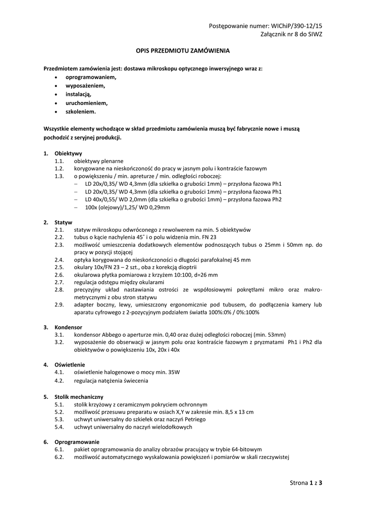 Postępowanie numer: WIChiP/390-12/15 Załącznik nr 8 do SIWZ OPIS PRZEDMIOTU ZAMÓWIENIA Przedmiotem zamówienia jest: dostawa mikroskopu optycznego inwersyjnego wraz z: oprogramowaniem, wyposażeniem, instalacją, uruchomieniem, szkoleniem. Wszystkie elementy wchodzące w skład przedmiotu zamówienia muszą być fabrycznie nowe i muszą pochodzić z seryjnej produkcji. 1. Obiektywy 1.1. obiektywy plenarne 1.2. korygowane na nieskończoność do pracy w jasnym polu i kontraście fazowym 1.3. o powiększeniu / min. apreturze / min. odległości roboczej: LD 20x/0,35/ WD 4,3mm (dla szkiełka o grubości 1mm) – przysłona fazowa Ph1 LD 20x/0,35/ WD 4,3mm (dla szkiełka o grubości 1mm) – przysłona fazowa Ph1 LD 40x/0,55/ WD 2,0mm (dla szkiełka o grubości 1mm) – przysłona fazowa Ph2 100x (olejowy)/1,25/ WD 0,29mm 2. Statyw 2.1. statyw mikroskopu odwróconego z rewolwerem na min. 5 obiektywów 2.2. tubus o kącie nachylenia 45˚ i o polu widzenia min. FN 23 2.3. możliwość umieszczenia dodatkowych elementów podnoszących tubus o 25mm i 50mm np. do pracy w pozycji stojącej 2.4. optyka korygowana do nieskończoności o długości parafokalnej 45 mm 2.5. okulary 10x/FN 23 – 2 szt., oba z korekcją dioptrii 2.6. okularowa płytka pomiarowa z krzyżem 10:100, d=26 mm 2.7. regulacja odstępu między okularami 2.8. precyzyjny układ nastawiania ostrości ze współosiowymi pokrętłami mikro oraz makrometrycznymi z obu stron statywu 2.9. adapter boczny, lewy, umieszczony ergonomicznie pod tubusem, do podłączenia kamery lub aparatu cyfrowego z 2-pozycyjnym podziałem światła 100%:0% / 0%:100% 3. Kondensor 3.1. kondensor Abbego o aperturze min. 0,40 oraz dużej odległości roboczej (min. 53mm) 3.2. wyposażenie do obserwacji w jasnym polu oraz kontraście fazowym z pryzmatami Ph1 i Ph2 dla obiektywów o powiększeniu 10x, 20x i 40x 4. Oświetlenie 4.1. oświetlenie halogenowe o mocy min. 35W 4.2. regulacja natężenia świecenia 5. Stolik mechaniczny 5.1. stolik krzyżowy z ceramicznym pokryciem ochronnym 5.2. możliwość przesuwu preparatu w osiach X,Y w zakresie min. 8,5 x 13 cm 5.3. uchwyt uniwersalny do szkiełek oraz naczyń Petriego 5.4. uchwyt uniwersalny do naczyń wielodołkowych 6. Oprogramowanie 6.1. pakiet oprogramowania do analizy obrazów pracujący w trybie 64-bitowym 6.2. możliwość automatycznego wyskalowania powiększeń i pomiarów w skali rzeczywistej Strona 1 z 3 Postępowanie numer: WIChiP/390-12/15 Załącznik nr 8 do SIWZ 6.3. 6.4. 6.5. 6.6. funkcje poprawy kontrastu, jasności, korekcja gamma, balans bieli, wygaszanie tła, funkcja wygładzania/wyostrzania import oraz eksport obrazów w standardowych rozszerzeniach opis obrazów: tekst, strzałki, wskaźniki, skala pomiarowa funkcje pomiarowe: pomiar długości, obwodu, powierzchni 7. Komputer 7.1. klasy PC zapewniający pełną kontrolę pracy całego układu łącznie z poborem He z butli zgodny z wymaganiami oprogramowania sterującego 7.2. wyposażony w odpowiedni rodzaj i liczbę interfejsów i kabli do obsługi układu, 7.3. wyposażony w procesor zapewniający osiągnięcie w teście wydajności Passmark CPU Mark (wynik dostępny: http://www.cpubenchmark.net/cpu_list.php) wynik co najmniej 6000 punktów Passmark CPU Mark 7.4. wyposażony ponadto w kartę sieciową przewodową, kartę sieciową bezprzewodową, złącze USB 3 na przednim panelu, dysk twardy o pojemności przynajmniej 1 TB, pamięć operacyjną o pojemności 8 GB 7.5. w obudowie typu minitower lub mikrotower, 7.6. wyposażony w system operacyjny Microsoft Windows w wersji 7 lub 8 w wersji 64-bit, 7.7. z urządzeniami peryferyjnymi: - monitorem LCD o przekątnej z zakresu 21" - 24" - przewodową, niskoprofilowaną, pełnowymiarową klawiaturą z wbudowaną podpórką pod nadgarstki, z regulowanymi nóżkami, charakteryzującą się niskim skokiem klawiszy - przewodową myszą optyczną z rolką, o rozdzielczości nie mniejszej niż 1000 dpi Komputer powinien posiadać zainstalowane i aktualne oprogramowanie i system operacyjny 8. Kamera 8.1. kolorowa kamera cyfrowa ze standardowym gwintem typu C 8.2. efektywna liczba pikseli: min. 5 milionów pikseli (2560 x 1920 pikseli) 8.3. przetwornik obrazu typu CMOS, wielkość przetwornika min. 0,4 cala (5,7 mm x 4,28 mm) 8.4. wielkość piksela min. 2,2 x 2,2 µm 8.5. głębia kolorów min. 3 x 8 bitów/piksel 8.6. czasy ekspozycji regulowane w zakresie min.: 100 μs - 2 s 8.7. wbudowane złącze USB 3.0 8.8. prędkość rejestracji przy pełnej rozdzielczości min. 15 ramek/s 8.9. adapter do połączenia mikroskopu z kamerą z optyką 0,5x 8.10. adapter, mikroskop, oprogramowanie oraz kamera muszą pochodzić od jednego producenta 9. Mikromanipulatory 9.1. dwa mikromanipulatory mechaniczne z precyzyjnymi śrubami przesuwu w 3 osiach 9.2. minimalny zakres przesuwu w osiach X: 37 mm, Y: 20 mm, Z: 25 mm 9.3. dodatkowy przesuw w osiach X,Y za pomocą manualnego dżojstika w zakresie 0,35 - 4,0 mm 9.4. zgrubny i dokładne ustawienie osi Z z przełożeniem 1:10 9.5. możliwość pochylania w zakresie 0-90˚ Do oferty należy dołączyć karty katalogowe, specyfikacyjne lub inną dokumentację parametrów technicznych producenta potwierdzające podane parametry w oryginale (Zamawiający dopuszcza dokumentację w języku angielskim). 10. Aparatura powinna być kompletna tak, by po zmontowaniu i instalacji była gotowa do użycia zgodnie z jej przeznaczeniem bez potrzeby dodatkowych zakupów. 11. Uruchomienie urządzenia oraz przeszkolenie 2 pracowników Zamawiającego w jego siedzibie zrealizowane przez podmiot uprawniony przez producenta urządzenia lub jego dystrybutora. Strona 2 z 3 Postępowanie numer: WIChiP/390-12/15 Załącznik nr 8 do SIWZ 12. Warunki gwarancji i serwisu gwarancyjnego i pogwarancyjnego 12.1. Wykonawca udzieli dla przedmiotu zamówienia gwarancji na okres co najmniej 12 miesięcy. 12.2. Techniczny serwis gwarancyjny winien być prowadzony przez serwis autoryzowany przez pr