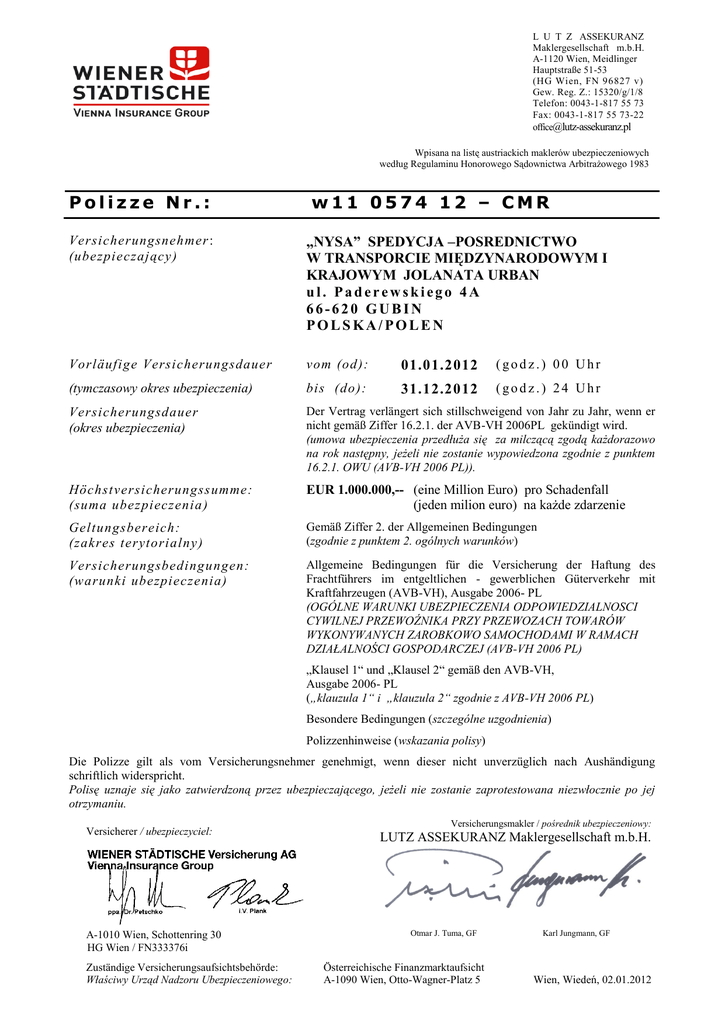 L U T Z ASSEKURANZ Maklergesellschaft m.b.H. A-1120 Wien, Meidlinger Hauptstraße 51-53 (HG Wien, FN 96827 v) Gew. Reg. Z.: 15320/g/1/8 Telefon: 0043-1-817 55 73 Fax: 0043-1-817 55 73-22 [email protected] Wpisana na listę austriackich maklerów ubezpieczeniowych według Regulaminu Honorowego Sądownictwa Arbitrażowego 1983 Polizze Nr.: w11 0574 12 – CMR Versicherungsnehmer : (ubezpieczający) „NYSA” SPEDYCJA –POSREDNICTWO W TRANSPORCIE MIĘDZYNARODOWYM I KRAJOWYM JOLANATA URBAN ul. Paderewskiego 4A 66-620 GUBIN POLSKA/POLEN Vorläufige Versicherungsdauer vom (od): 01.01.2012 (godz.) 00 Uhr (tymczasowy okres ubezpieczenia) bis (do): 31.12.2012 (godz.) 24 Uhr Versicherungsdauer (okres ubezpieczenia) Der Vertrag verlängert sich stillschweigend von Jahr zu Jahr, wenn er nicht gemäß Ziffer 16.2.1. der AVB-VH 2006PL gekündigt wird. (umowa ubezpieczenia przedłuża się za milczącą zgodą każdorazowo na rok następny, jeżeli nie zostanie wypowiedzona zgodnie z punktem 16.2.1. OWU (AVB-VH 2006 PL)). Höchstversicherungssumme: (suma ubezpieczenia ) EUR 1.000.000,-- (eine Million Euro) pro Schadenfall (jeden milion euro) na każde zdarzenie Geltungsbereich: (zakres terytorialny) Gemäß Ziffer 2. der Allgemeinen Bedingungen (zgodnie z punktem 2. ogólnych warunków) Versicherungsbedingungen: (warunki ubezpieczenia) Allgemeine Bedingungen für die Versicherung der Haftung des Frachtführers im entgeltlichen - gewerblichen Güterverkehr mit Kraftfahrzeugen (AVB-VH), Ausgabe 2006- PL (OGÓLNE WARUNKI UBEZPIECZENIA ODPOWIEDZIALNOSCI CYWILNEJ PRZEWOŹNIKA PRZY PRZEWOZACH TOWARÓW WYKONYWANYCH ZAROBKOWO SAMOCHODAMI W RAMACH DZIAŁALNOŚCI GOSPODARCZEJ (AVB-VH 2006 PL) „Klausel 1“ und „Klausel 2“ gemäß den AVB-VH, Ausgabe 2006- PL („klauzula 1“ i „klauzula 2“ zgodnie z AVB-VH 2006 PL) Besondere Bedingungen (szczególne uzgodnienia) Polizzenhinweise (wskazania polisy) Die Polizze gilt als vom Versicherungsnehmer genehmigt, wenn dieser nicht unverzüglich nach Aushändigung schriftlich widerspricht. Polisę uznaje się jako zatwierdzoną przez ubezpieczającego, jeżeli nie zostanie zaprotestowana niezwłocznie po jej otrzymaniu. Versicherer / ubezpieczyciel: A-1010 Wien, Schottenring 30 HG Wien / FN333376i Zuständige Versicherungsaufsichtsbehörde: Właściwy Urząd Nadzoru Ubezpieczeniowego: Versicherungsmakler / pośrednik ubezpieczeniowy: LUTZ ASSEKURANZ Maklergesellschaft m.b.H. Otmar J. Tuma, GF Österreichische Finanzmarktaufsicht A-1090 Wien, Otto-Wagner-Platz 5 Karl Jungmann, GF Wien, Wiedeń, 02.01.2012