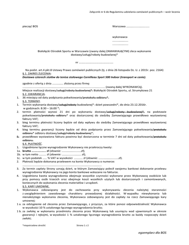 Załącznik nr 6 do Regulaminu udzielania zamówień publicznych – wzór lecenia pieczęć BOS Warszawa ............................. wykonawca .................... .................... Białołęcki Ośrodek Sportu w Warszawie (zwany dalej ZAMAWIAJĄCYM) zleca wykonanie dostawy/usługi/roboty budowlanej* nr ……………………………………….. Na podst. art.4 pkt.8 Ustawy Prawo zamówień publicznych (tj. z dnia 26 listopada Dz. U. z 2015r. poz. 2164) §.1. ZAKRES ZLECENIA: Dostawa czterech stołów do tenisa stołowego Cornilleau Sport 500 Indoor (transport w cenie). zgodnie z ofertą z dnia .............. złożoną przez firmę: ....................................................................................................... (zwaną dalej WYKONAWCĄ). Miejsce realizacji dostawy/usługi/roboty budowlanej*: Białołęcki Ośrodek Sportu, ul. Strumykowa 21 §.2. GWARANCJA. 1. 36 miesięcy od daty podpisania pokwitowania/protokołu odbioru*. §.3. TERMINY. 1. Termin wykonania dostawy/usługi/roboty budowlanej*: dzień powszedni*, do dnia 23.12.2016r. w godzinach: 8:30 – 16:00 *; 2. termin płatności wynosi 21 dni po wykonaniu dostawy/usługi/roboty budowlanej*, na podstawie pokwitowania/protokołu odbioru* oraz dostarczonej do siedziby Zamawiającego prawidłowo wystawionej faktury VAT; 3. bieg terminu płatności liczony będzie od daty wpływu do siedziby Zamawiającego prawidłowo wystawionej faktury VAT; 4. bieg terminu gwarancji liczony będzie od dnia podpisania przez Zamawiającego pokwitowania/protokołu odbioru* odbioru dostawy/usługi/roboty budowlanej*; 5. prawidłowo wystawiona faktura powinna być dostarczona w terminie 7 dni od daty pokwitowania/protokołu odbioru. §.4. PŁATNOŚĆ. 1. Uzgodnione łączne wynagrodzenie Wykonawcy nie przekroczy kwoty: 1a. brutto ................. zł (słownie: ........................zł); 1b. w tym netto ......... zł (słownie: ........................ zł); 1c. w tym podatek …… % VAT w wysokości ........... zł (słownie: .........................zł). 2. Płatność będzie dokonana przelewem na konto Wykonawcy o numerze: ................................................................................................... 3. Za termin zapłaty Strony uznają dzień, w którym Zamawiający polecił swojemu bankowi dokonanie przelewu wynagrodzenia Wykonawcy na jego konto bankowe wskazane na fakturze. 4. Uzgodniona kwota wynagrodzenia obejmuje wszystkie czynności wykonane przez Wykonawcę osobiście lub przy pomocy osób trzecich oraz obejmuje koszt wszelkich użytych lub dostarczonych i zamontowanych, koniecznych do wykonania zlecenia materiałów i urządzeń. §.5. KARY UMOWNE. 1. Wykonawca zobowiązany jest do zachowania przy wykonywaniu zlecenia należytej staranności z uwzględnieniem zawodowego charakteru prowadzonej działalności. W wypadku niewykonania lub nienależytego wykonania zlecenia, Wykonawca zobowiązany jest do zapłaty na rzecz Zamawiającego kary umownej: 1 a. za odstąpienie od zlecenia przez Zamawiającego, z przyczyn, za które ponosi odpowiedzialność Wykonawca w wysokości 10 % ustalonego łącznego wynagrodzenia brutto; 1 b. za zwłokę w wykonaniu przedmiotu zlecenia przez Wykonawcę lub usunięciu wad ujawnionych w okresie gwarancji i rękojmi, w wysokości 1 % ustalonego łącznego wynagrodzenia brutto za każdy rozpoczęty dzień zwłoki; *niepotrzebne skreślić Strona 1 z 2 egzemplarz dla BOS Załącznik nr 6 do Regulaminu udzielania zamówień publicznych – wzór lecenia 2. 3. 4. Zamawiający może wyznaczyć Wykonawcy termin na usunięcie wad, po upływie którego zostaną naliczone kary za zwłokę. Niezależnie od innych postanowień niniejszego paragrafu, Zamawiający ma prawo dochodzić od Wykonawcy odszkodowania przekraczającego wysokość zastrzeżonej kary umownej na zasadach ogólnych. Wykonawca wyraża zgodę na potrącenie kar umownych z należnego mu wynagrodzenia. §.6. DANE DO FAKTURY. Faktura będzie wystawiona na: NABYWCA: Miasto Stołeczne Warszawa Pl. Bankowy 3/5, 00-950 Warszawa, NIP: 5252248481 PŁATNIK/ODBIORCA: Białołęcki Ośrodek Sportu, ul. Światowida 56, 03 -144 Warszawa §.7. POSTANOWIENIA KOŃCOWE. „wersja dla osoby fizycznej nieprowadzącej działalności gospodarczej oraz dla osoby fizycznej prowadzącej działalność gospodarczą” 1. 2. 3. 4. Wykonawca oświadcza, że znany jest mu fakt, iż treść niniejszej umowy, a w szczególności przedmiot umowy i wysokość wynagrodzenia, stanowią informację publiczną w rozumieniu art. 1 ust. 1 ustawy z dnia 6 września 2001 r. o dostępie do informacji publicznej (Dz. U. z 2014 r. poz.782), która podlega udostępnieniu w trybie przedmiotowej ustawy, z zastrzeżeniem ust. 2. Wykonawca wyraża zgodę na udostępnienie w trybie ustawy, o której mowa w ust. 1, zawartych w niniejszej umowie dotyczących go danych osobowych w zakresie obejmującym imię i nazwisko, a w przypadku prowadzenia działalności gospodarczej – również w zakresie nazwy firmy. Ewentualne spory wynikające z niniejszego zlecenia będą rozstrzygane przez sąd powszechny właściwy miejscowo dla siedziby Zamawiającego. Zlecenie zostało sporządzone w dwóch jednobrzmiących egzemplarzach, po jednym dla Zamawiającego i Wykonawcy. „wersja dla przedsiębiorcy innego niż osoba fizyczna prowadząca działalność gospodarczą” 1. 2. 3. Wykonawca oświadcza, że znany jest mu fakt, iż treść niniejszej umowy, a w szczególności dotyczące go dane identyfikujące, przedmiot umowy i wysokość wynagrodzenia, stanowią informację publiczną w rozmówieniu art.1 ust 1 ustawy z dnia 6 września 2001 r. o dostępie do informacji publicznej (Dz. U. z 2014 r. poz.782), która podlega udostępnieniu w trybie przedmiotowej ustawy. Ewentualne spory wynikające z niniejszego zlecenia będą rozstrzygane przez sąd powszechny właściwy miejscowo dla siedziby Zamawiającego. Zlecenie zostało sporządzone w dwóch jednobrzmi